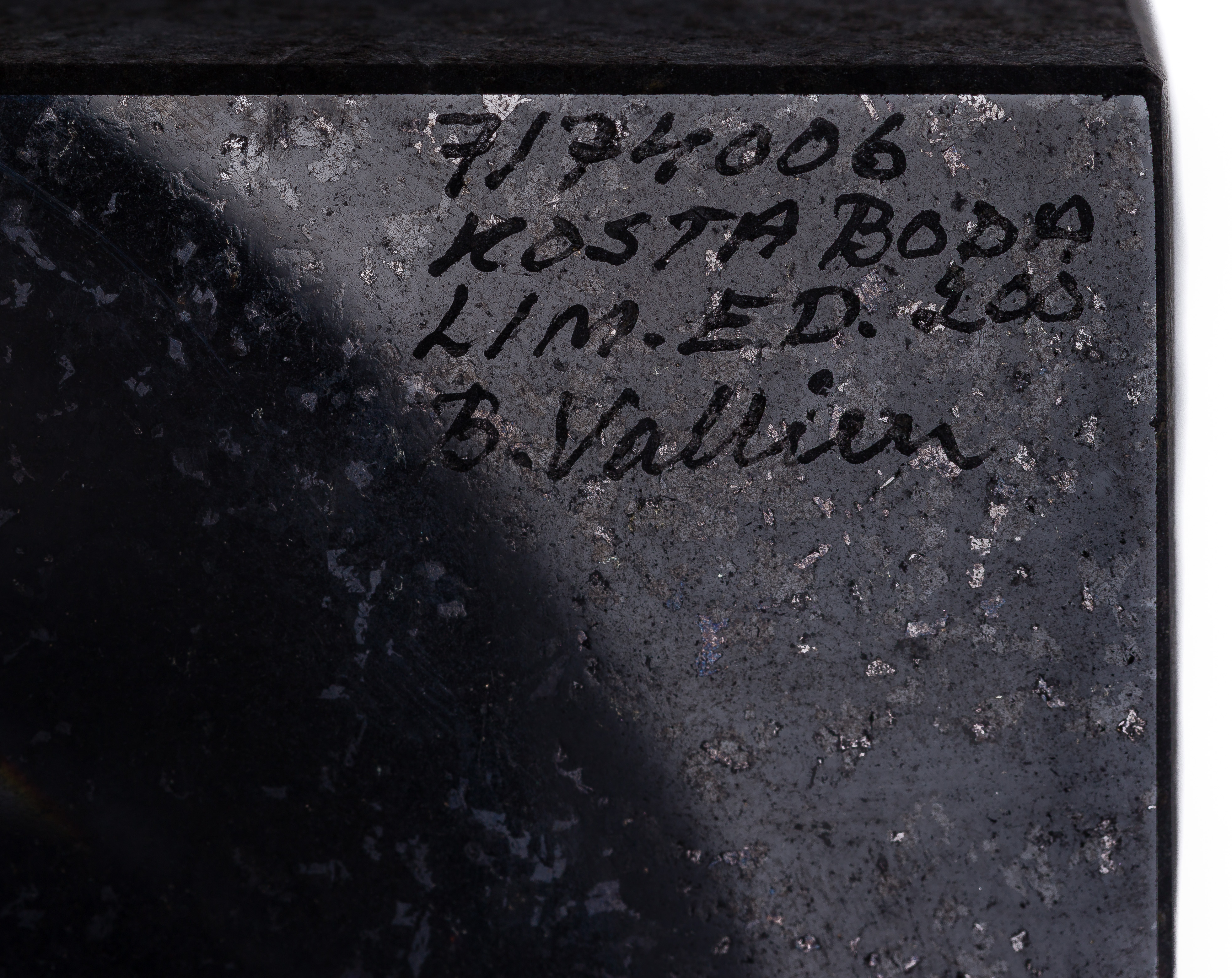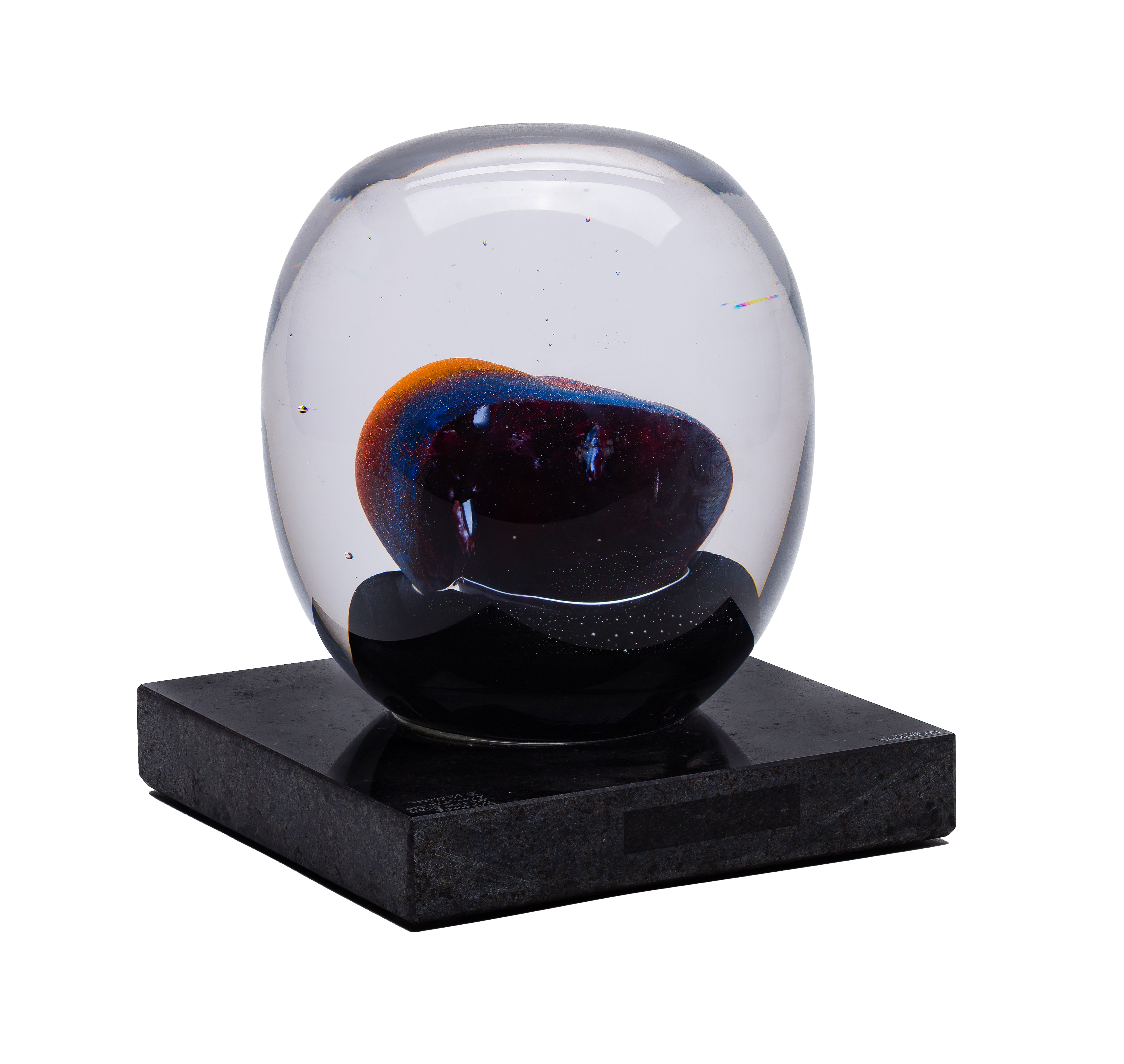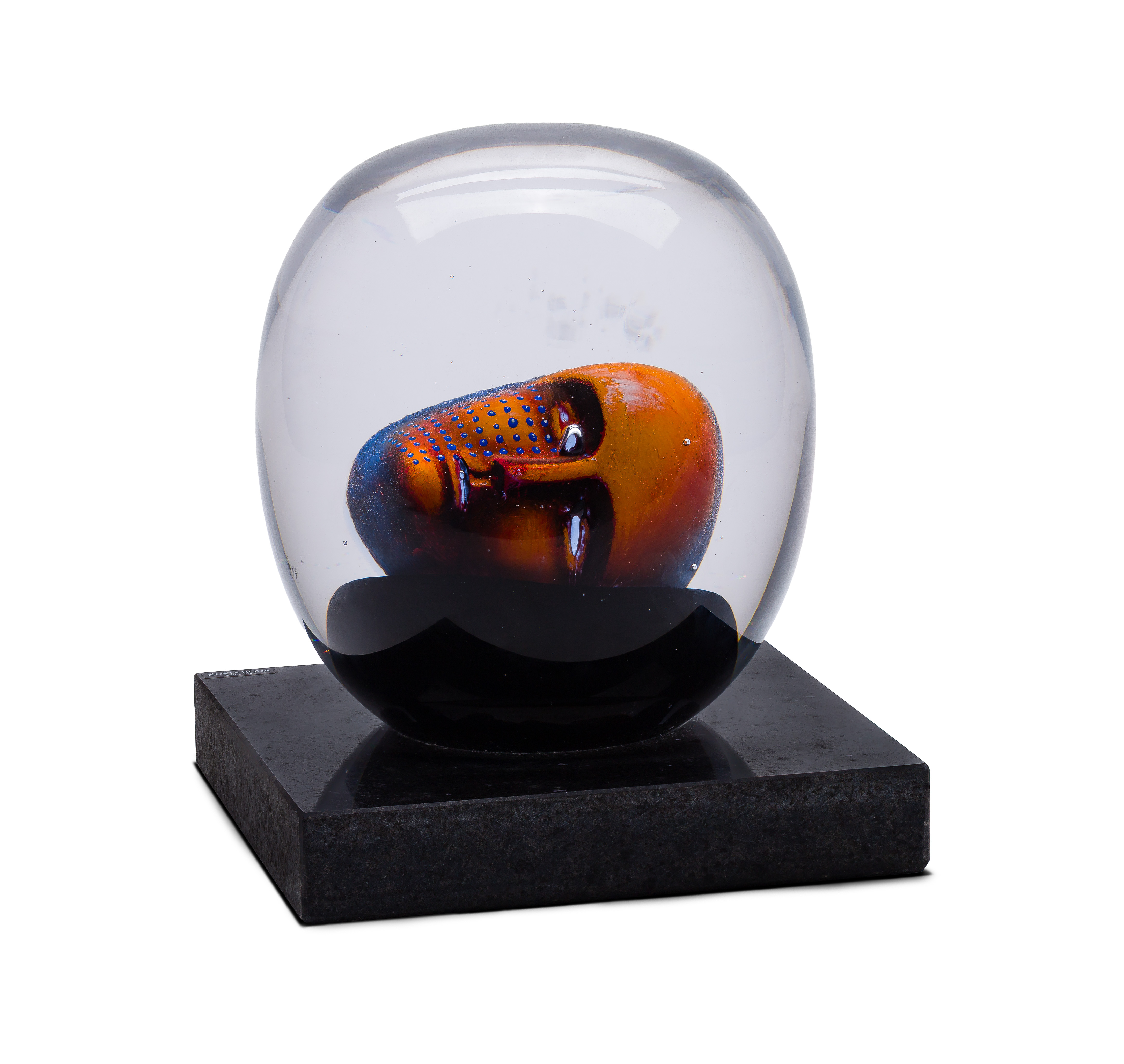 Undated, engraved signature, #7174006, Kosta Boda sticker, resting head encased in clear glass on a stone base, limited edition of 200