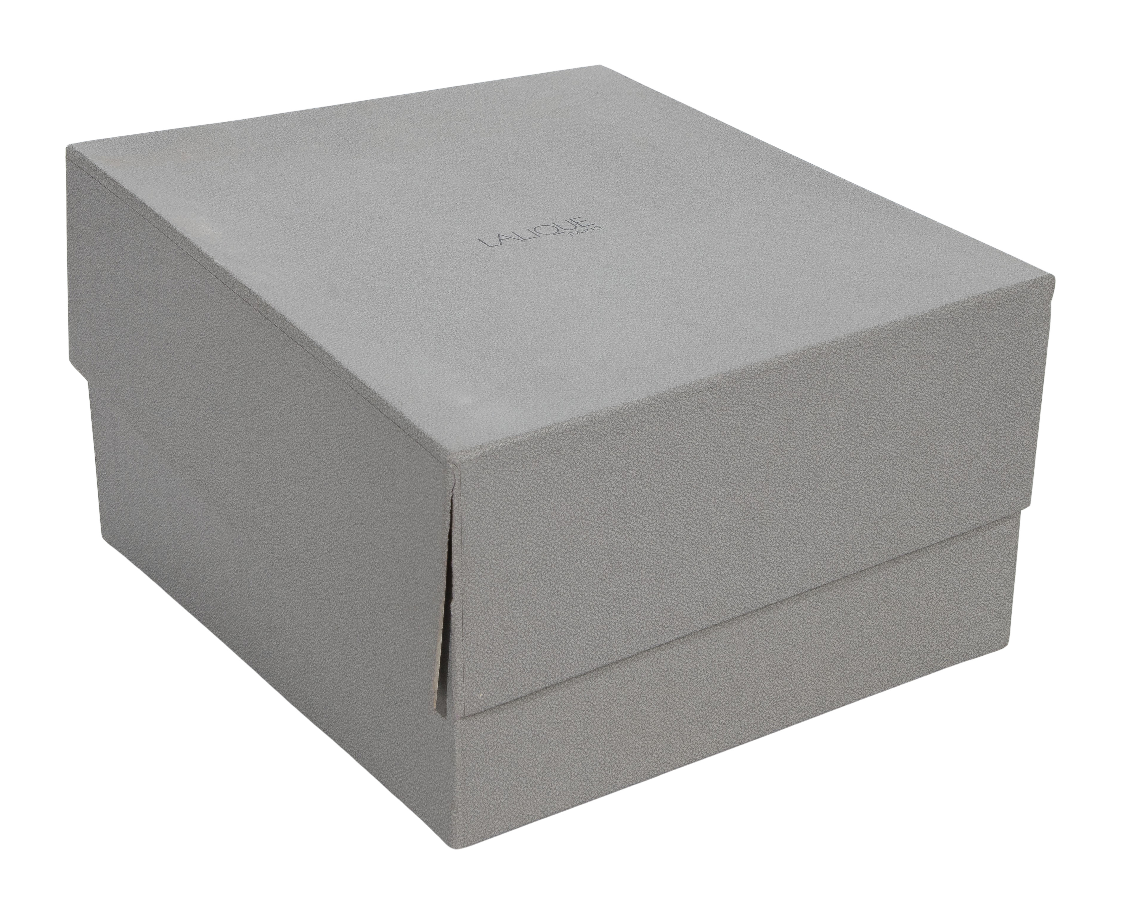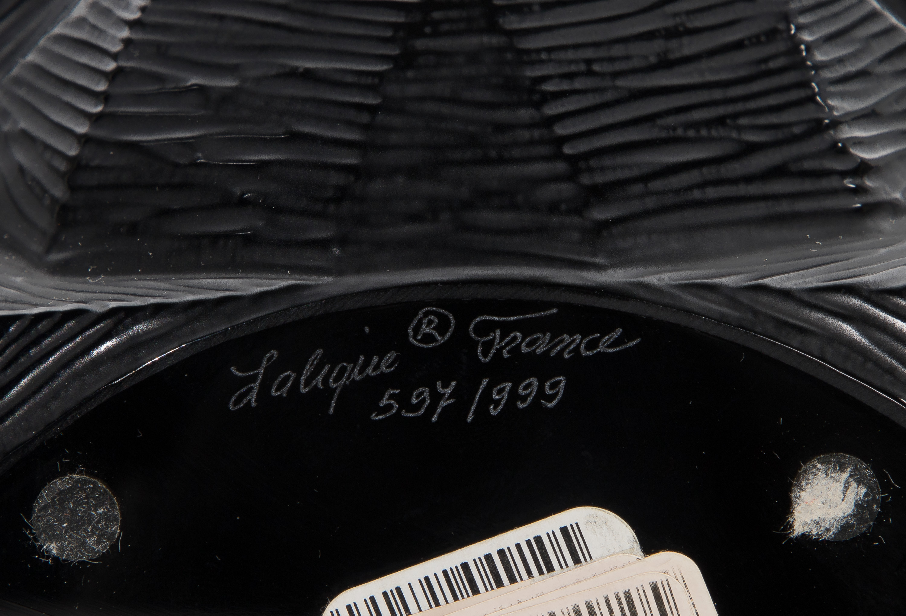 Having engraved maker mark and #597/999 underside, cast black glass, retaining Lalique numbered COA and crystal care booklet, includes box