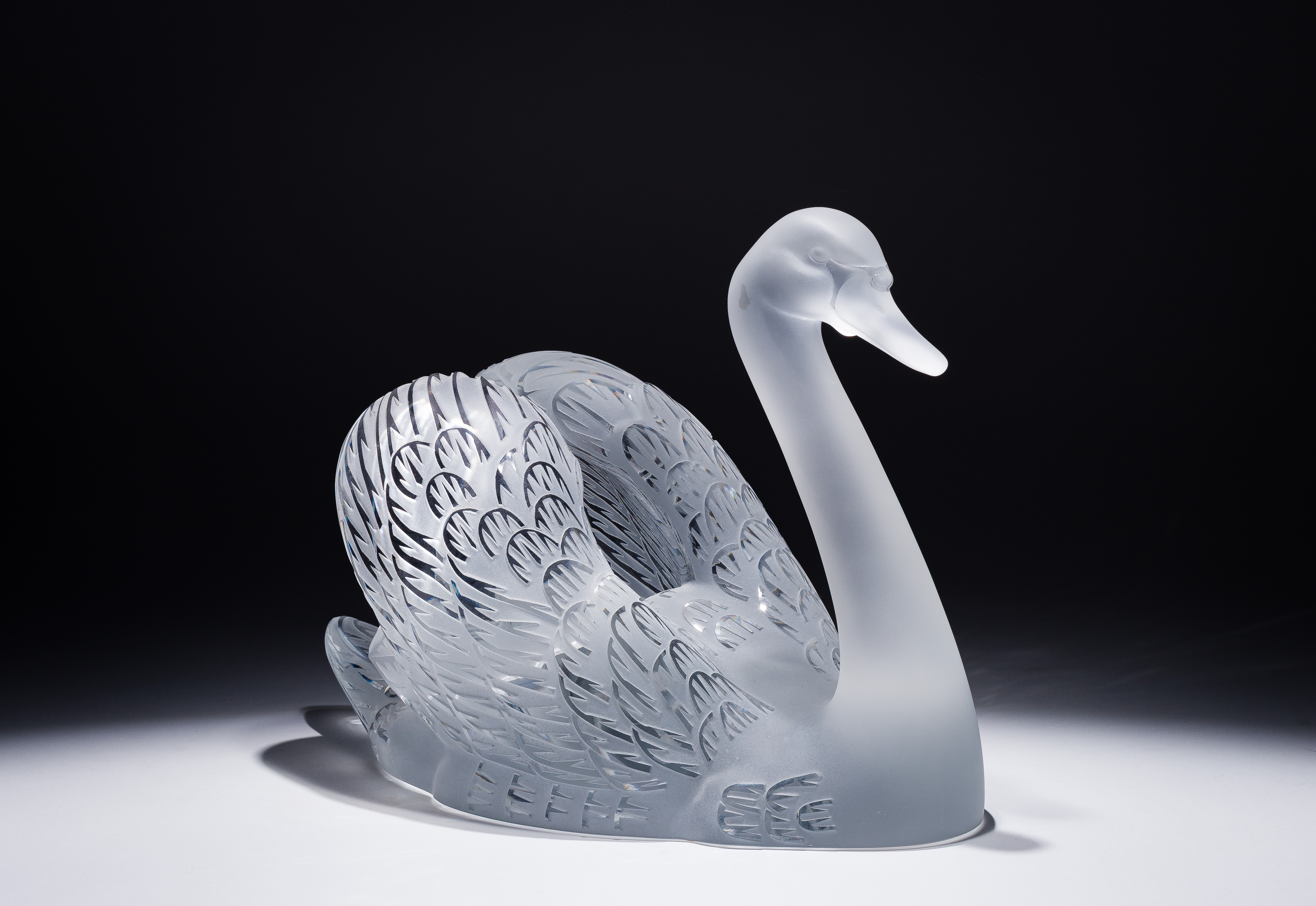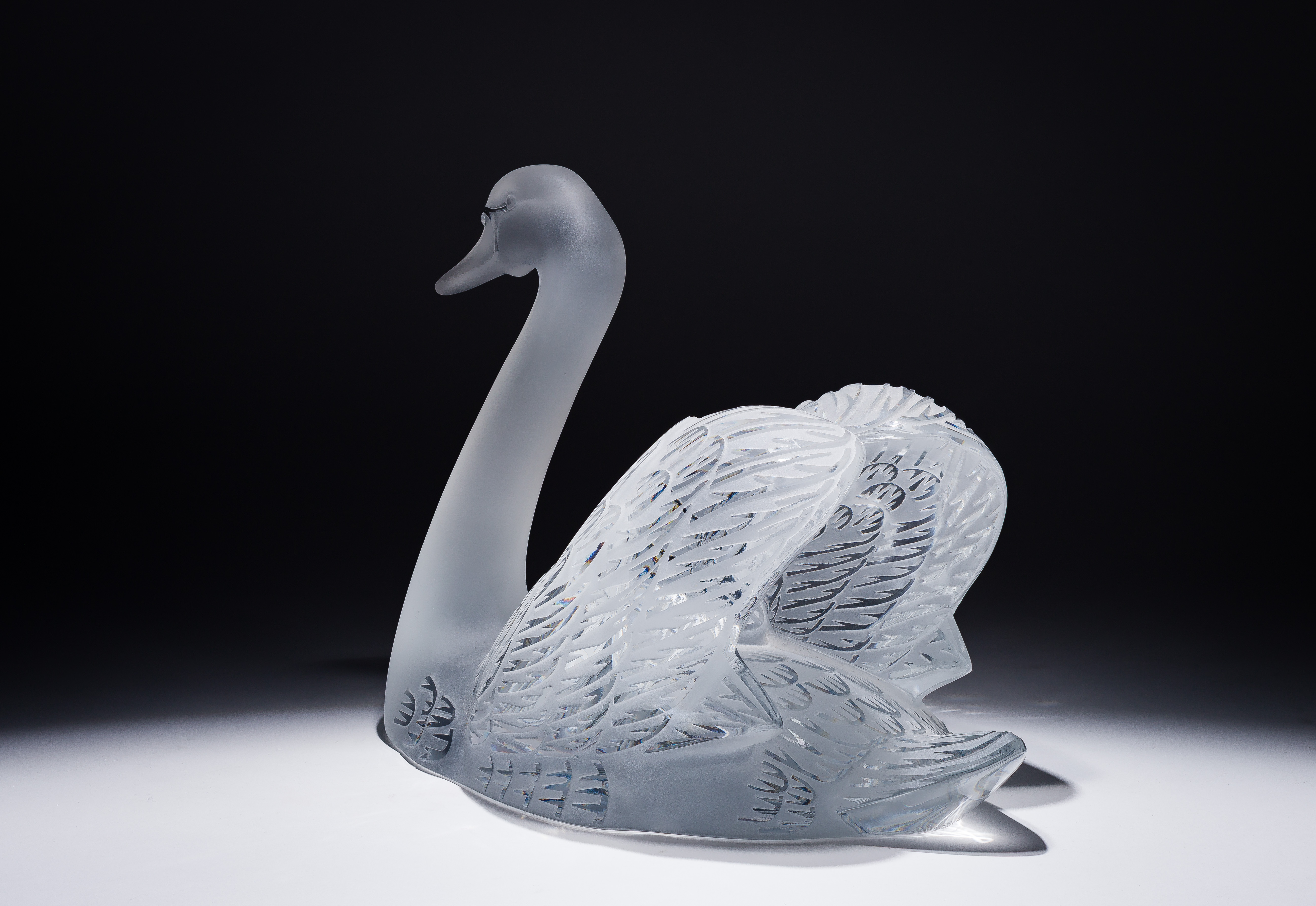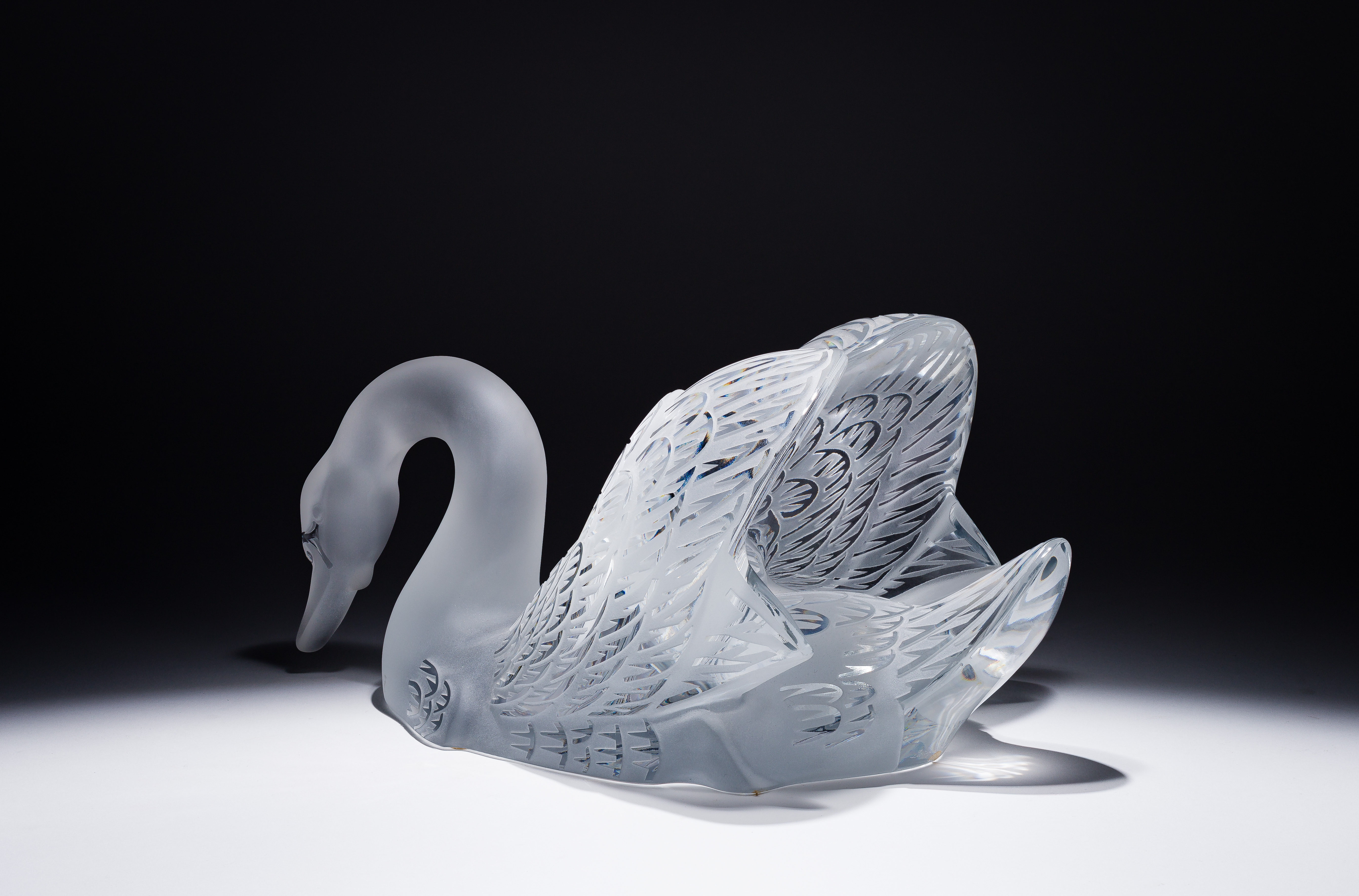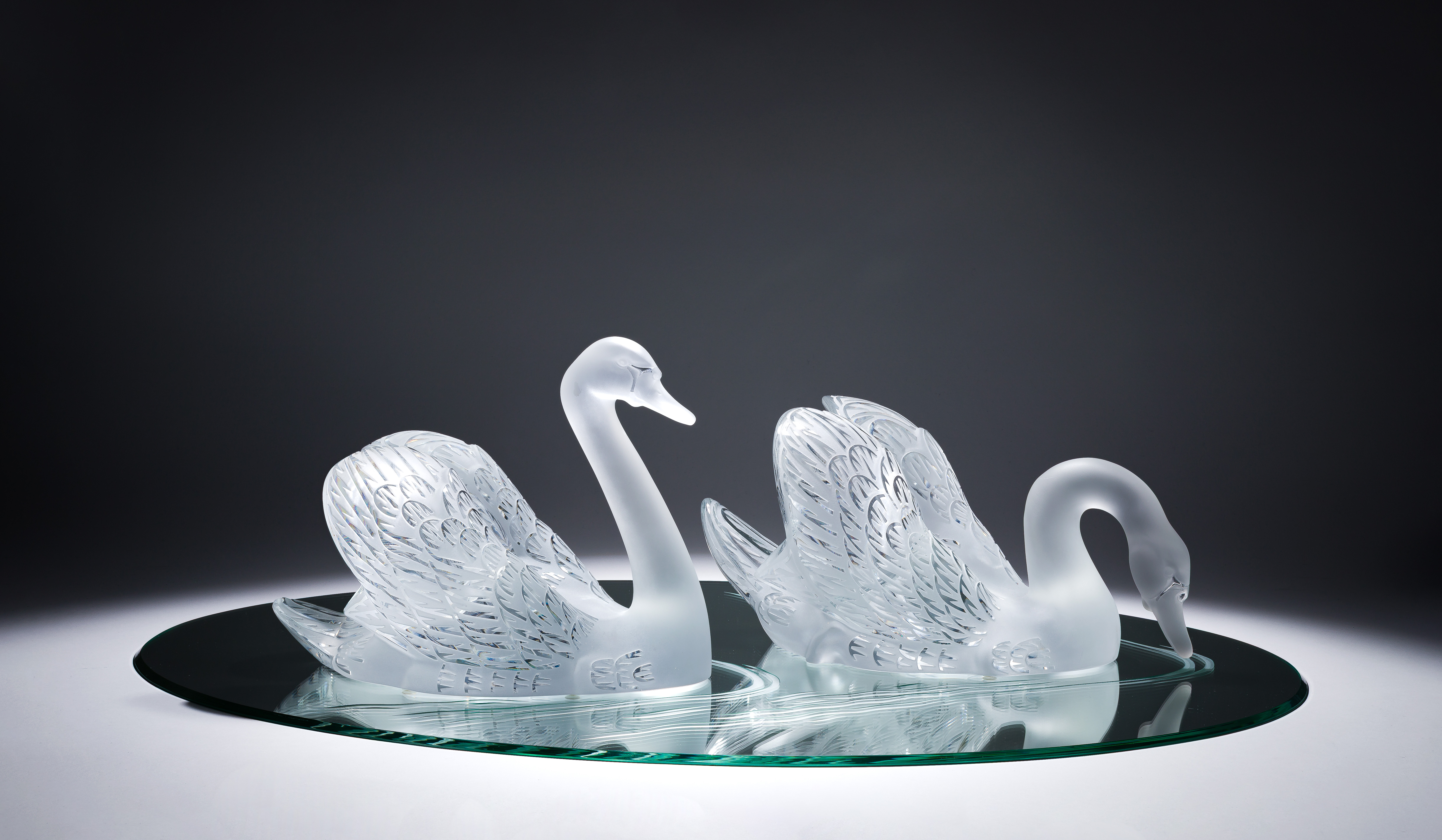 3-piece set, including (2) frosted swans having polished to clear feather pattern, both having engraved marks and the 33 x 22.5-inch oval beveled mirror plateau having deeply etched wake pattern