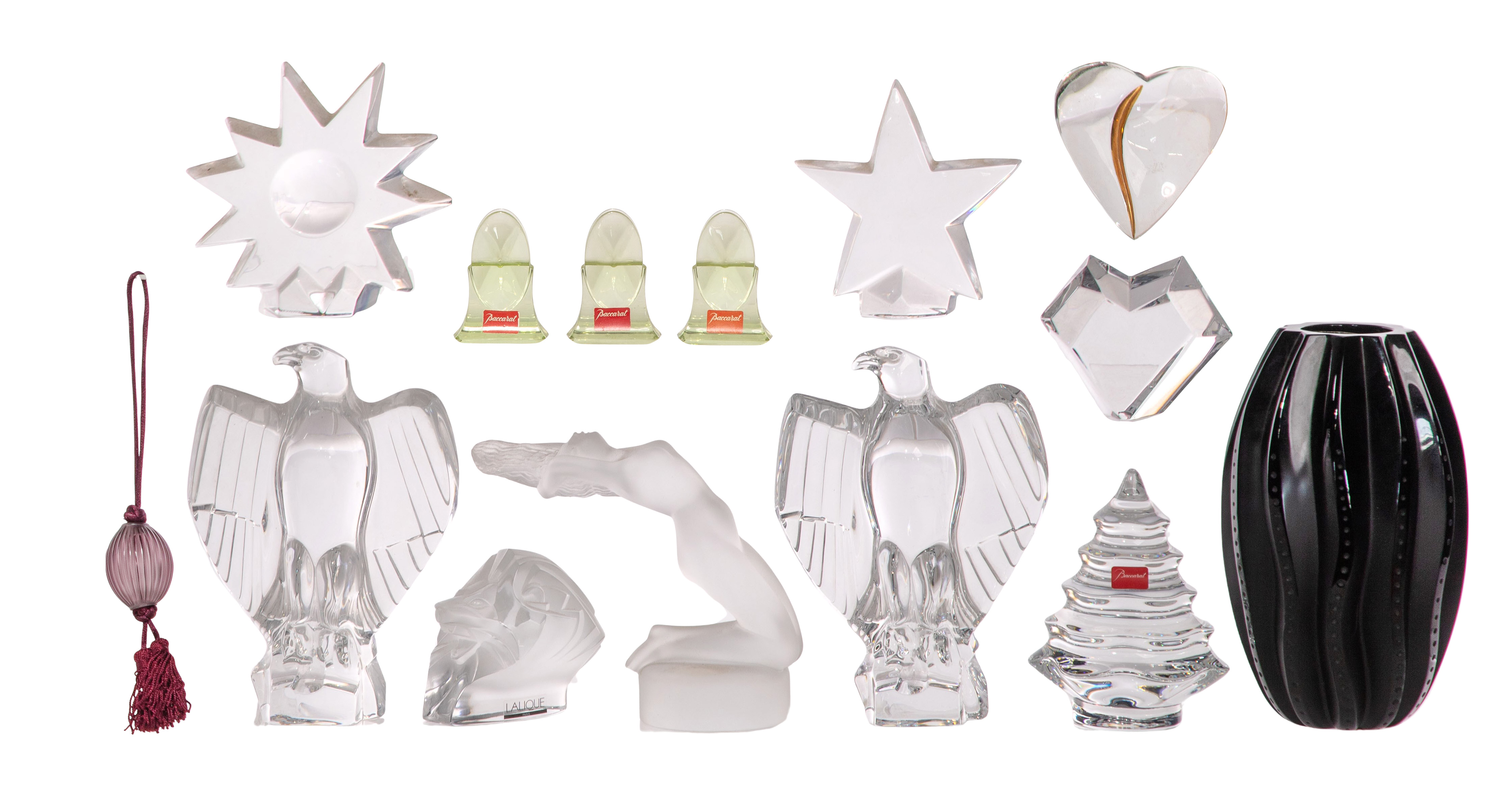 (14) total items including Baccarat pair of eagle figurines, a pine tree including original box, a sun, a star, (2) heart themed paperweights, (3) place card holders and a Lalique limited edition Medusa vase #734/999 on underside, a Chrysis figurine and a Tete de Lion paperweight; together with a glass ornament