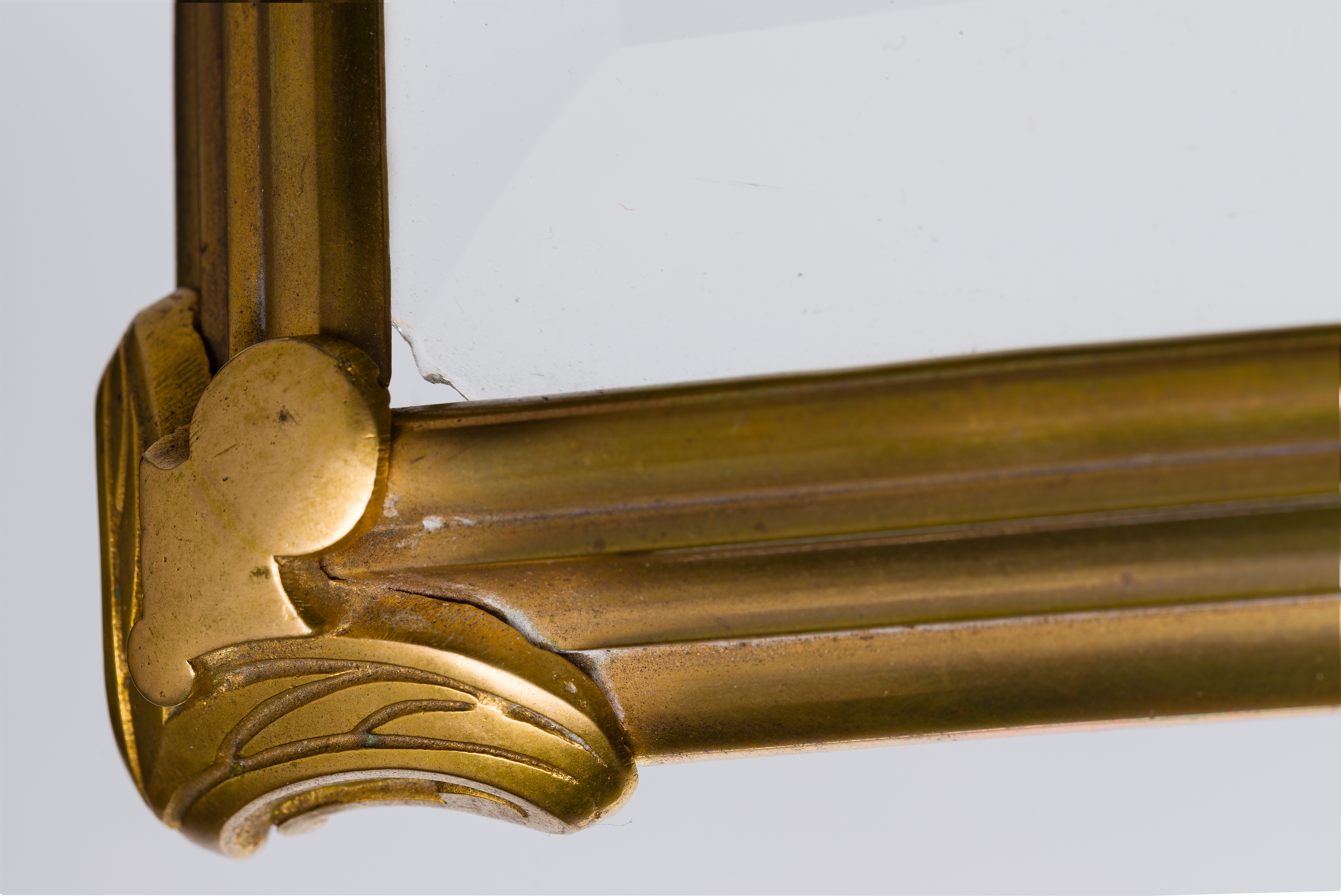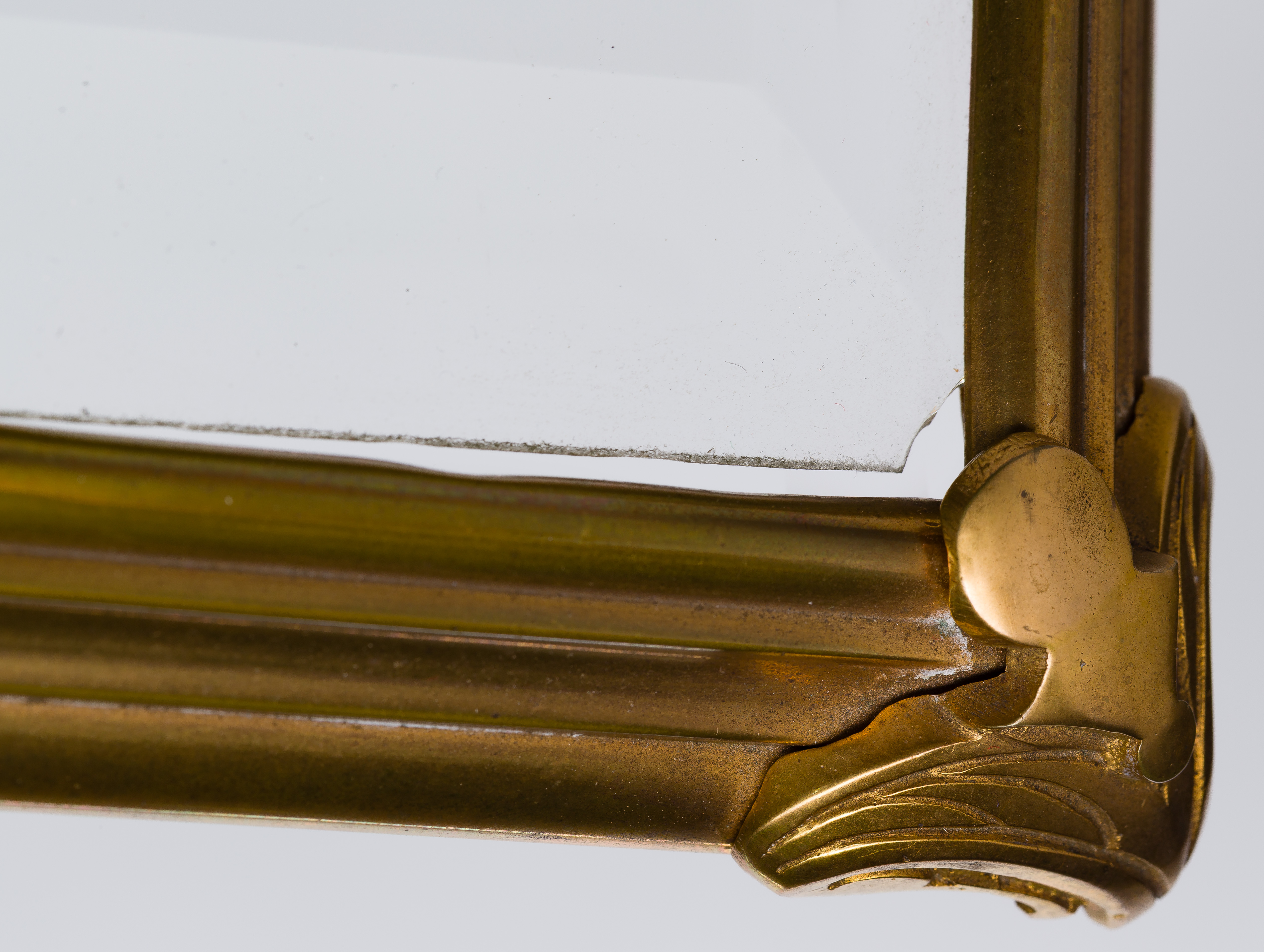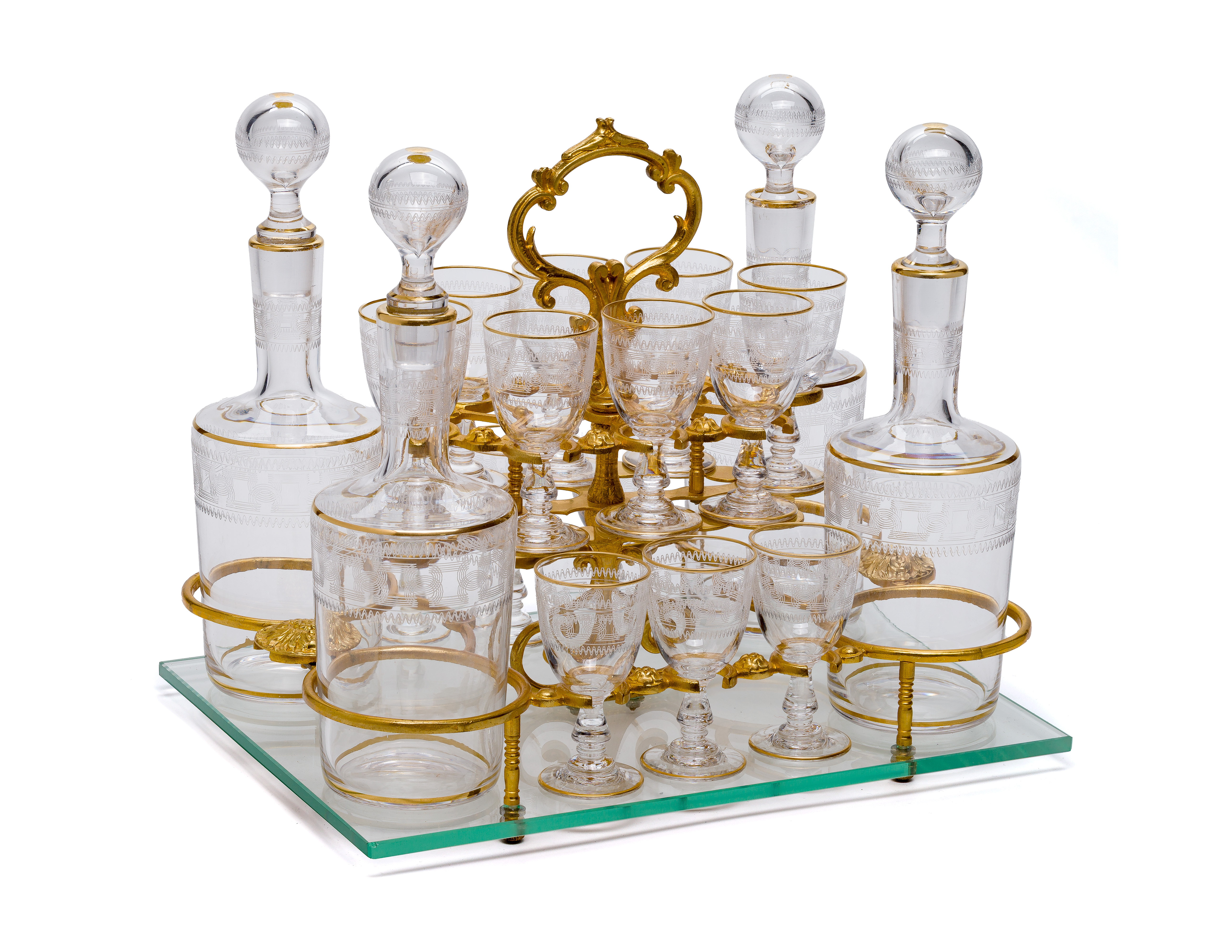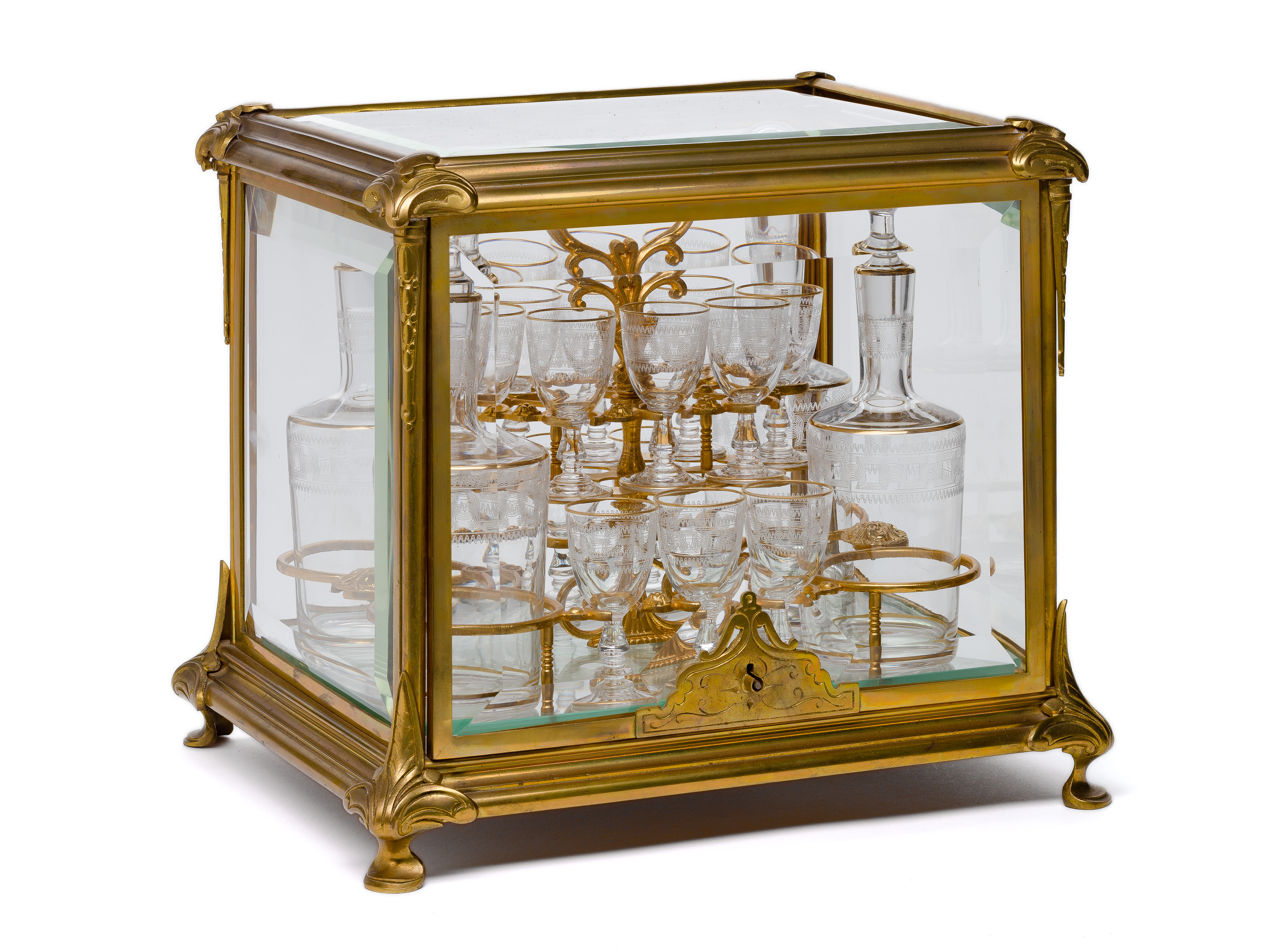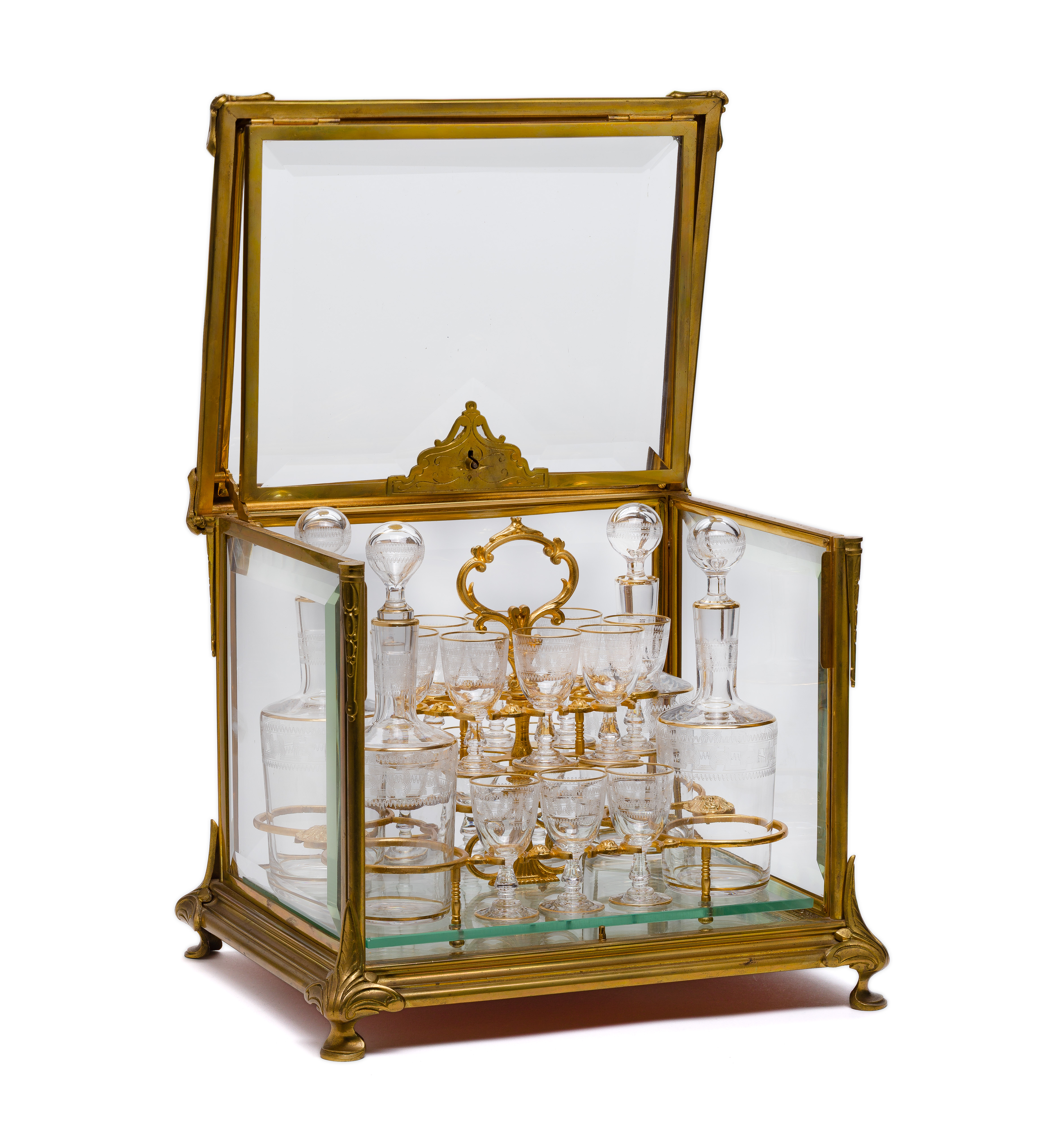 Unmarked, an ormolu and beveled glass panel case having a locking ‘up and over’ lid (key present) enclosing a Baroque style gilt bronze frame containing sixteen small gilt-rimmed glasses and four decanters with stoppers, all having etched decoration, accompanied by 1976 invoices from Pink Pony Gift Shop, Boca Raton, Florida
