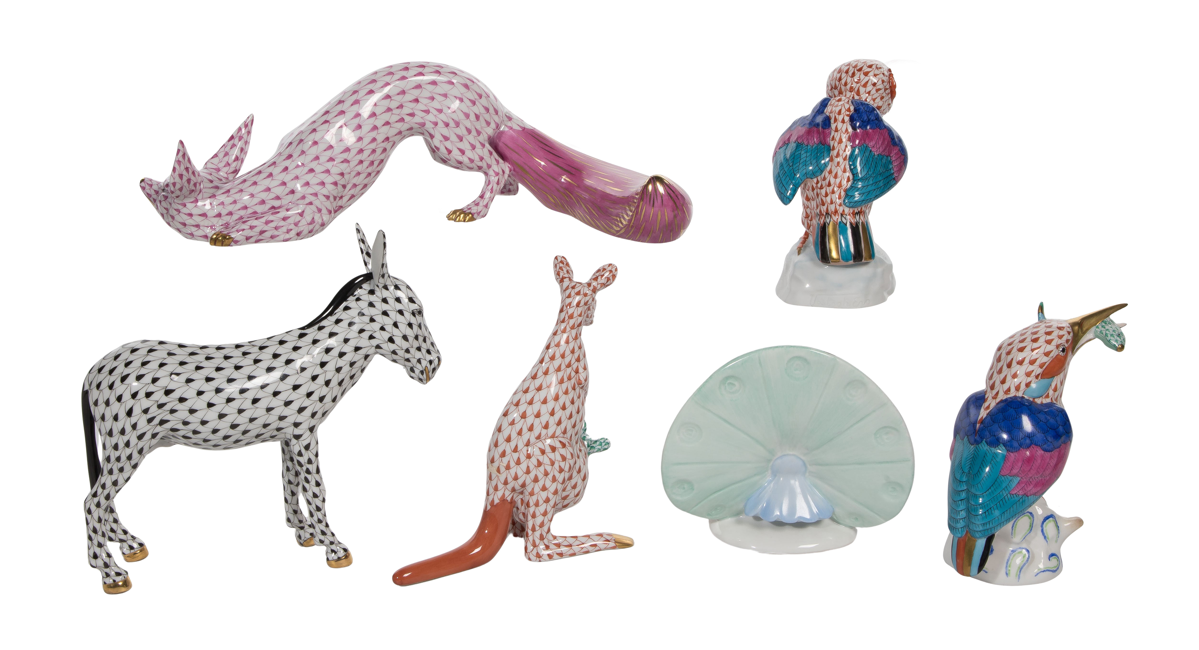 (6) items including a #5074 peacock, a #5168 kingfisher with fish, a #15328 kangaroo, a #15354 fox, a #15502 donkey and an unnumbered owl, all having maker mark to the underside
