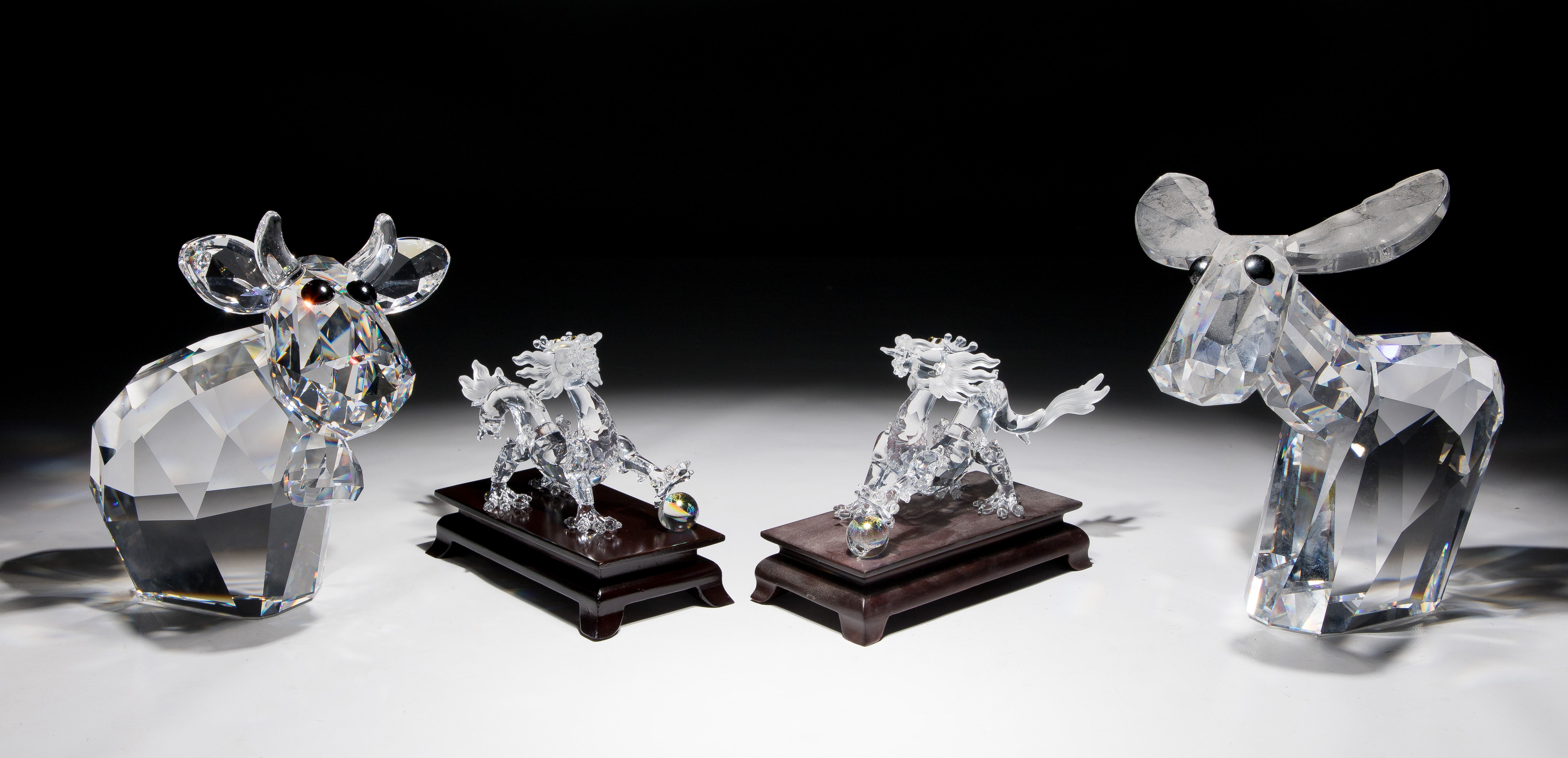 (4) items including a Missy Mo cow and a moose by Ricci, designed by Edith Mair as well as (2) Chinese style dragons having crystal ‘pearls’ and wood bases, all but moose having original boxes