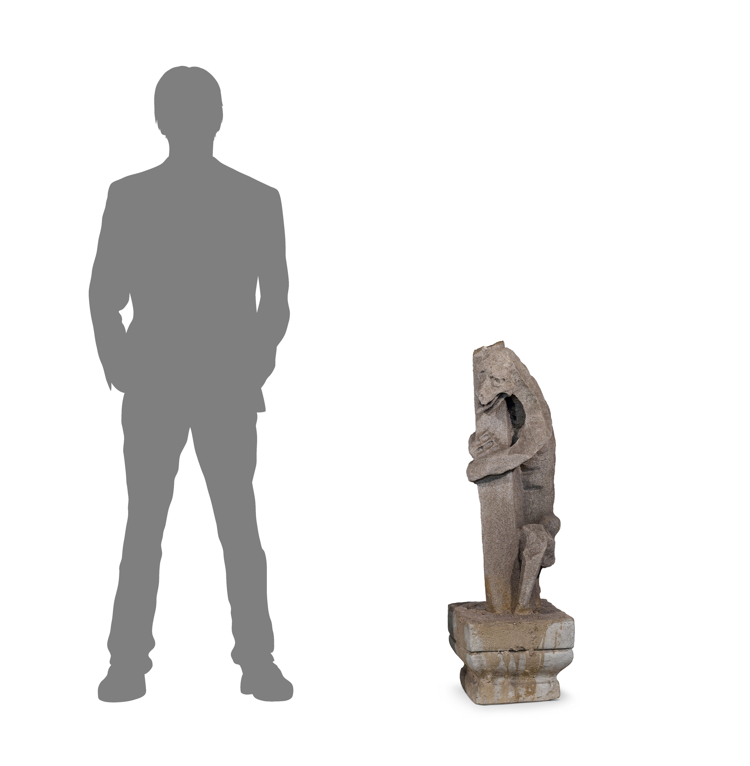 A concrete depiction of a snarling feline-form creature clinging to an obelisk, on a shaped block base