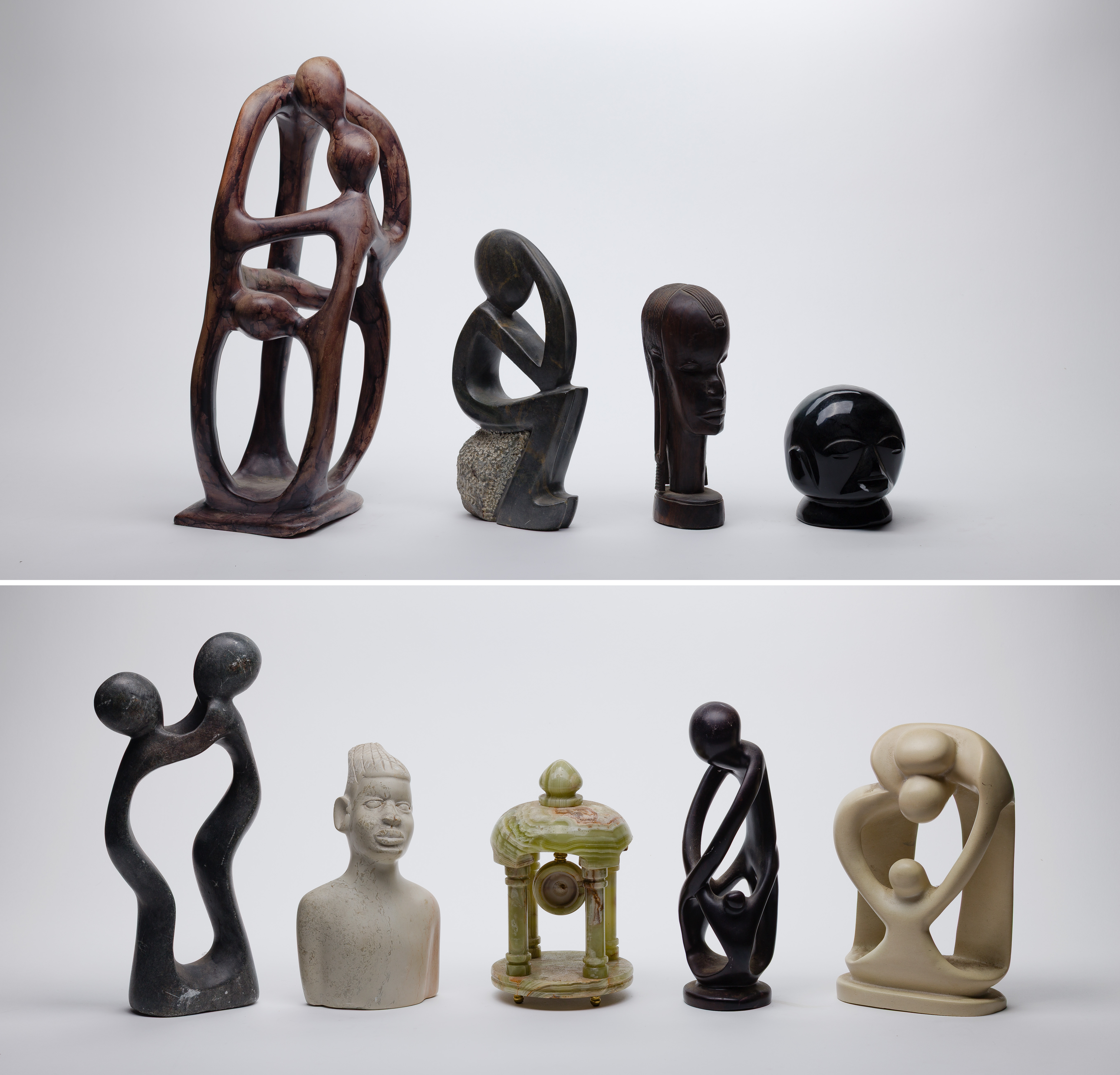 (9) total items including (8) figural carvings of various colors and forms; together with a Neoclassical style Mexican onyx clock case