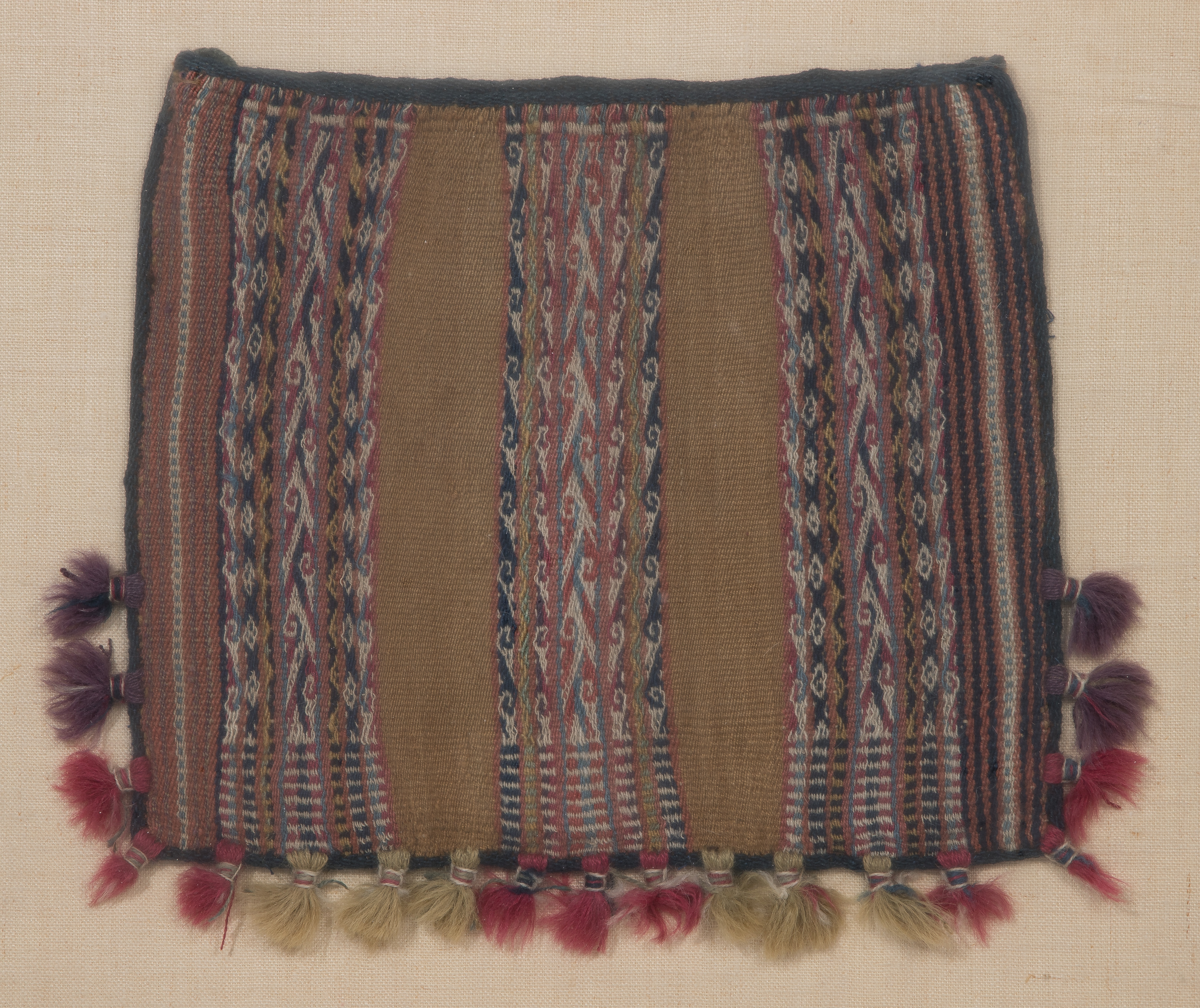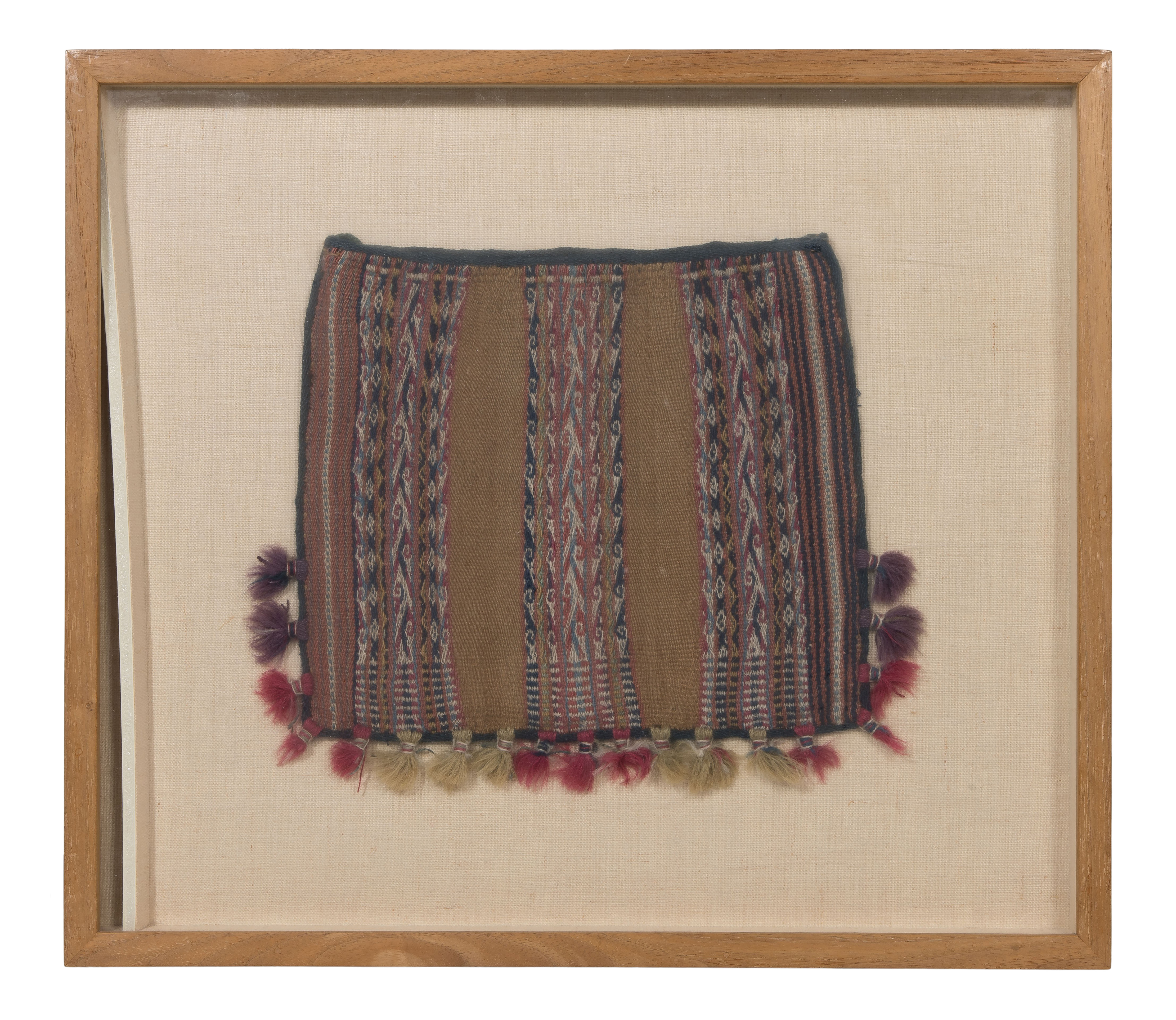 Tapestry bag having geometric bands and tufts of bundled fringe along lower edge, float mounted behind acrylic in a wood frame