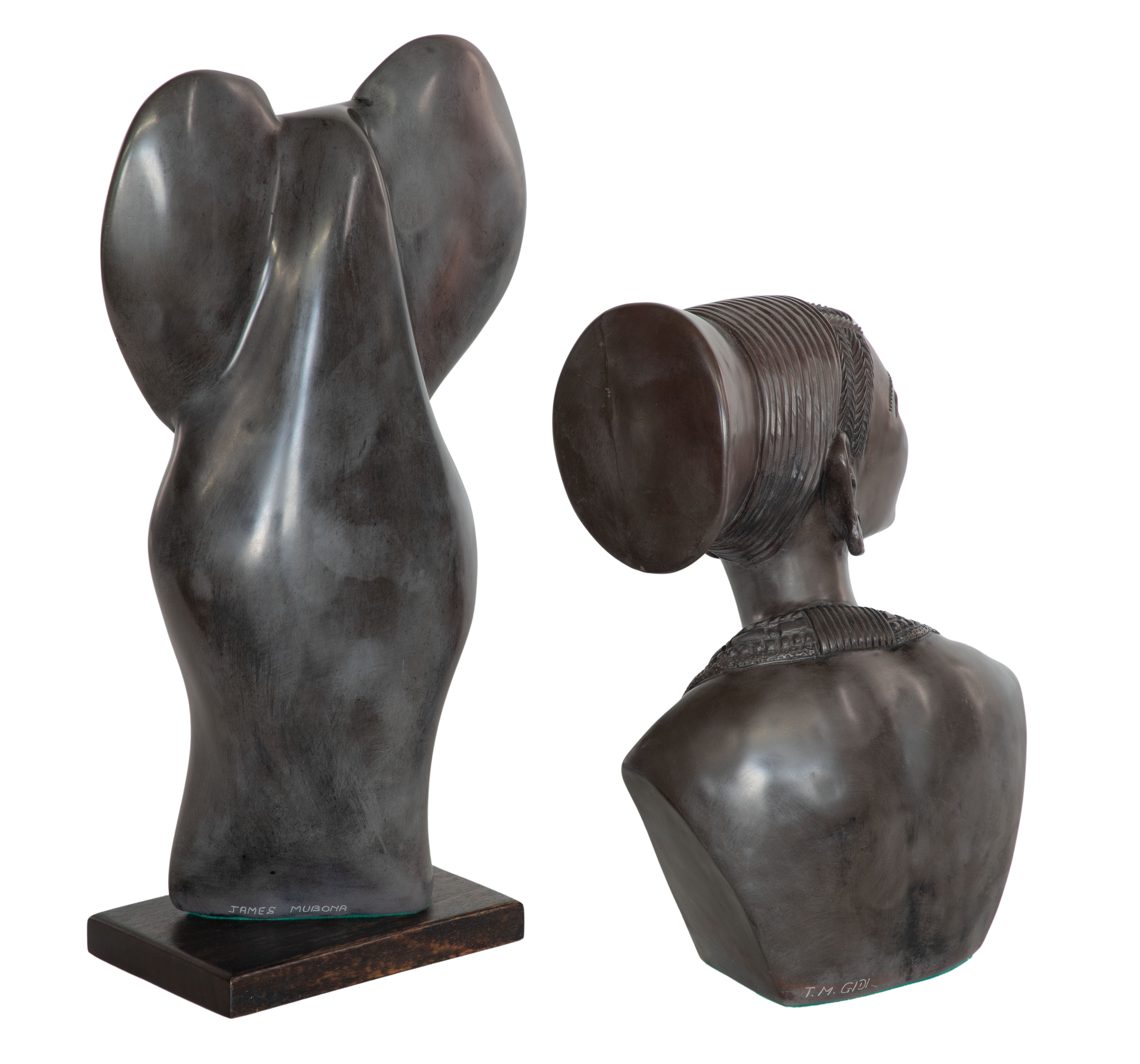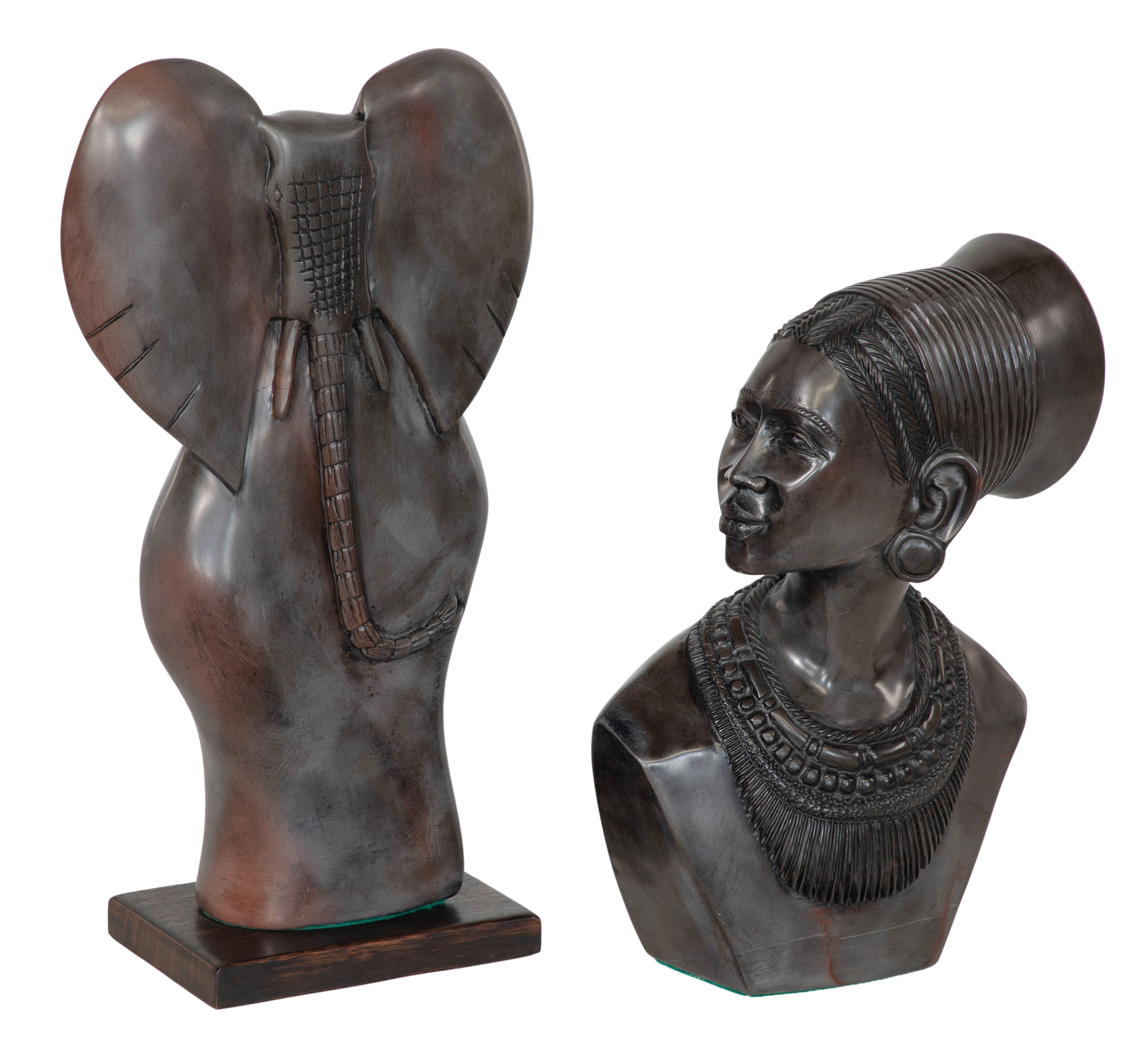 (2) items, undated, both having incised signatures, including ‘Abstract’ depicting an elephant by James Mubona on wood stand and ‘Zulu Lady’ by Matthews Gidi, accompanied by illustrated COAs from Maryol, Johannesburg, South Africa giving material as Africastone, also known as hyraceum