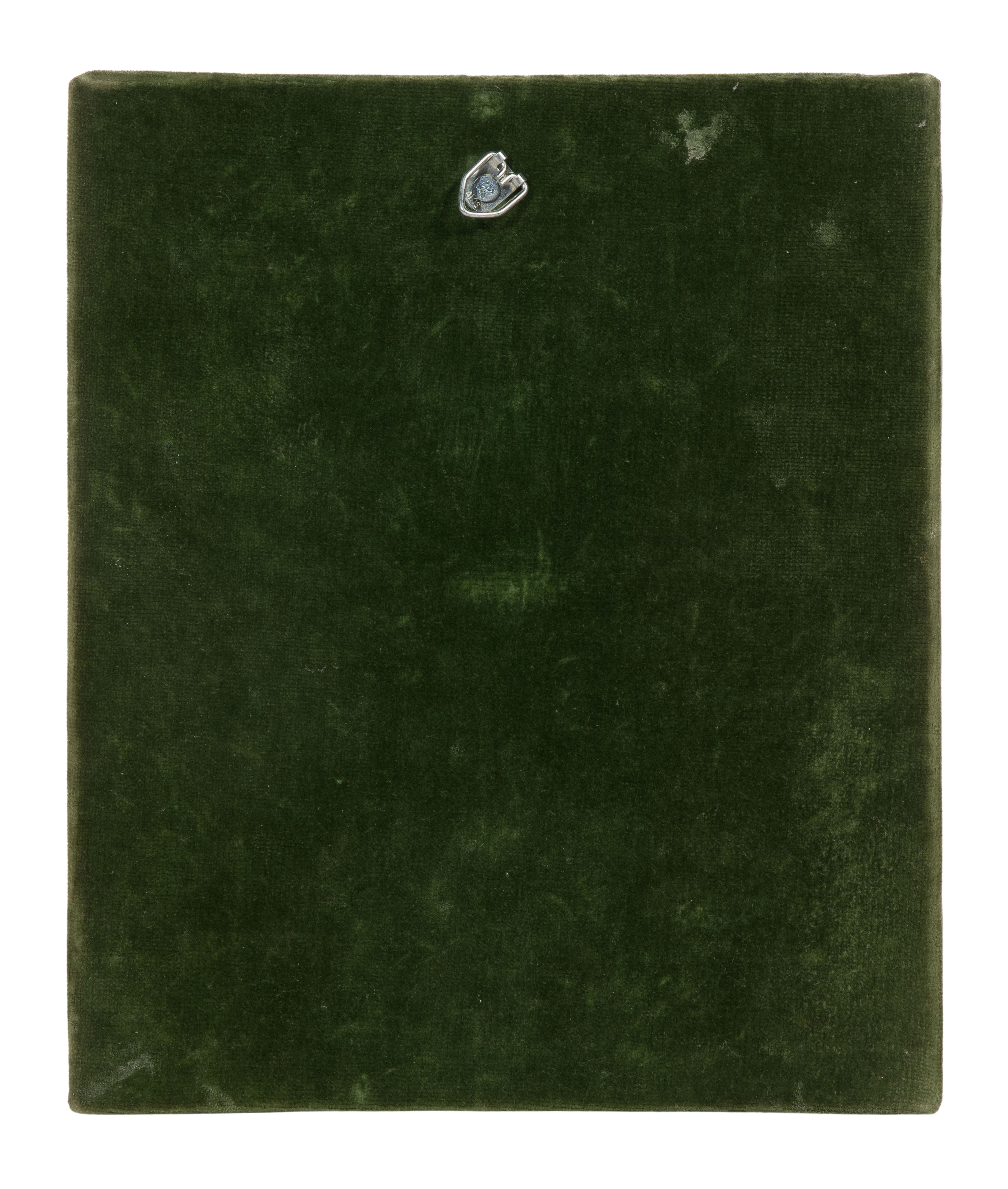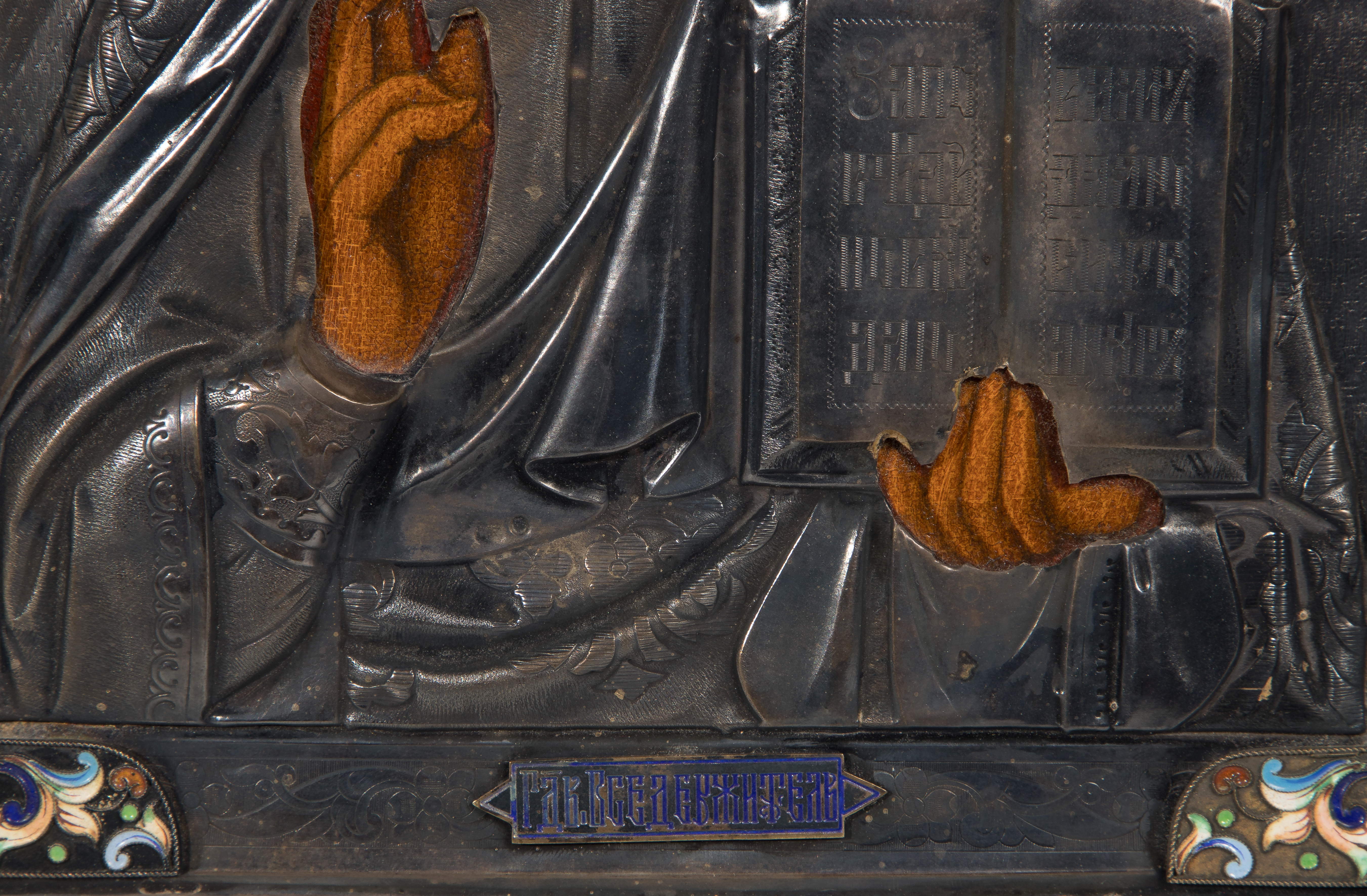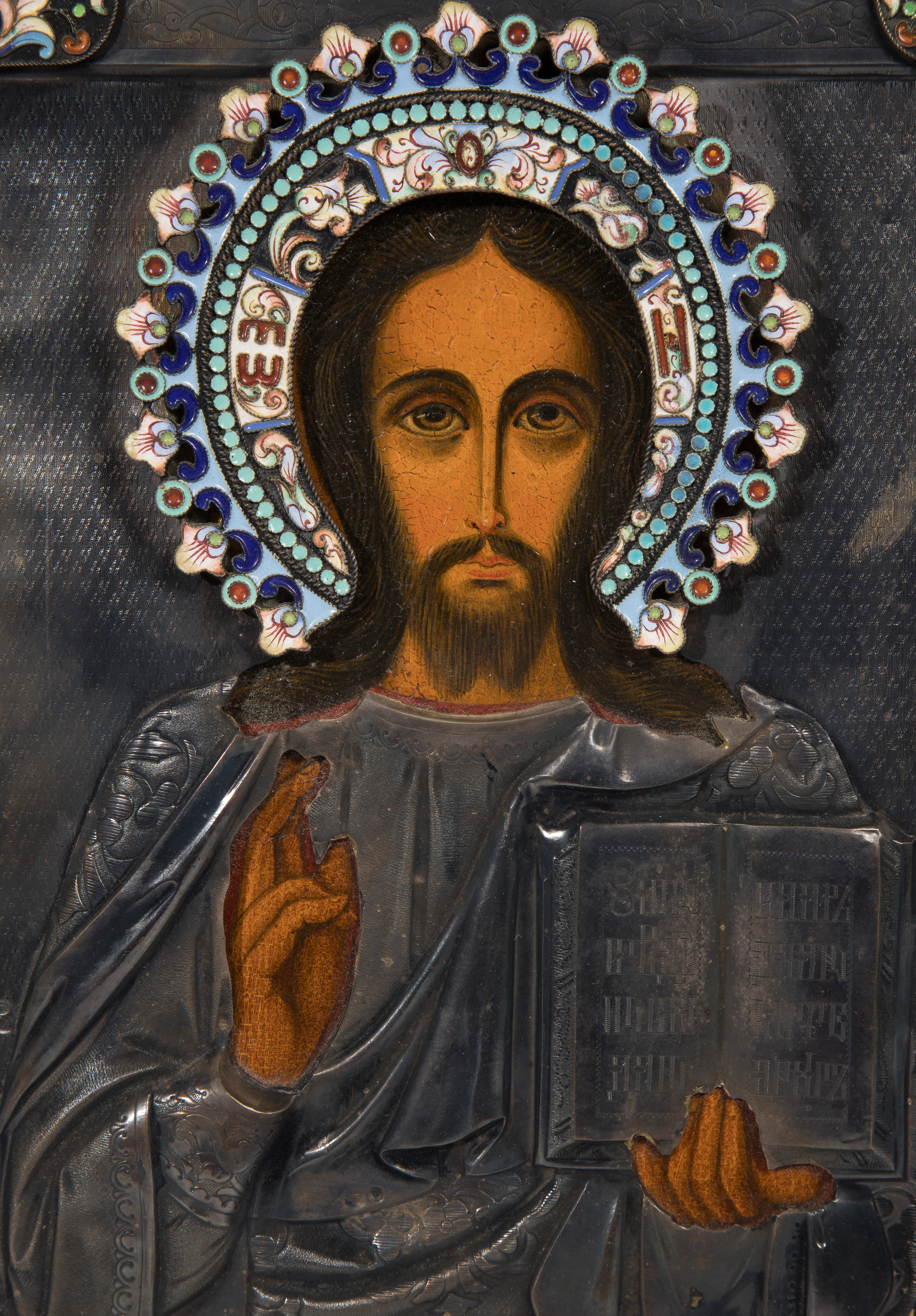 A hand painted icon of Christ the Pantocrator having cloisonne and champleve enamel, the second Kokoshnik mark above maker mark lower left, green felt backing