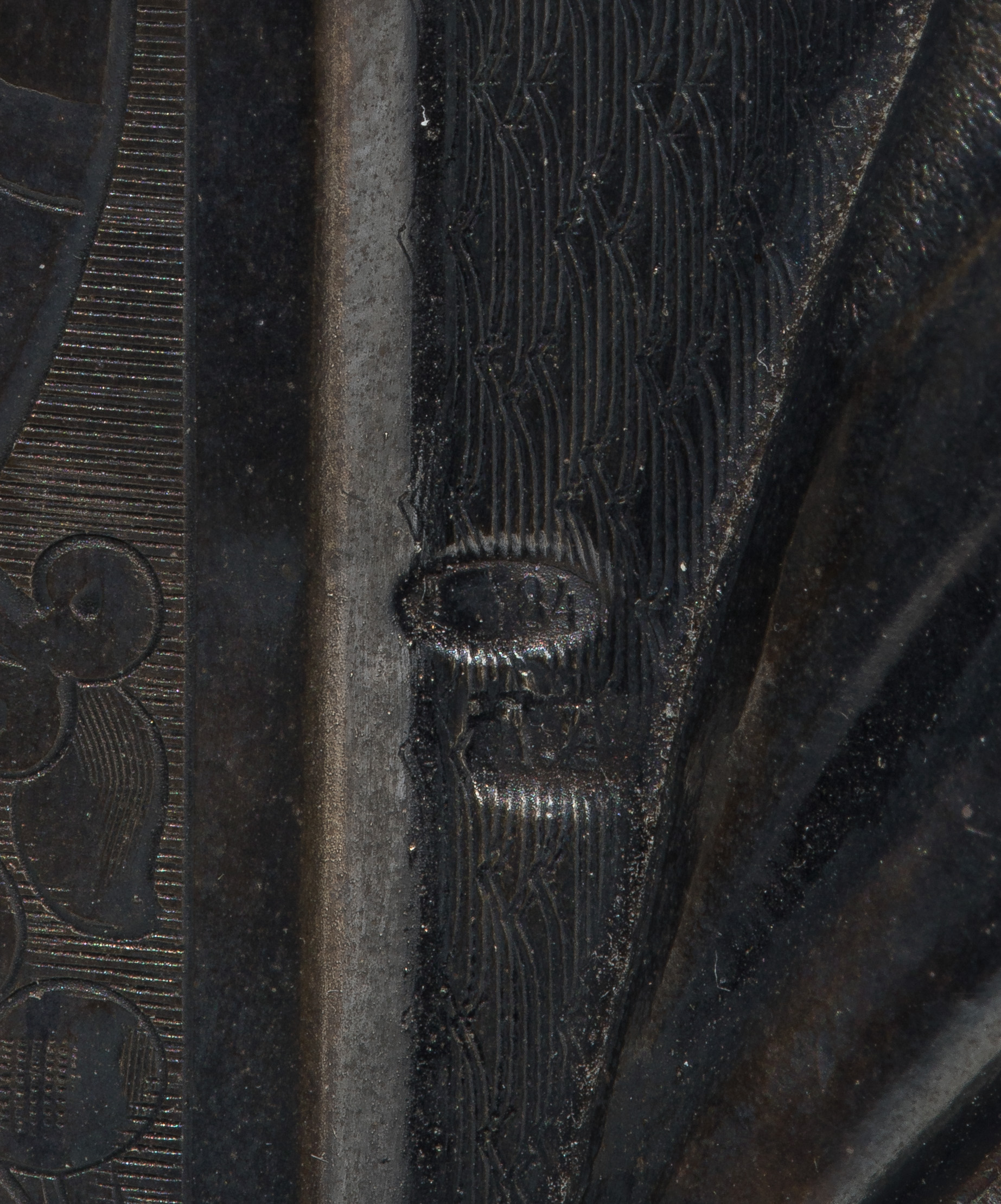 Condition: silver showing tarnish throughout, silver loss on the edges, nameplate at bottom center loose