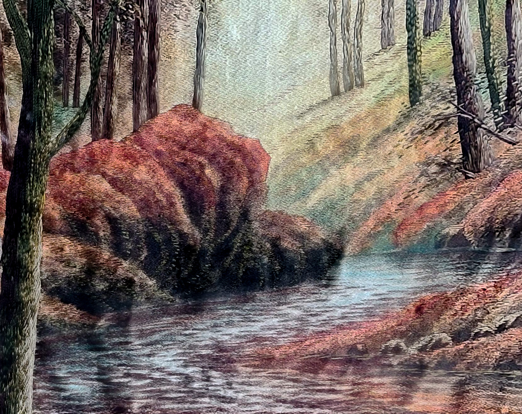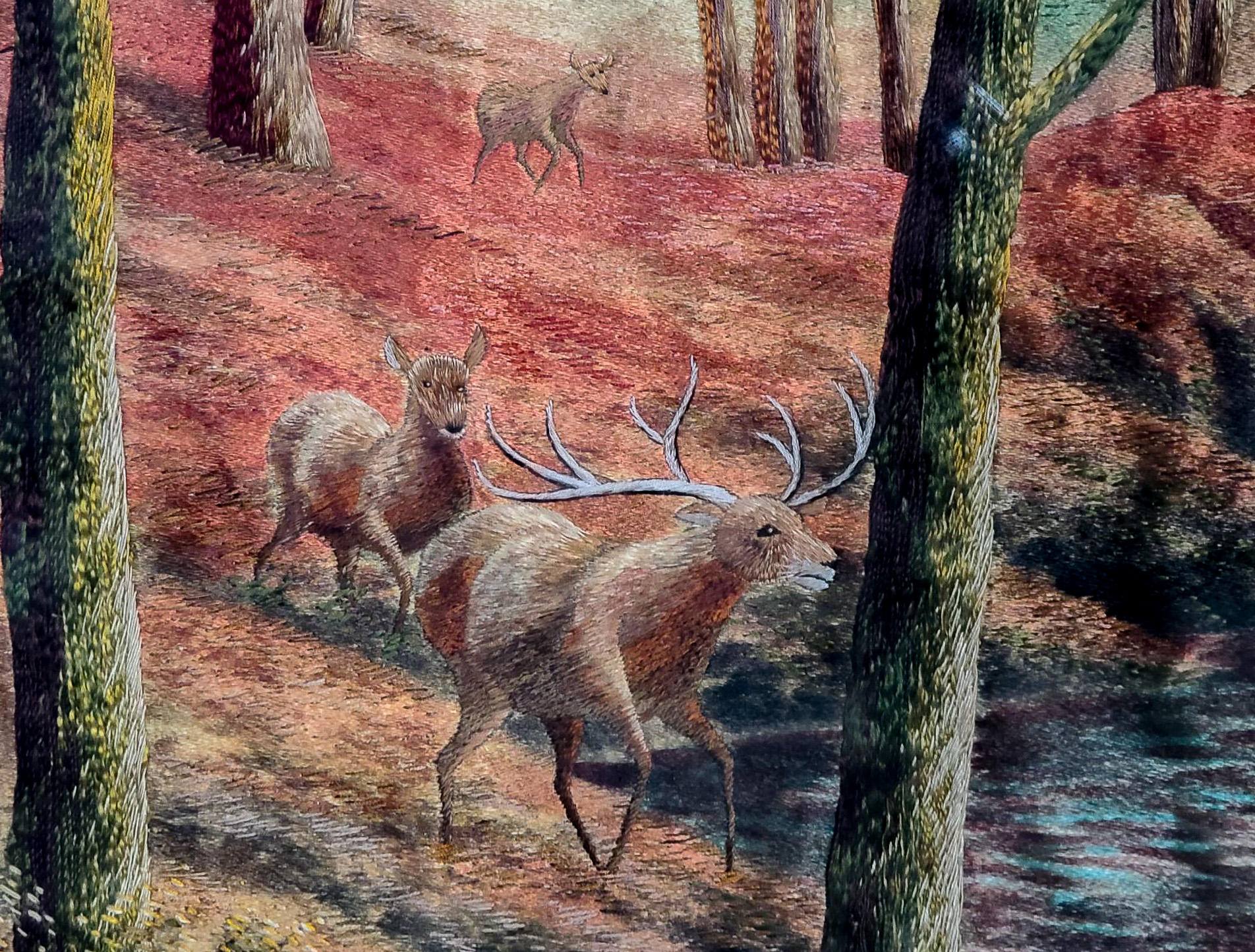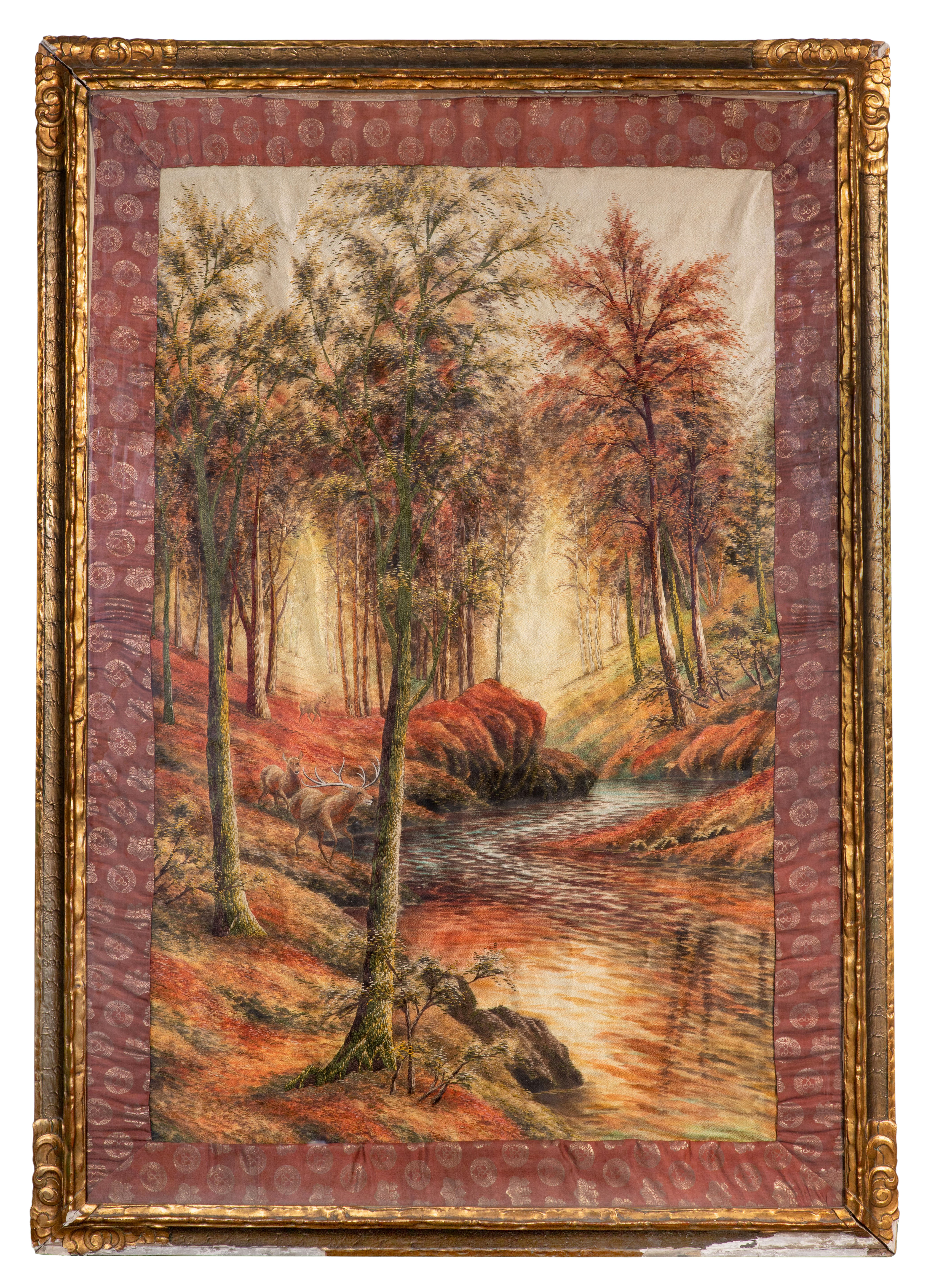 Early 20th century, depicting deer near a forest river, in a gold-tone gesso on wood frame