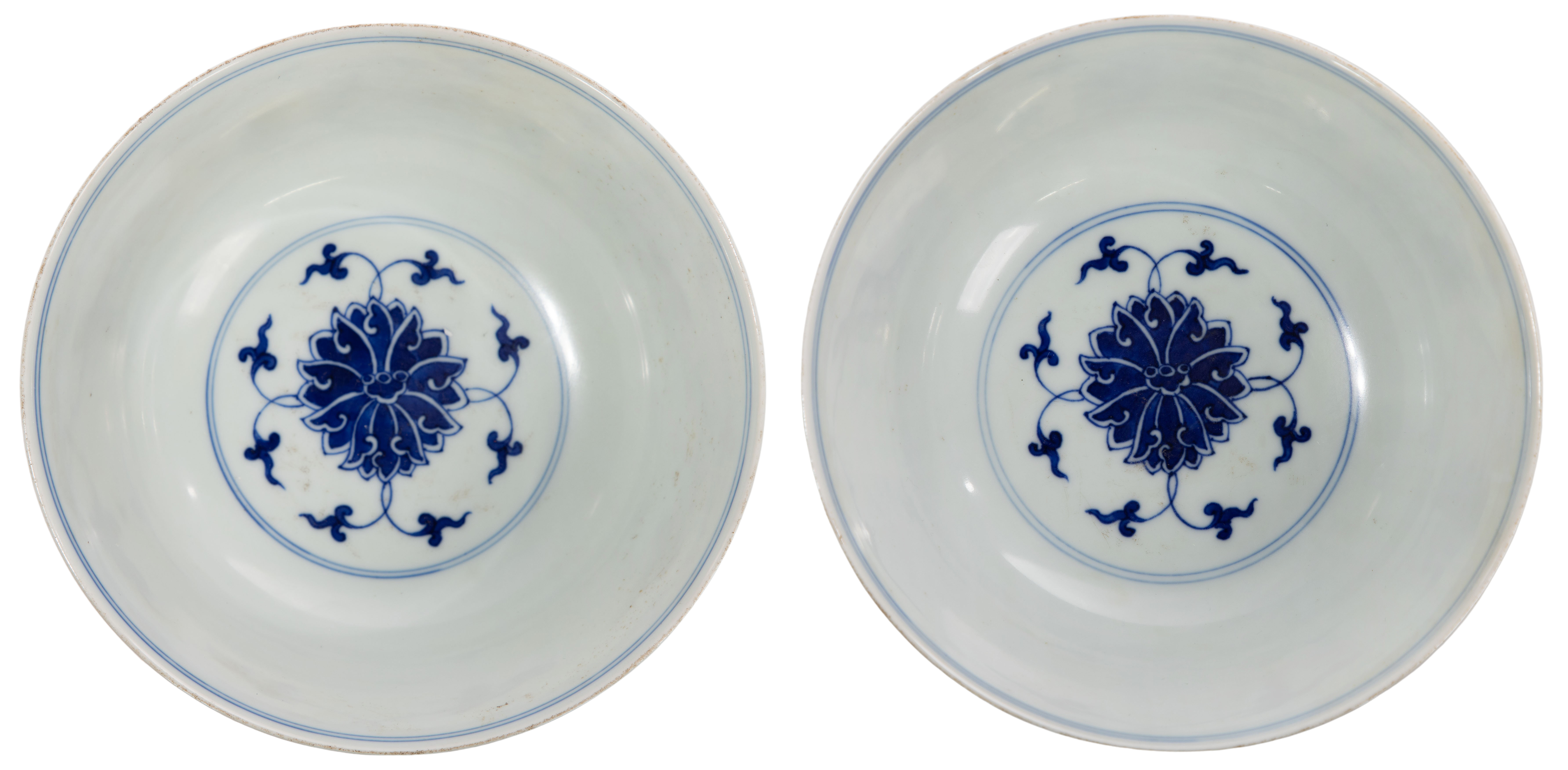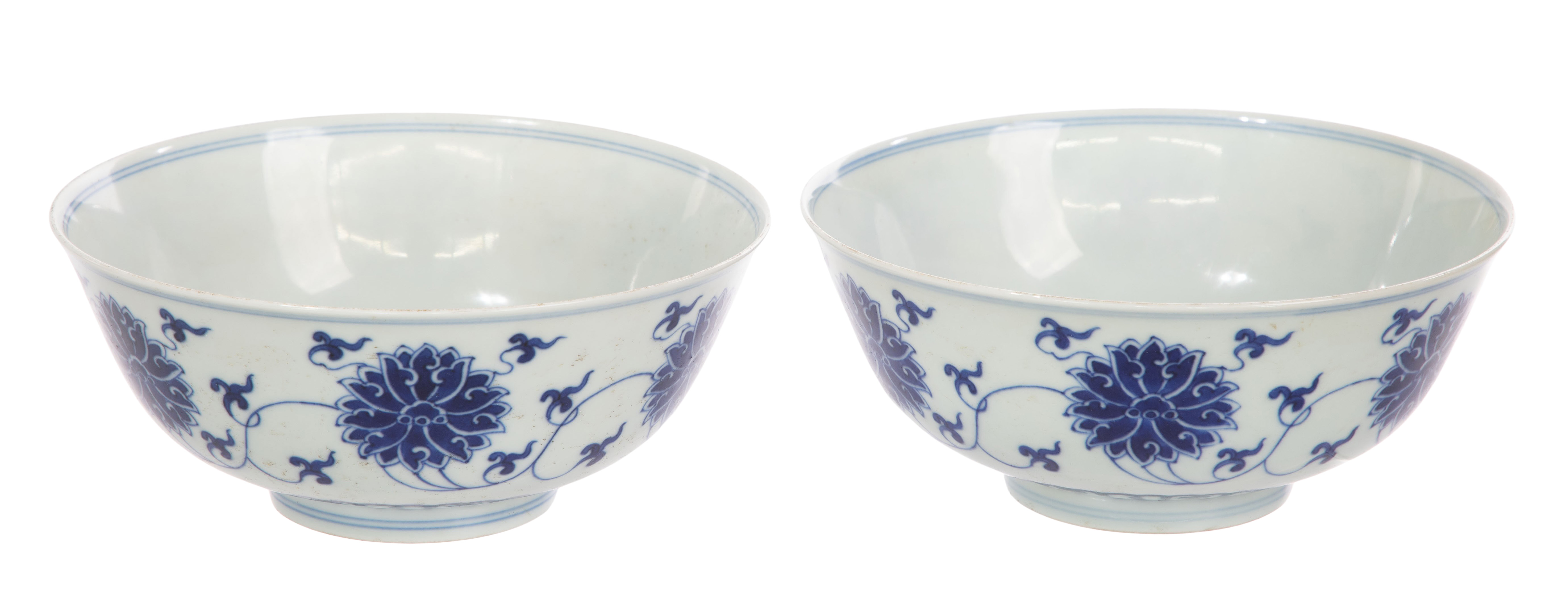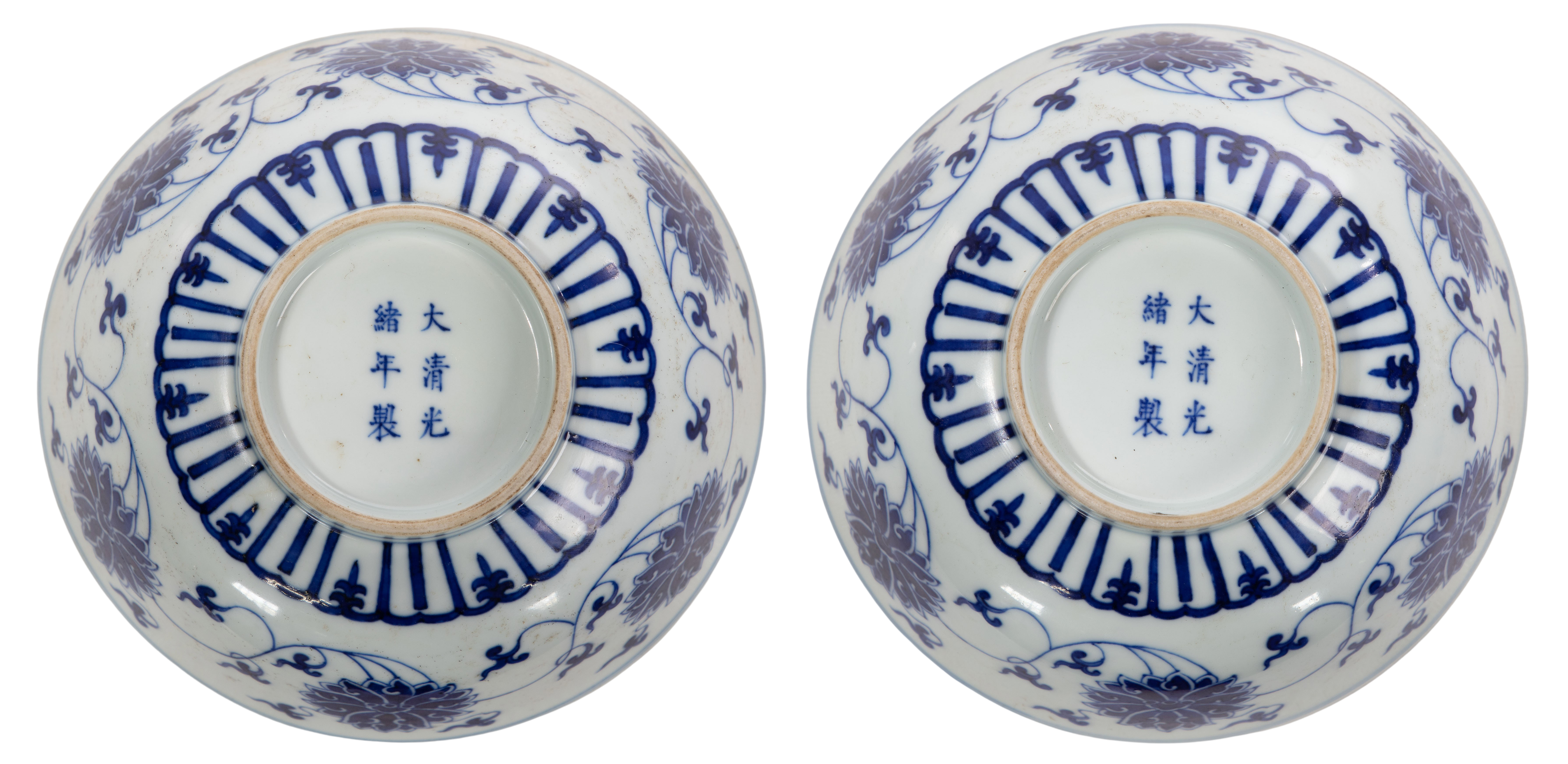 A pair having underglaze blue lotus scroll decoration, lapet band above foot, each having an underglaze blue 6-character Guangxu mark underside