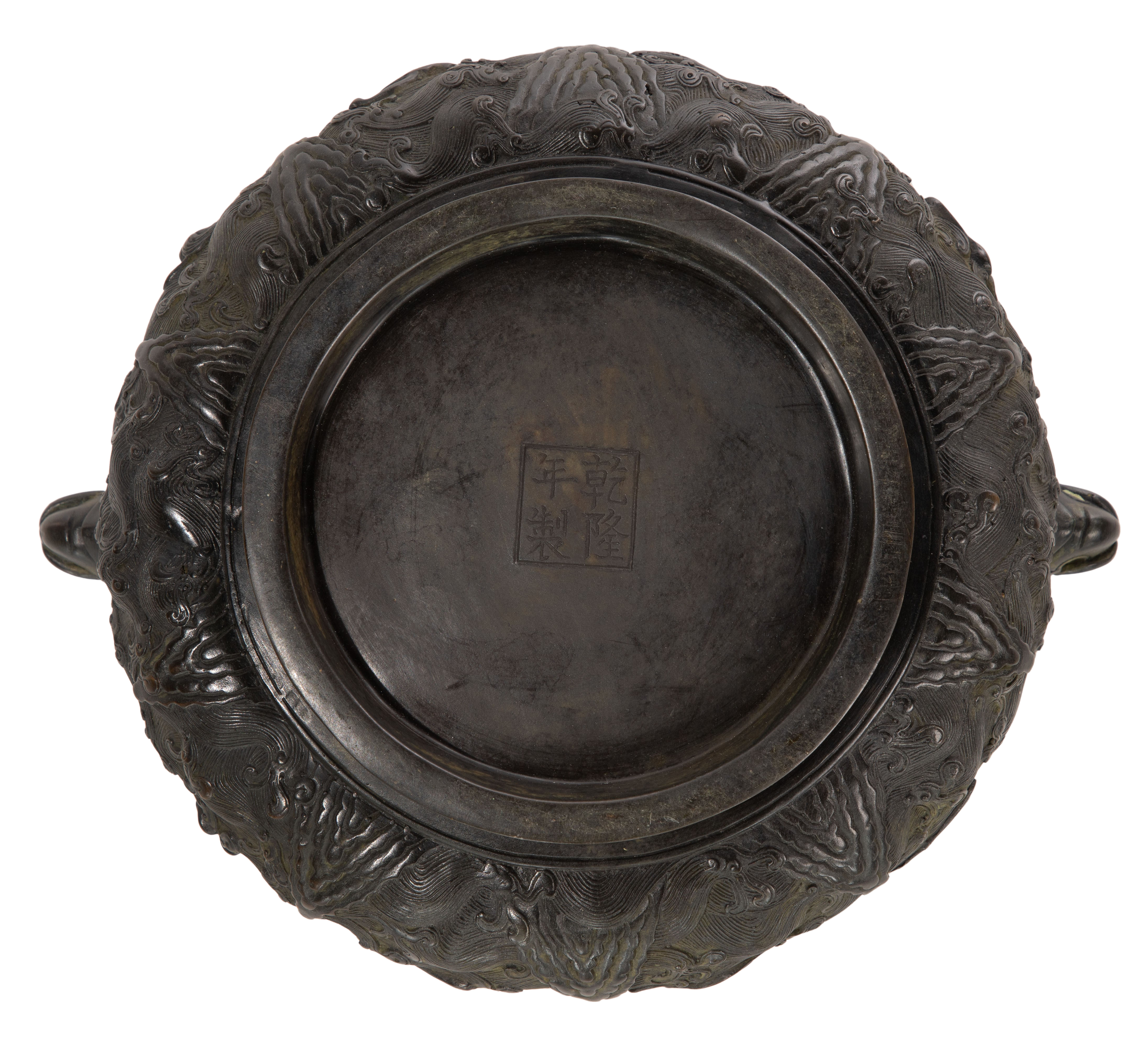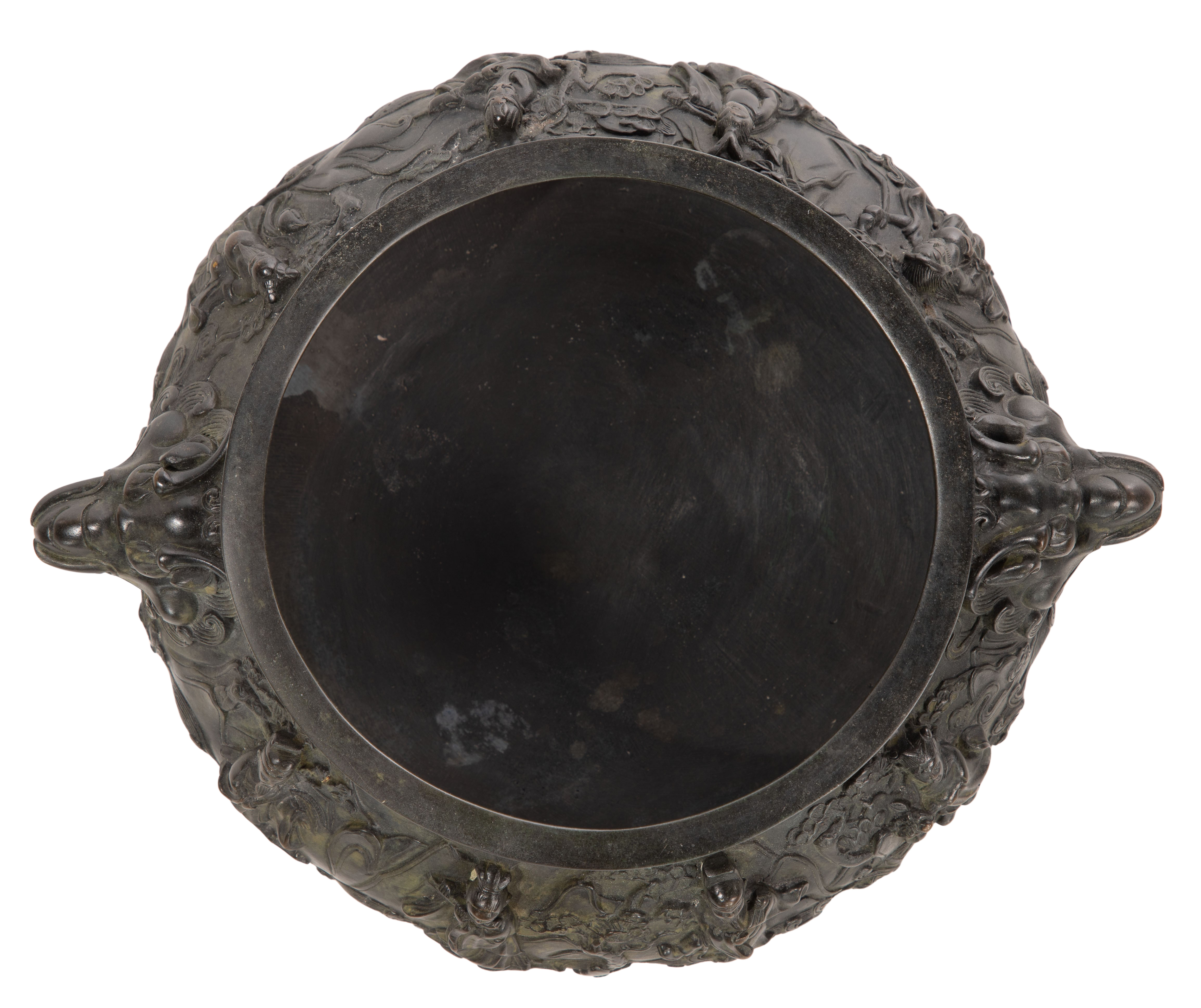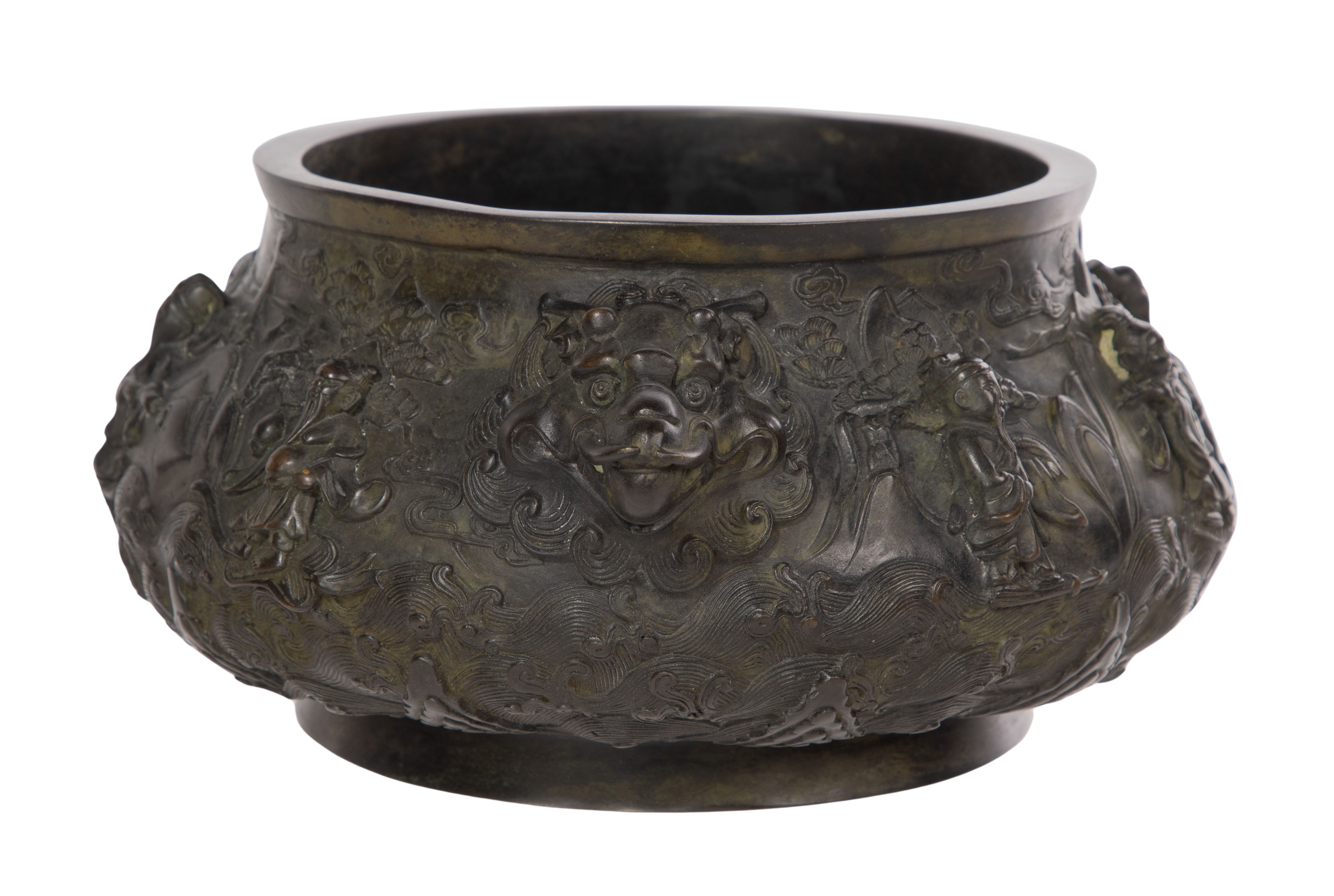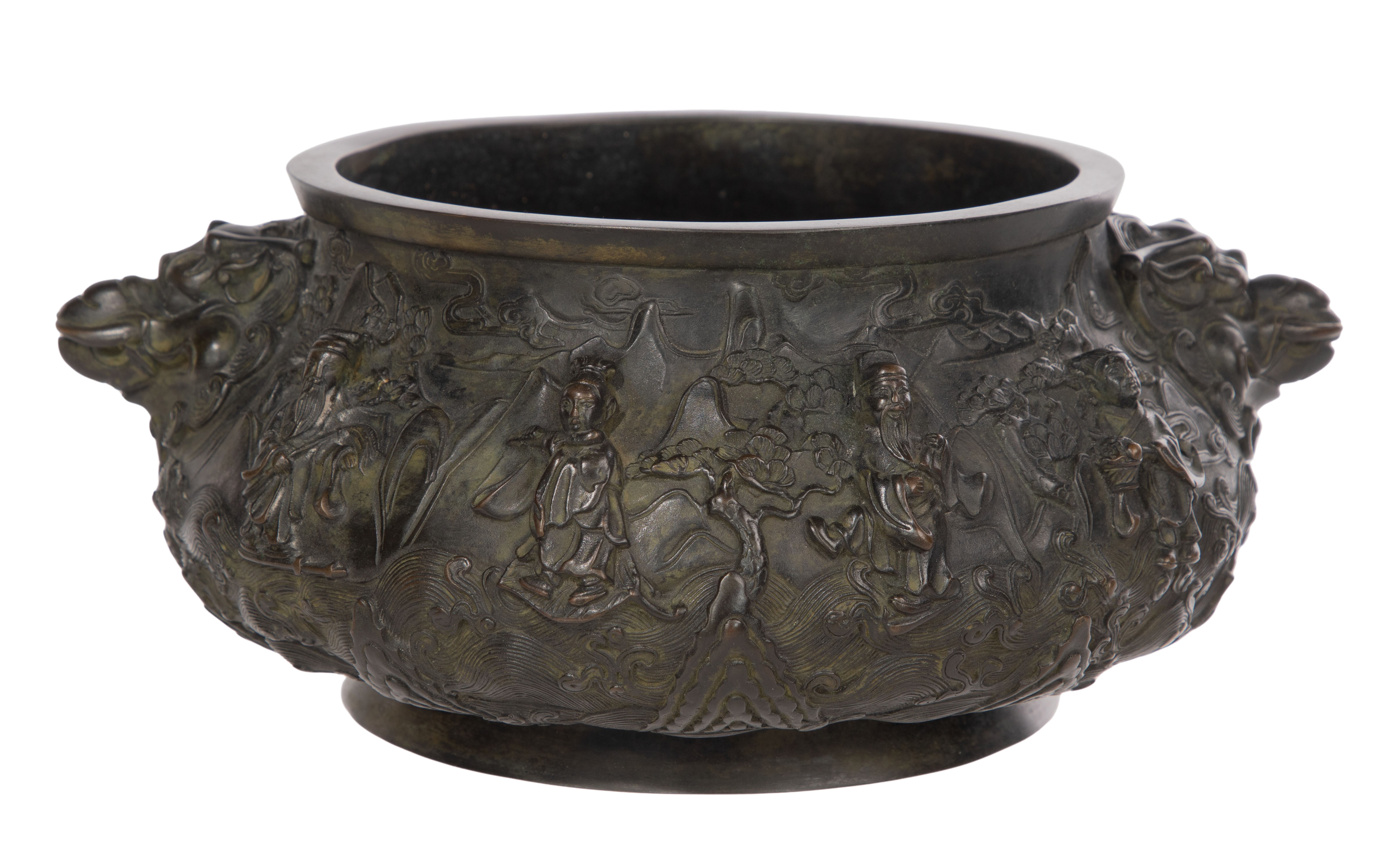 A squat bowl form having a short everted rim, short flaring foot, mythical beast head handles and relief depictions of eight immortals to sides, a cast Qianlong seal mark underside