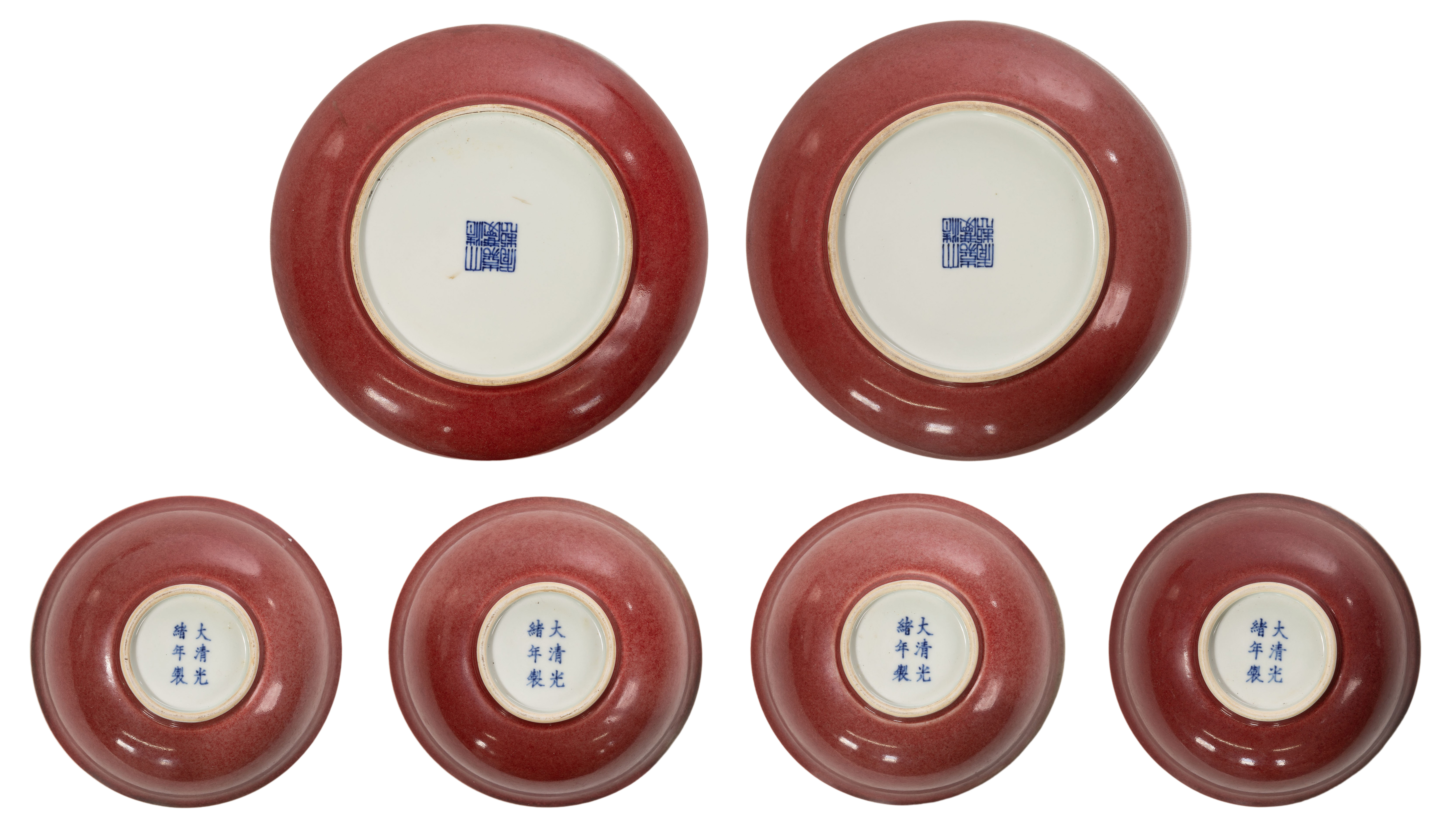(6) items, all having oxblood red glaze overall except rims and feet, including (4) matching having underglaze blue 6-character Guangxu marks underside and (2) matching low bowls having underglaze blue archaic script Guangxu seal marks underside