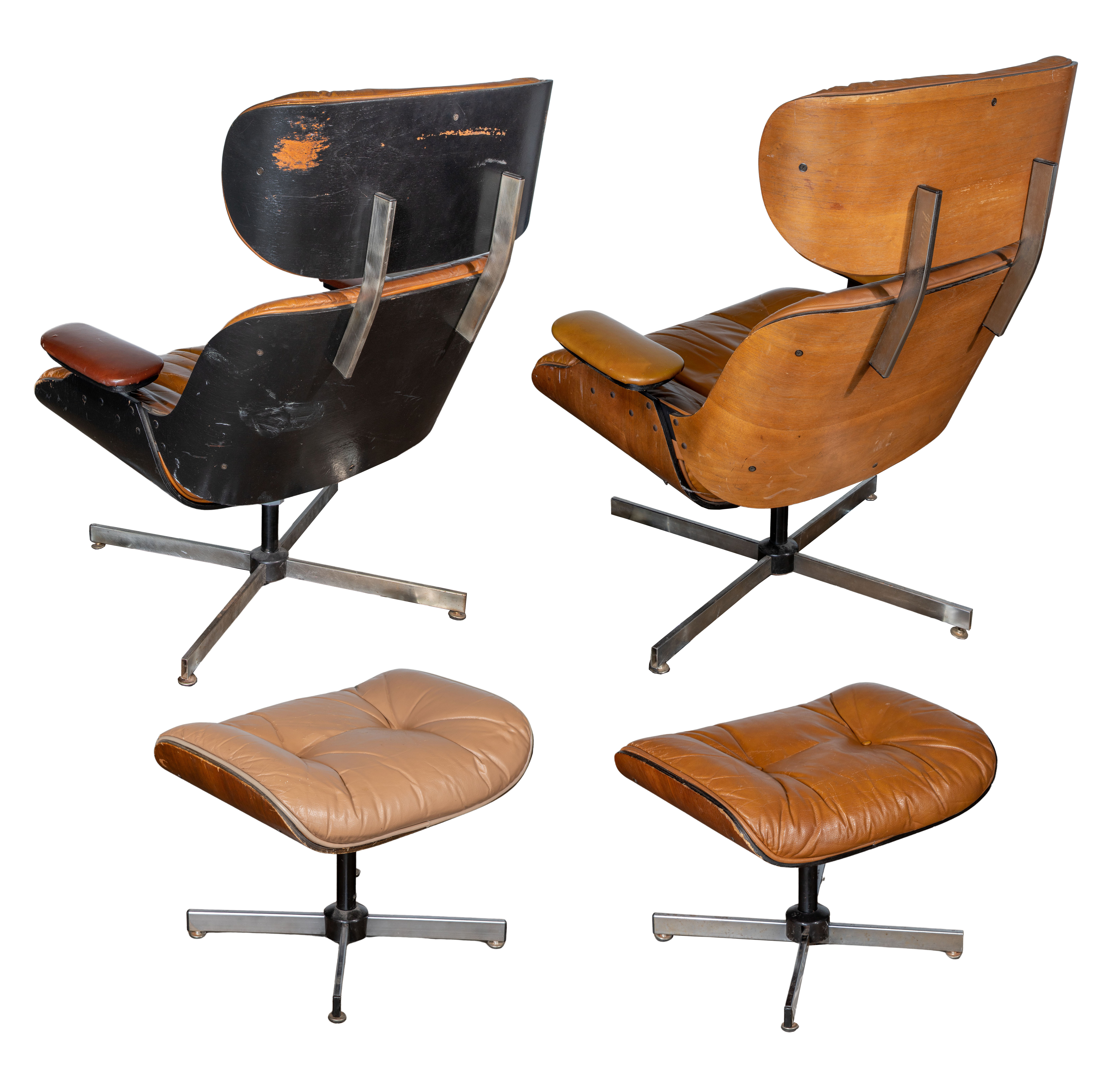(2) unmarked chair and ottoman sets having molded plywood curved shells, tufted faux leather upholstery, star-shaped steel base, each chair swivels and reclines