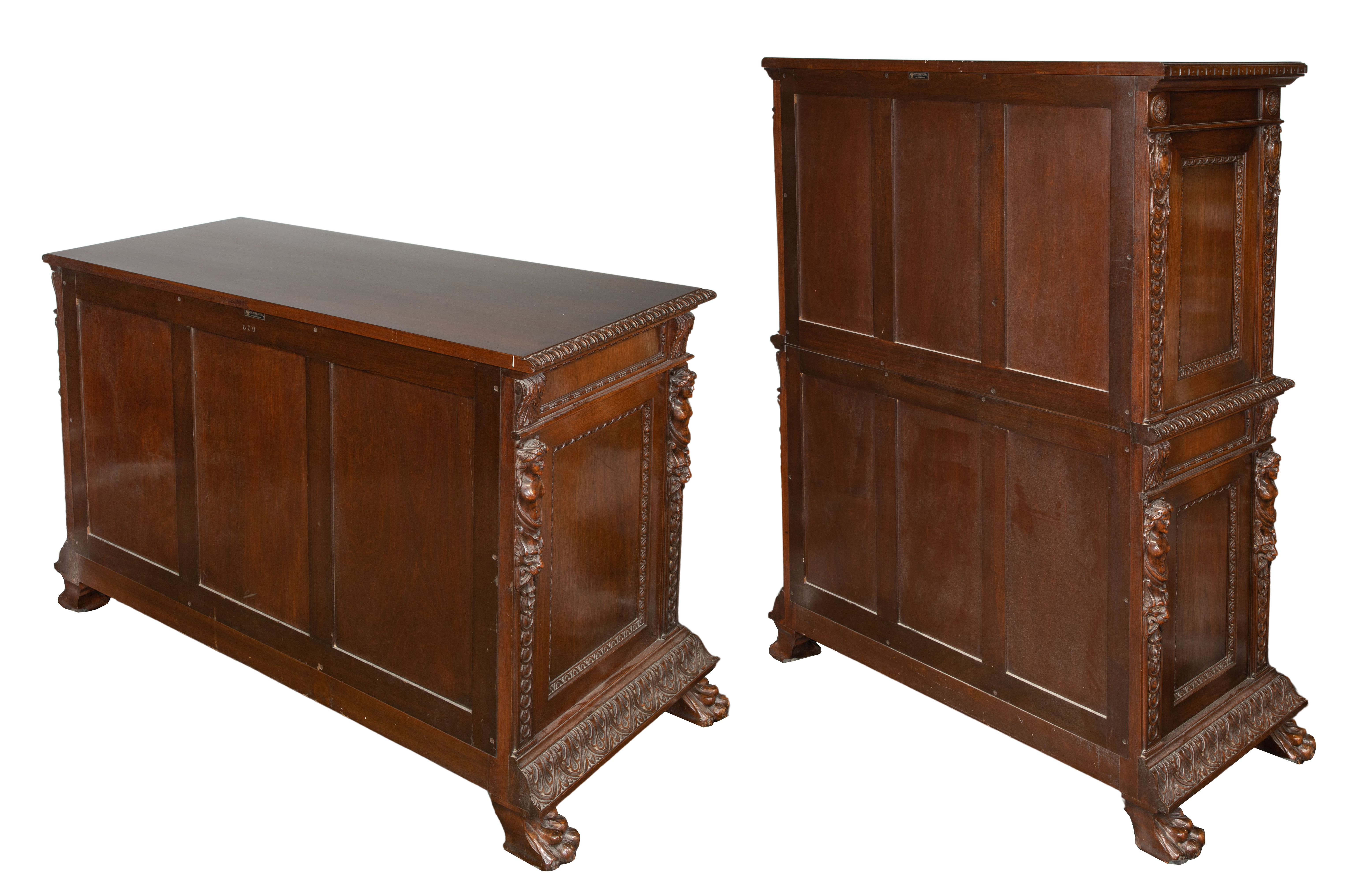 (2) items having a mahogany finish and carved figural herms at corners, decorative carving throughout adorned by a grotesque face, including a chest on chest having two doors over four dovetailed drawers and a chest of two half drawers over three full drawers, oak secondary wood, both having brass labels reading ‘The Munago Co., Inc. / Chicago, Illinois’
