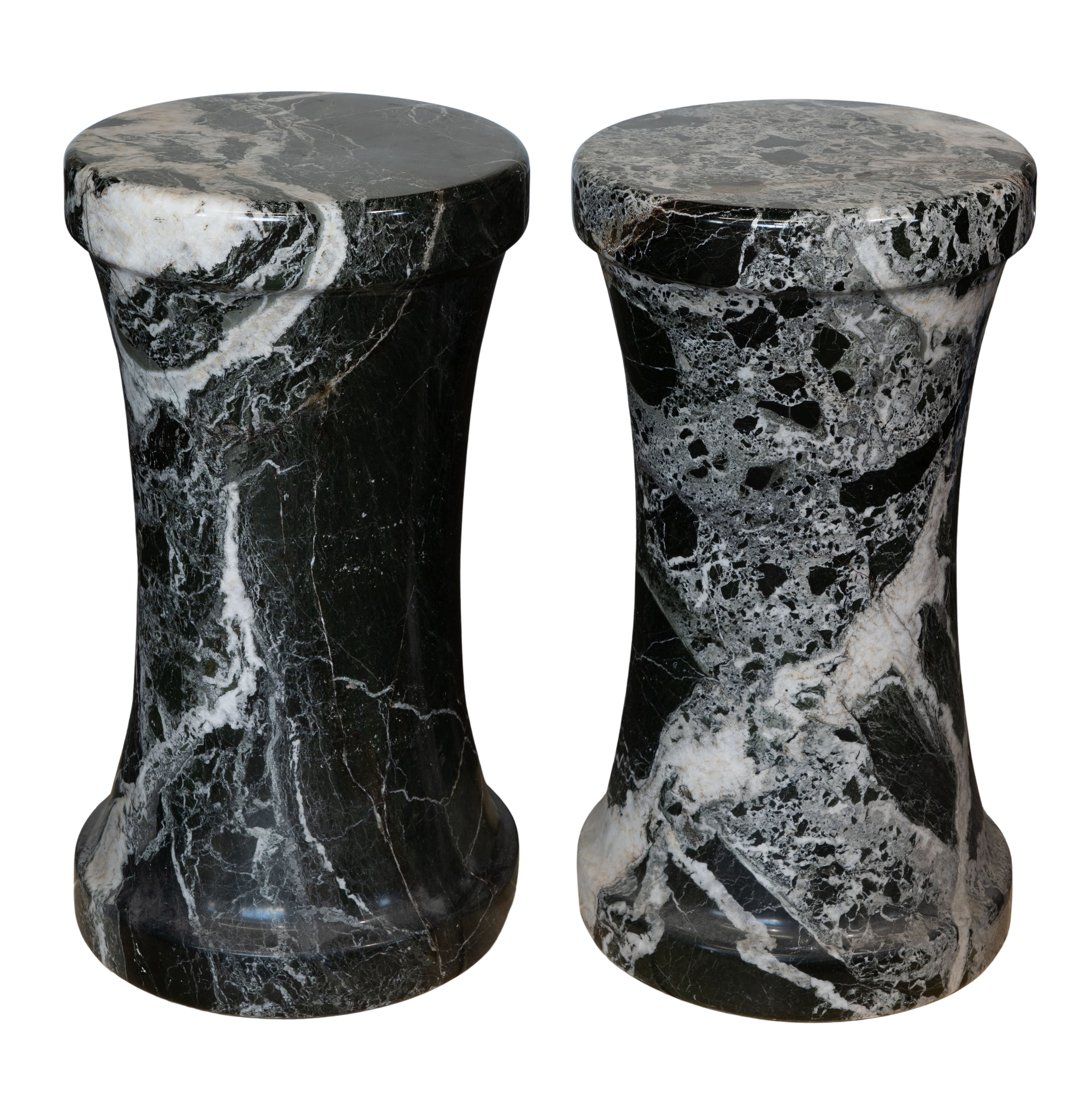A pair of black and white brecciated marble cylindrical pedestals having slight waists and raised bands at tops and feet