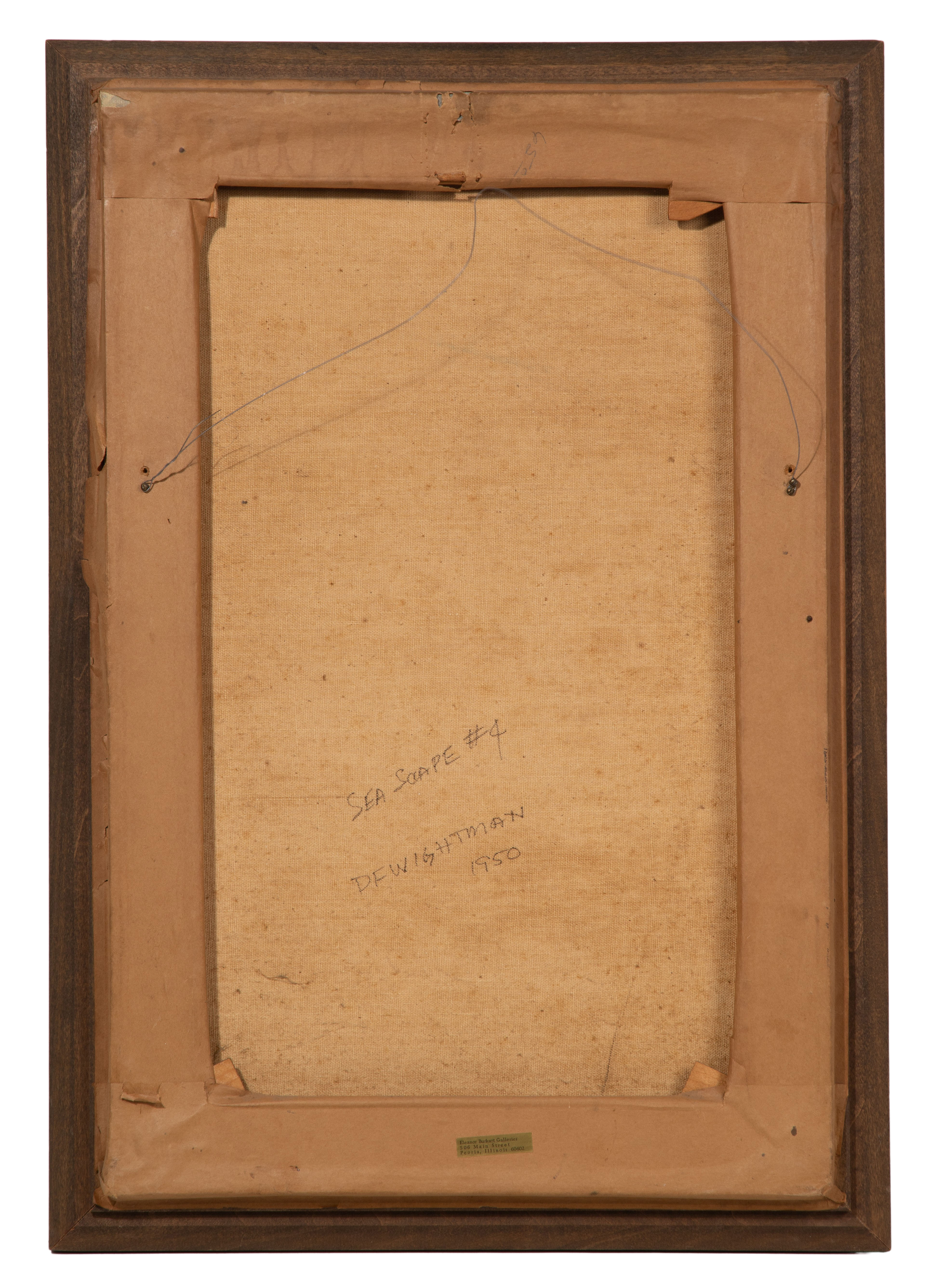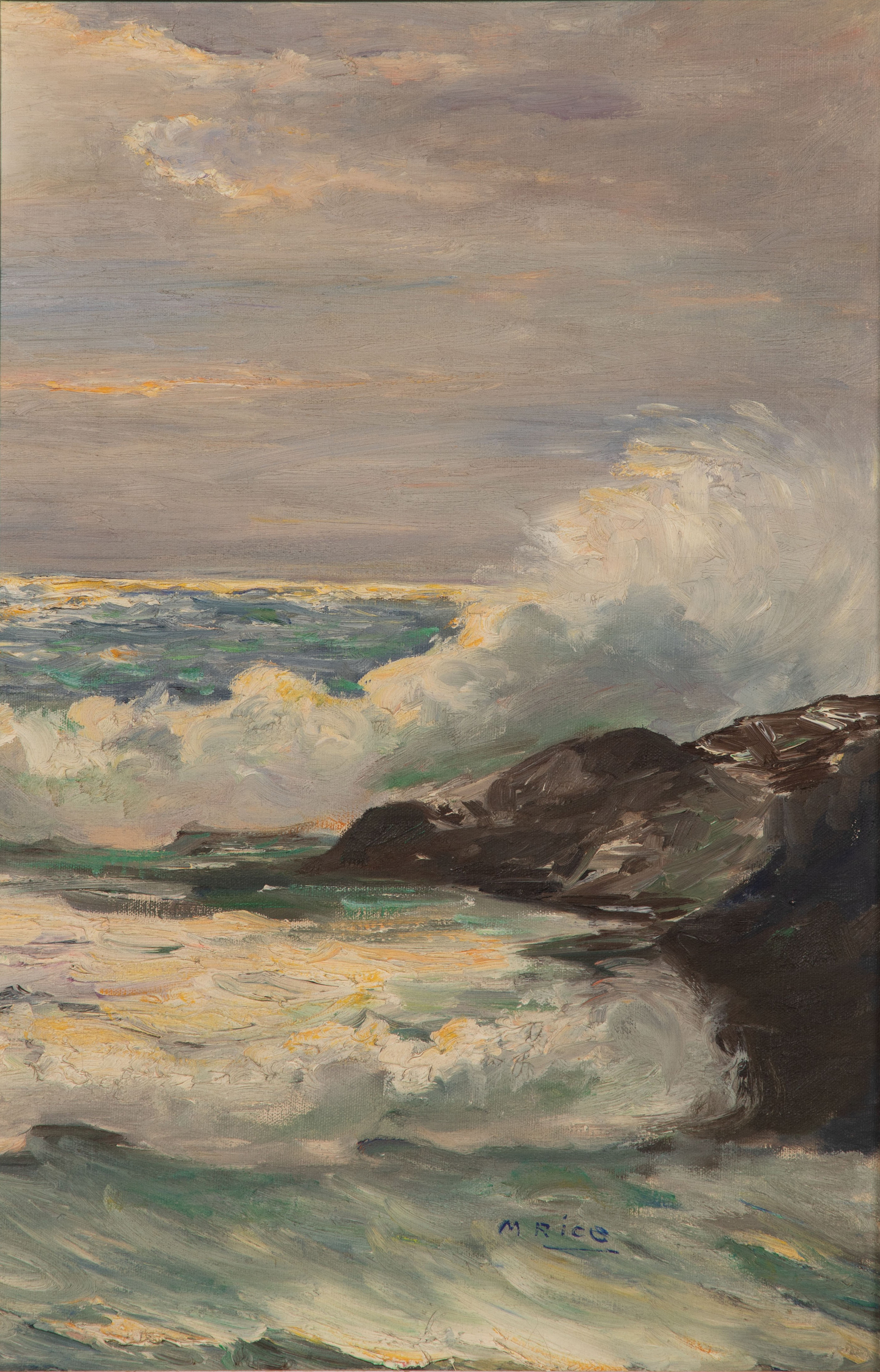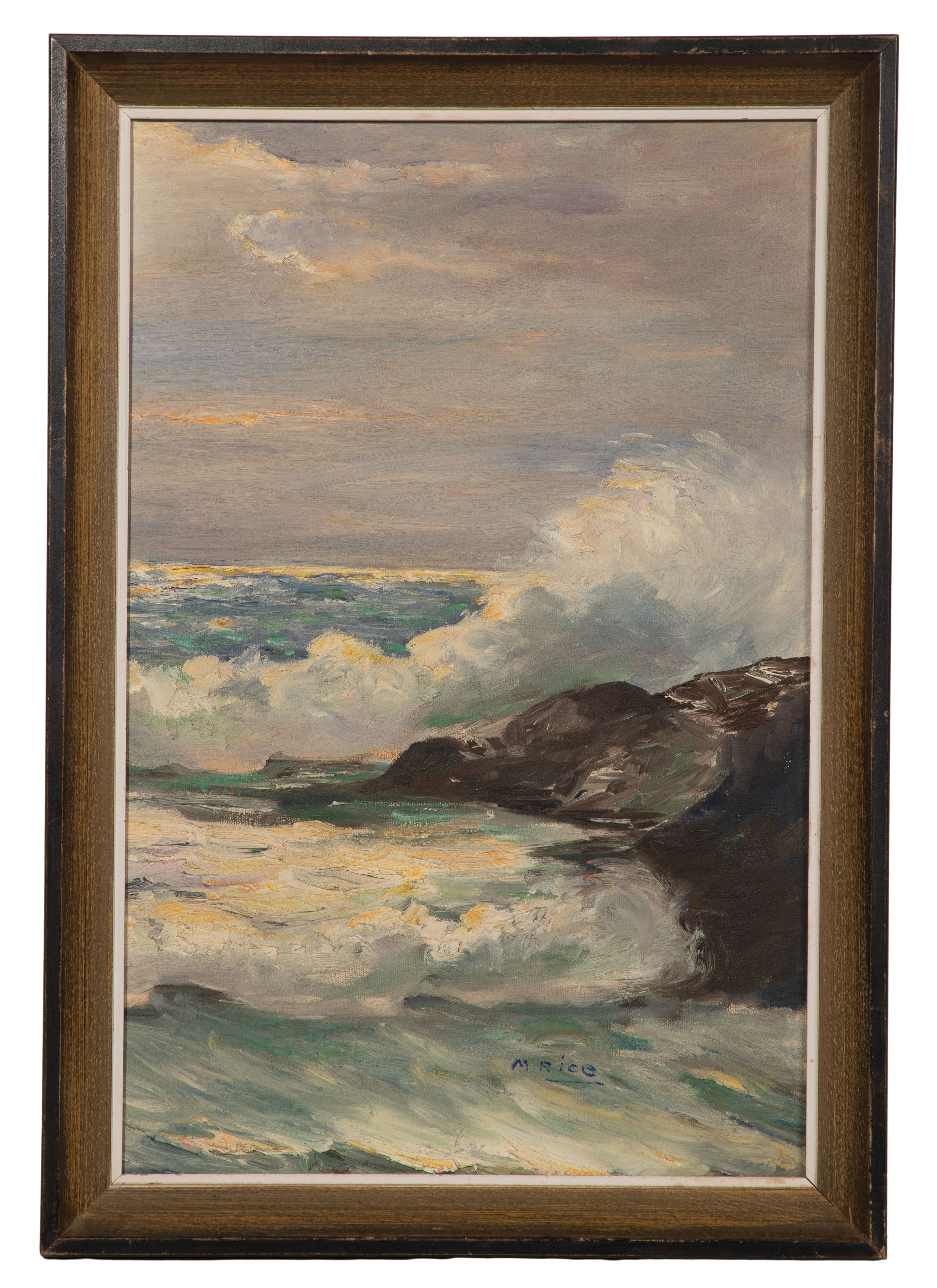 Undated, signed ‘M. Rice’, depicting a seascape, marked ‘Sea Scape #4 D F Wightman 1950’ verso, Eleanor Burkart Galleries label verso, in a wood frame