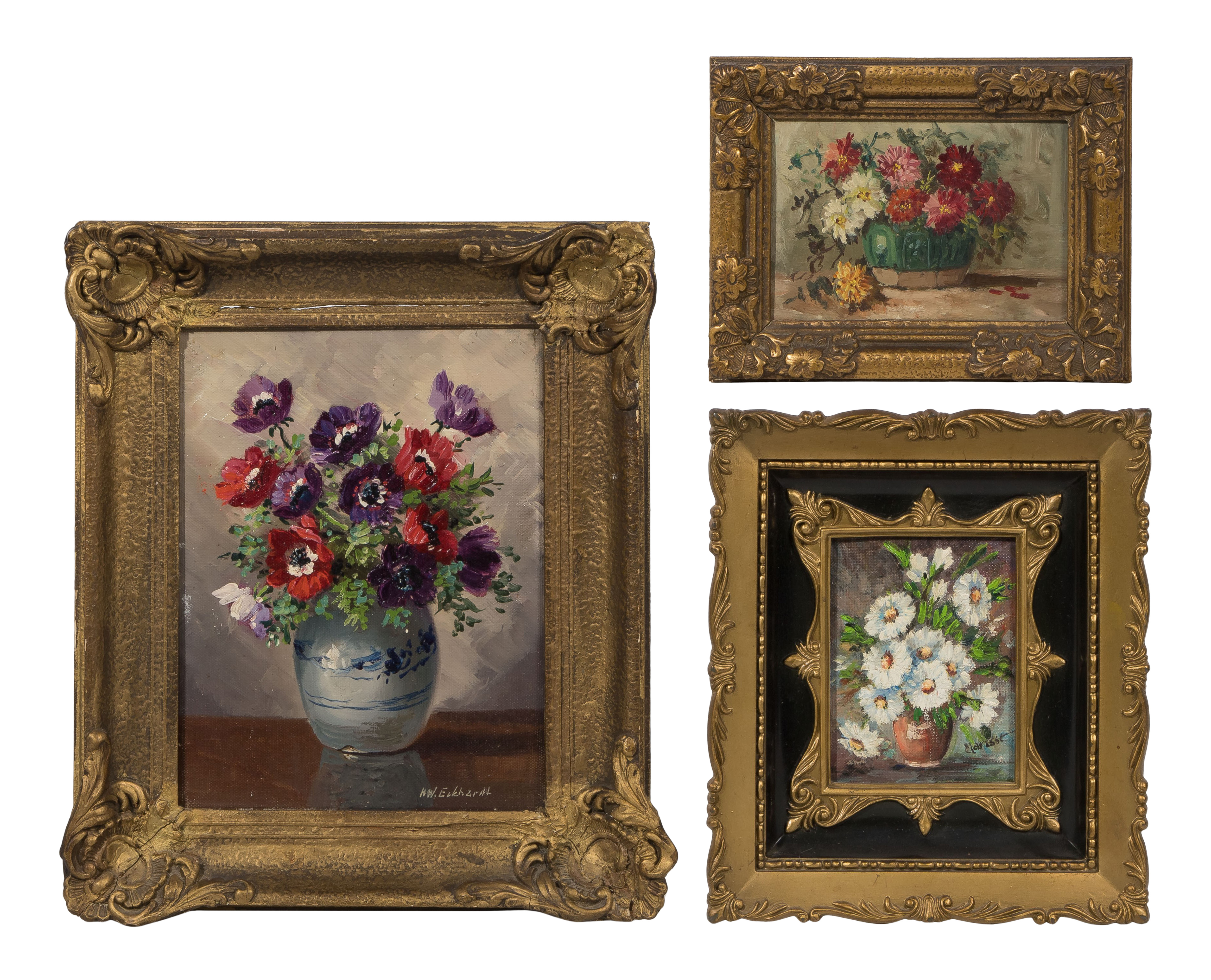 (3) total items including an undated, signed ‘Eckhardt’ depicting a floral arrangement, in a gold-tone wood frame; together with (2) oils on canvas including a Clarisse signed and an unsigned work both in gold-tone wood frames