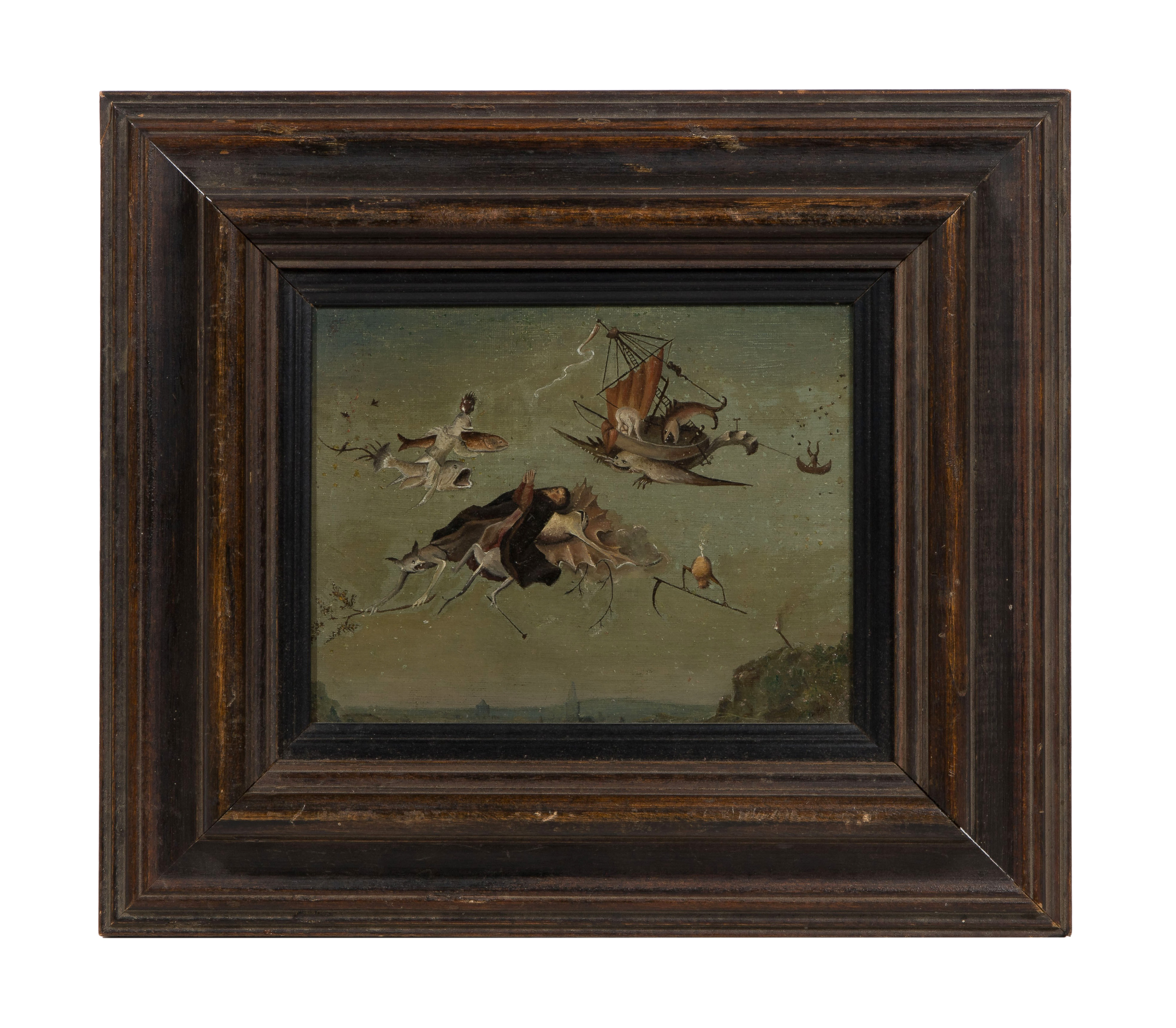 Undated and unsigned, a copy painting after Bosch depicting St. Anthony under attack by demons in midair, in a wood frame