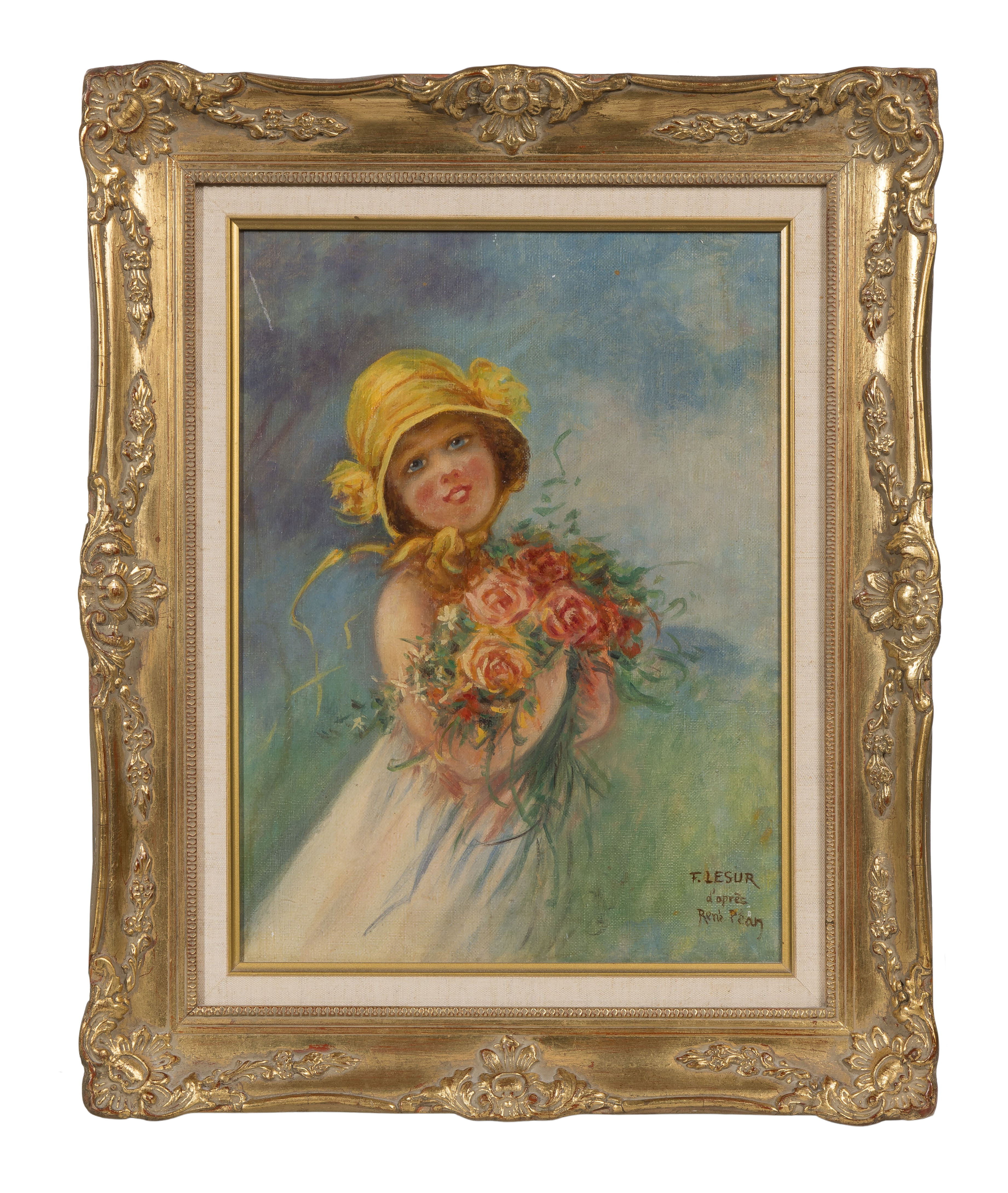Undated, signed ‘F. Lesur / d’apres / Rene Pean’ lower right, depicting a young girl holding a bouquet of flowers, in a linen-lined gold-tone gesso on carved wood frame
