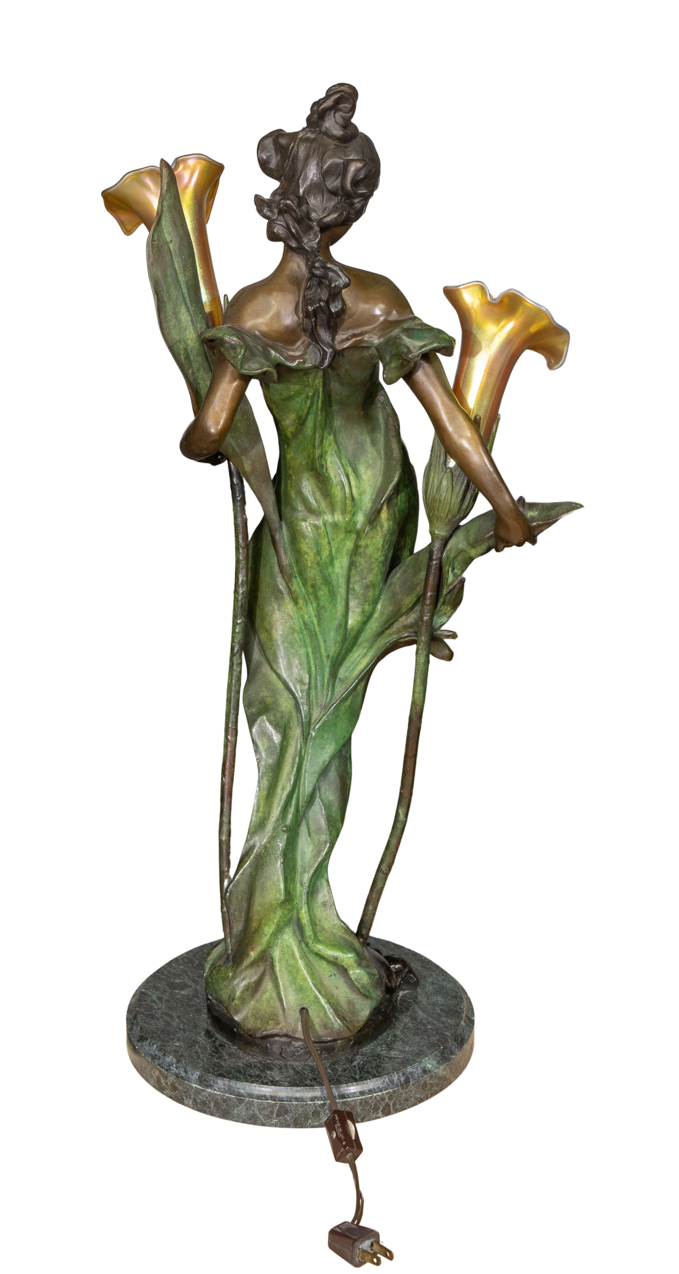 Undated, incised signature on the back edge, depicting a female figure with two floriform favrile glass shades, mounted on a marble base