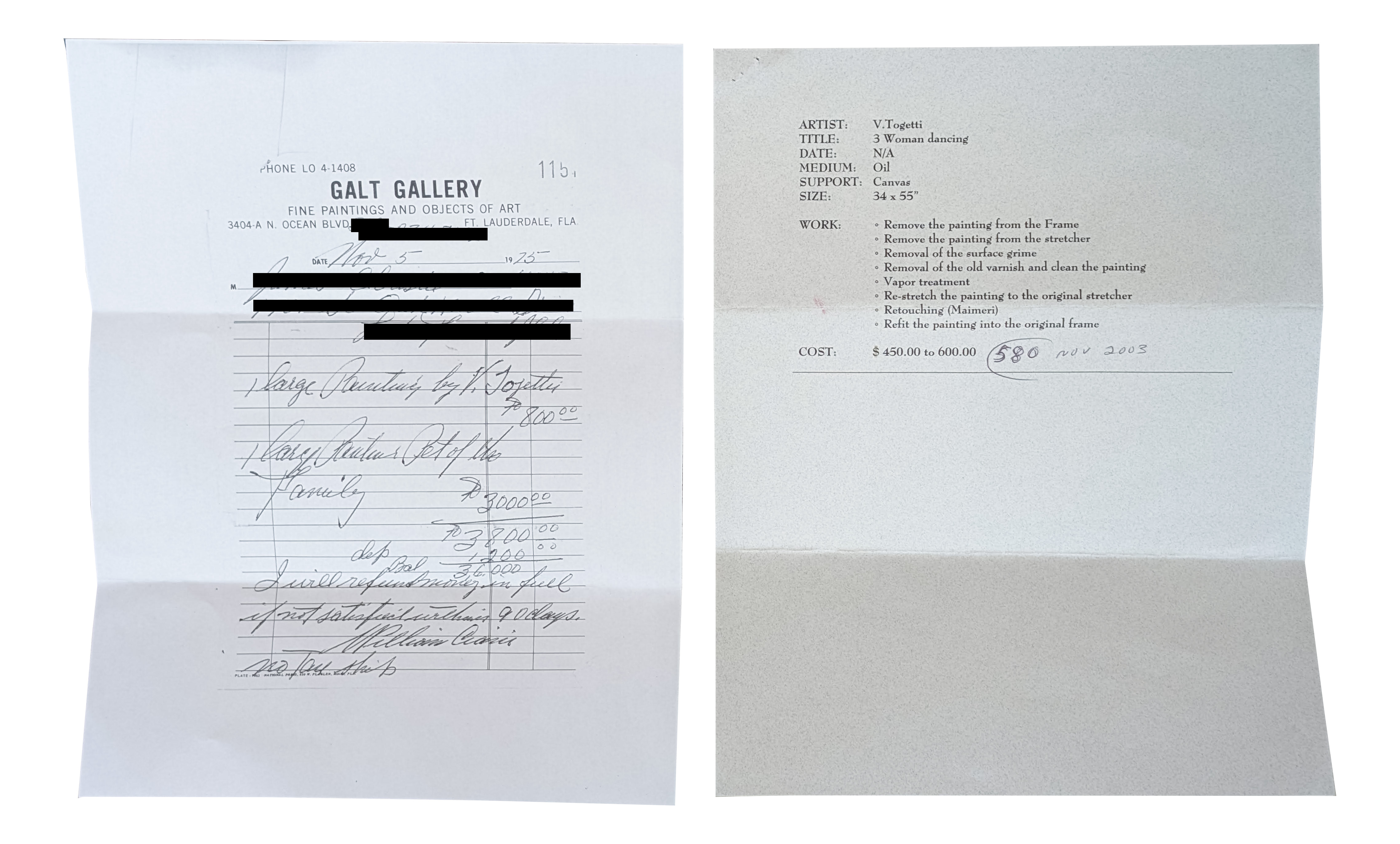 1891, signed lower left, depicting three women dancing, in a gold-tone painted wood frame, retaining a copy of an invoice from the Galt Gallery, Fort Lauderdale, Florida and a conservator invoice and list of work done