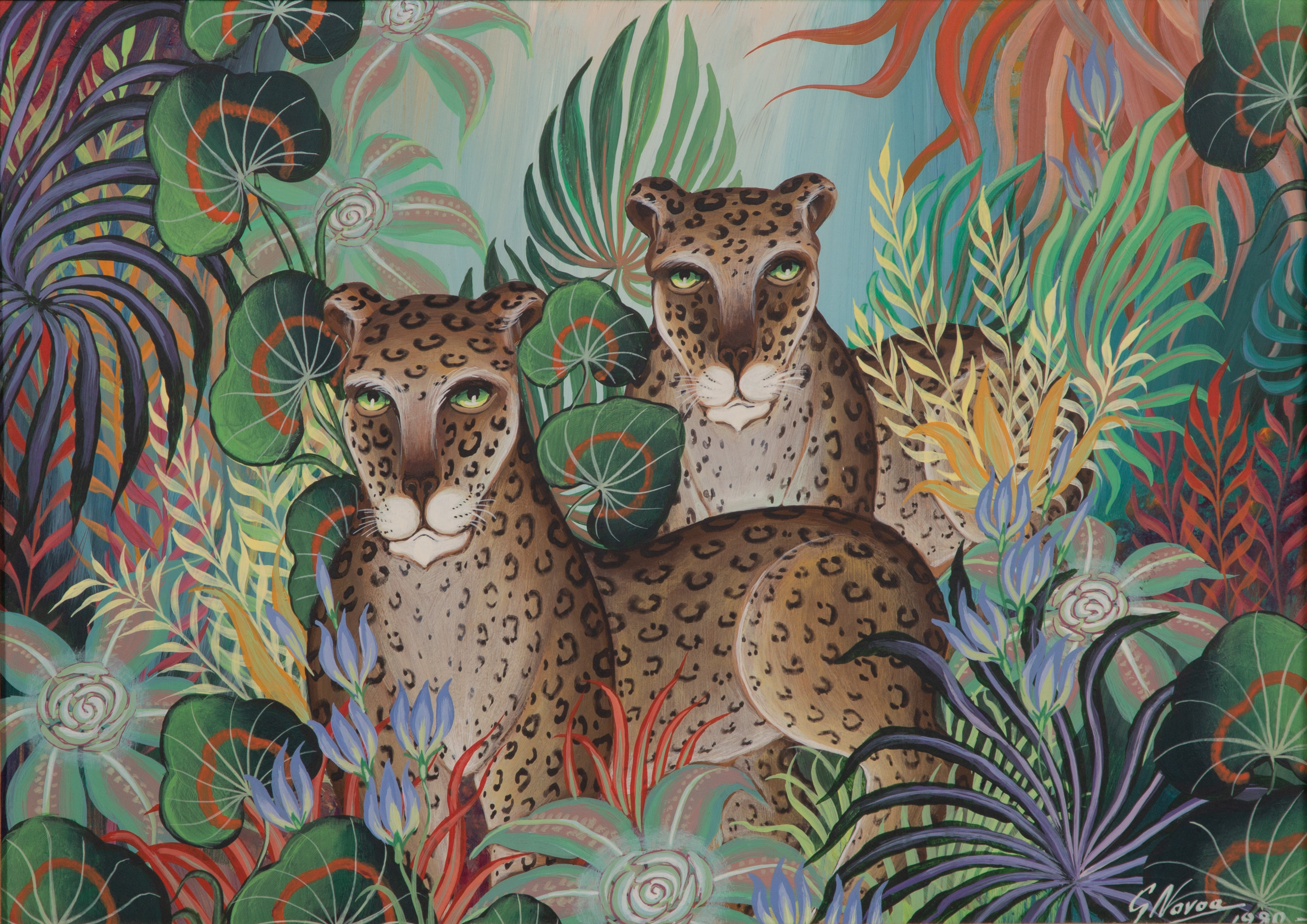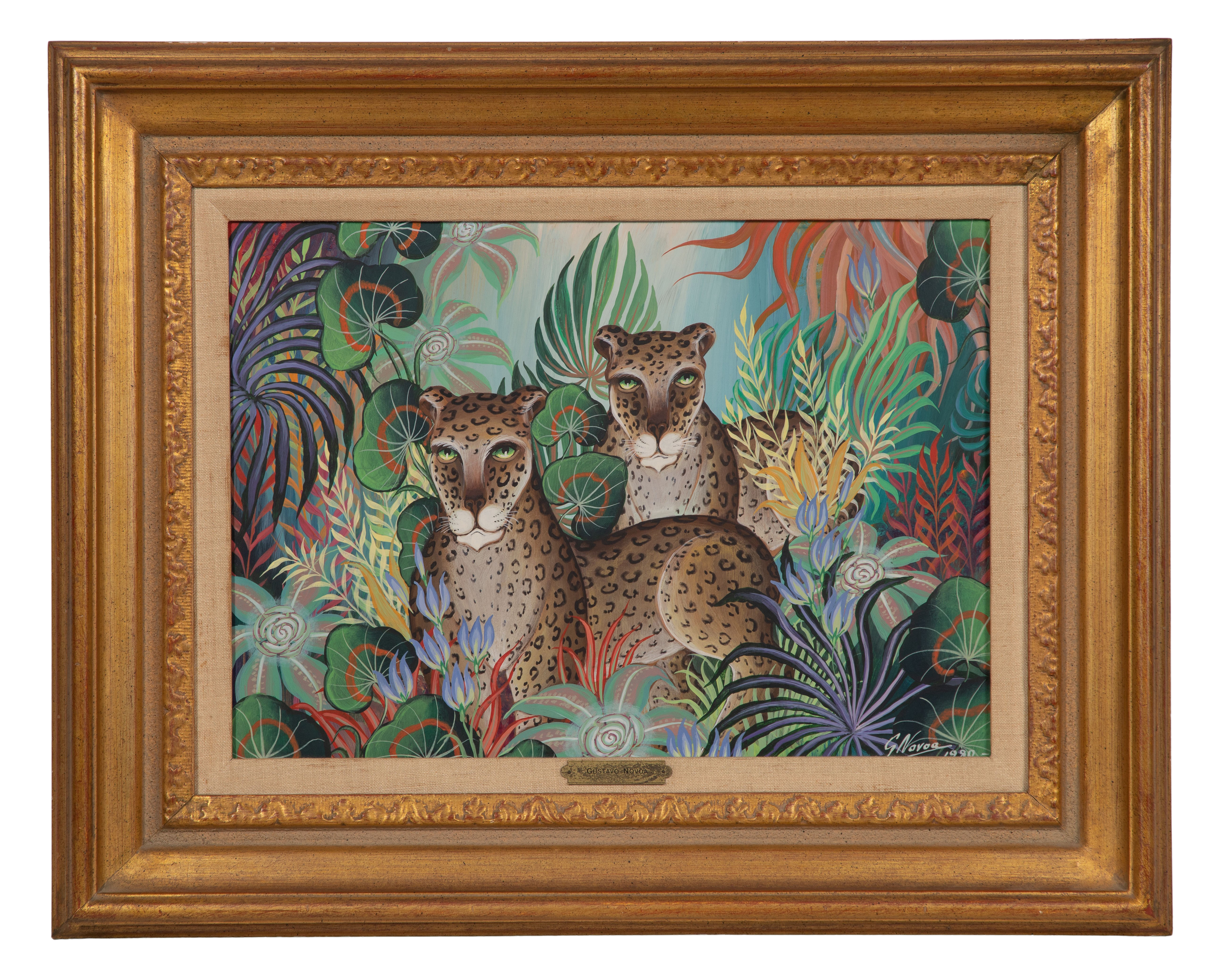 1980, signed and dated lower right, depicting a pair of leopards in a jungle landscape, in a gilt wood frame and linen liner, documents from Wally Findlay Galleries and a bill of sale dated 1980