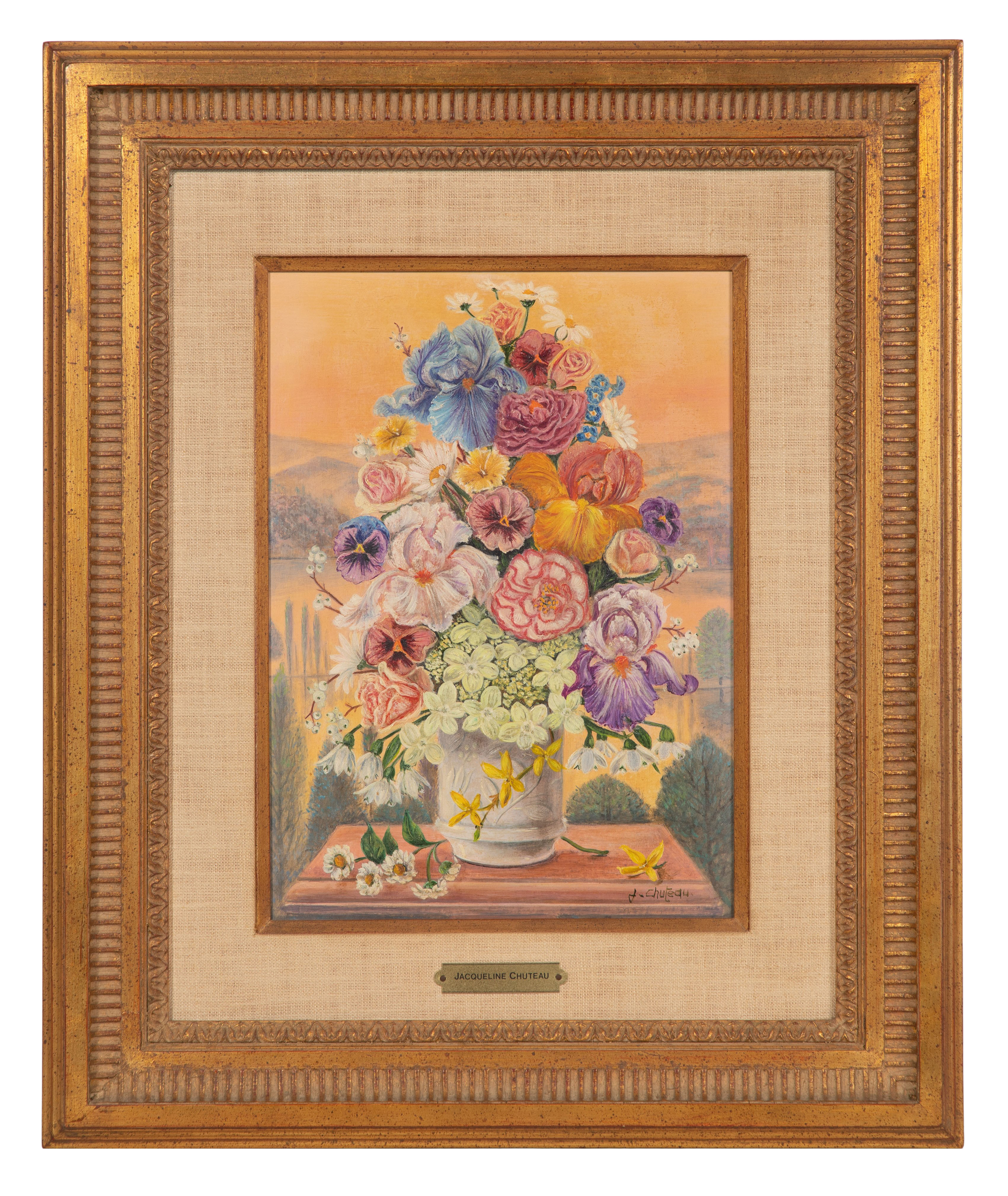 Undated, signed lower right, depicting a floral still life against a landscape, in a gilt wood frame with linen liner, documents from Wally Findlay Galleries, an exhibition catalog featuring the work from 1989 and a bill of sale dated 1990