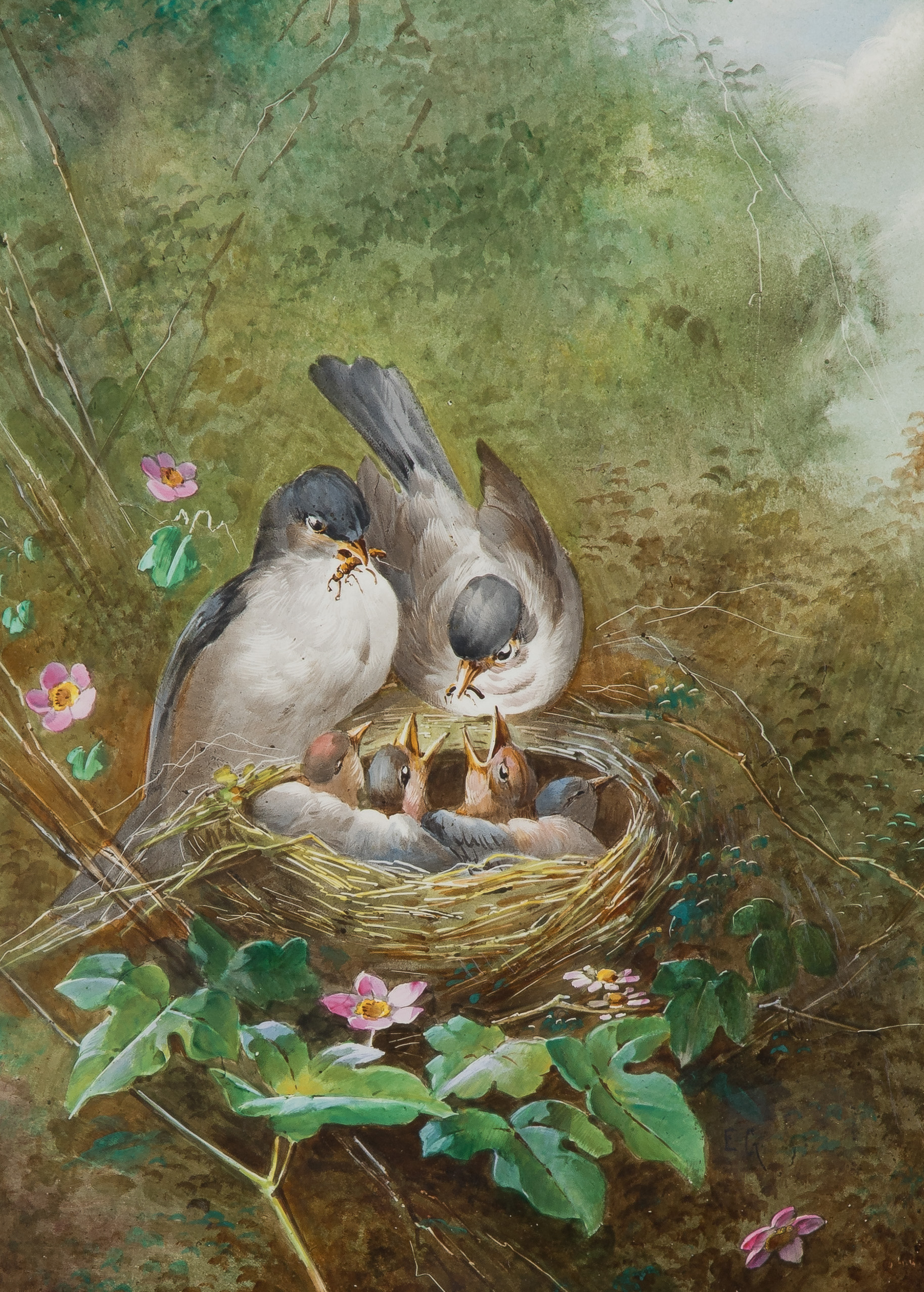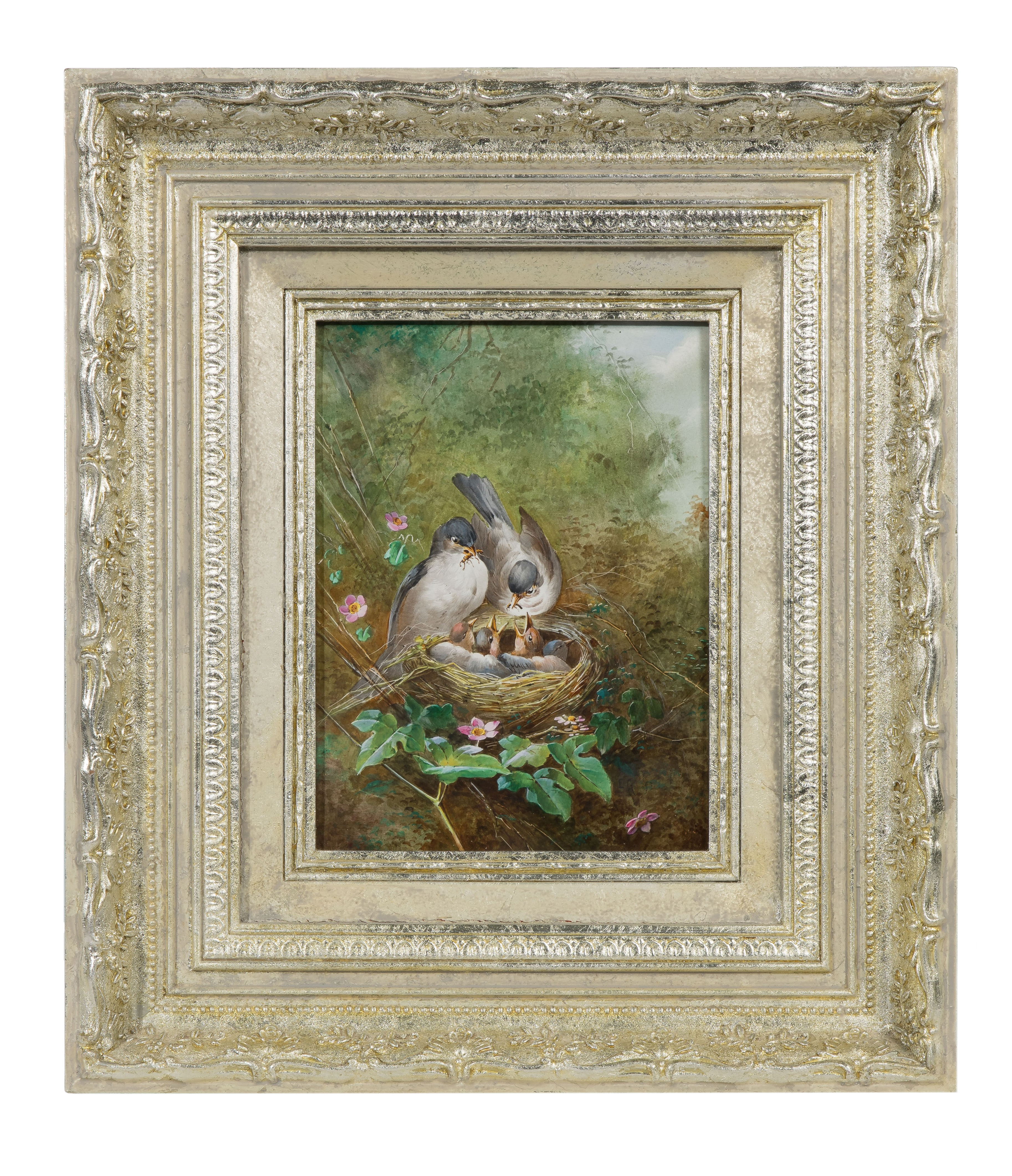 Undated, unsigned, having artist business card stapled to frame, depicting nesting chickadees, in a gold-tone gesso on carved wood frame