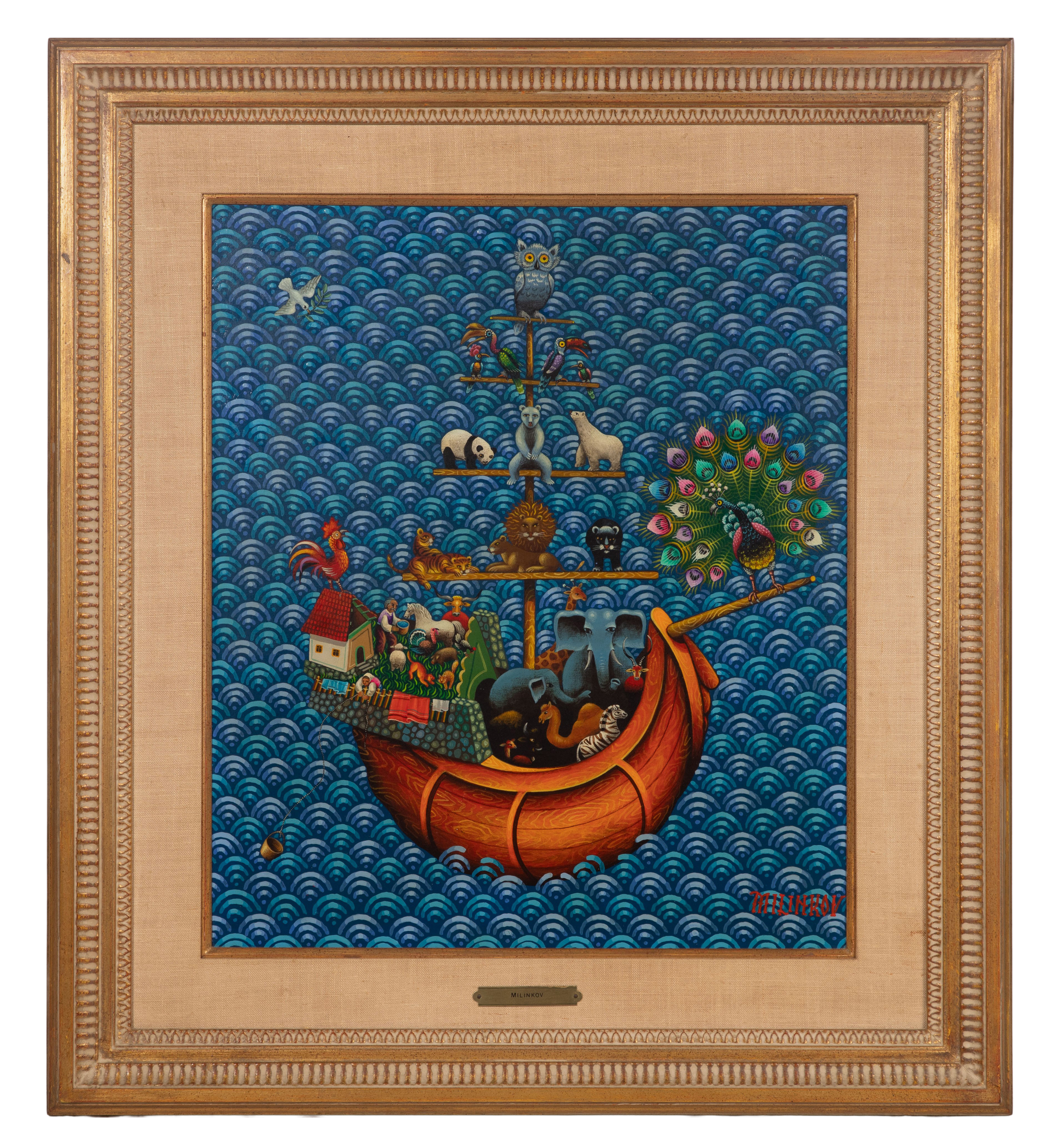 Undated, signed lower right, depicting a stylized Noah’s Ark scene against a patterned blue background, in a gilt wood frame having a linen liner, documents from Wally Findlay Galleries and a bill of sale dated 1986