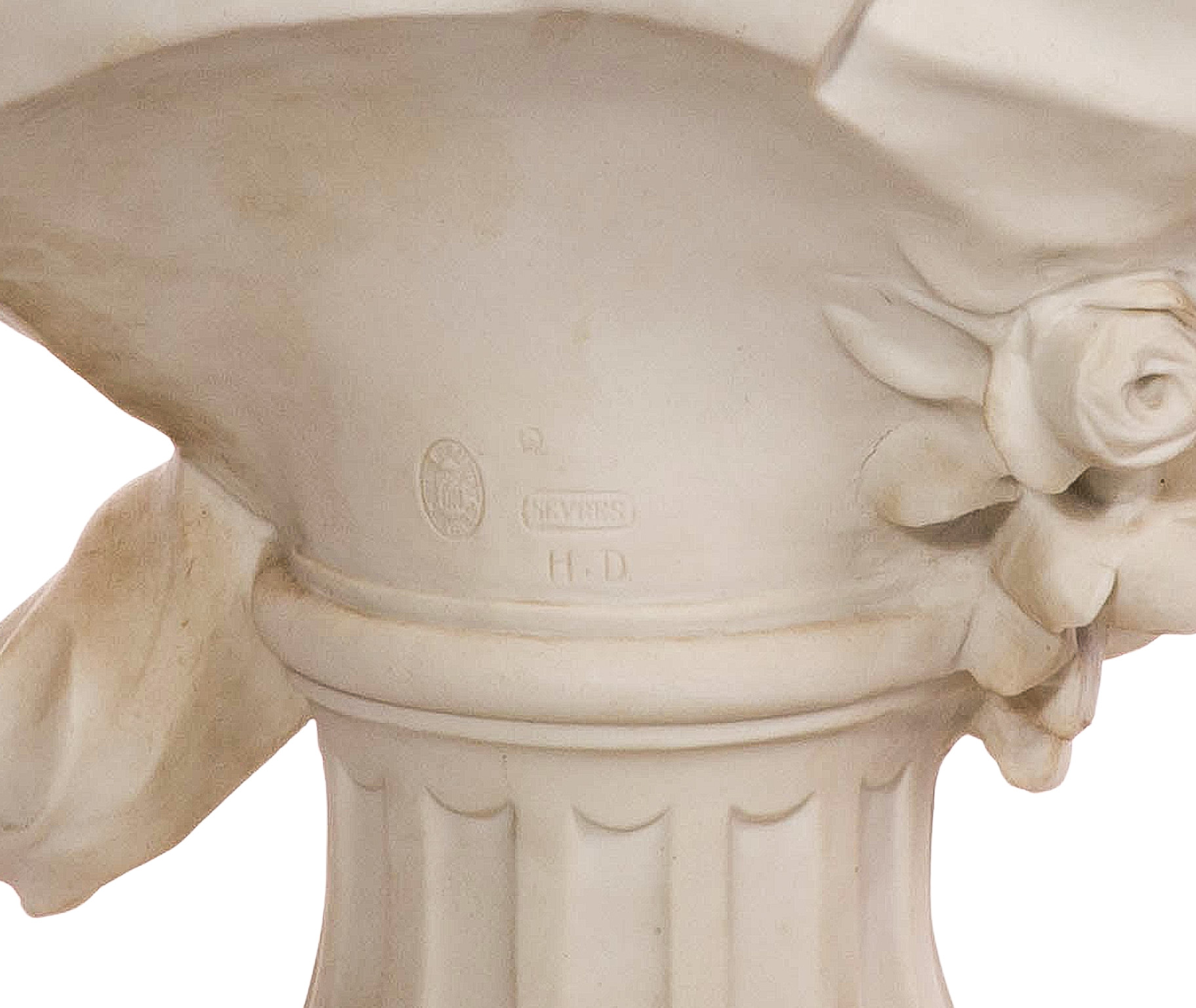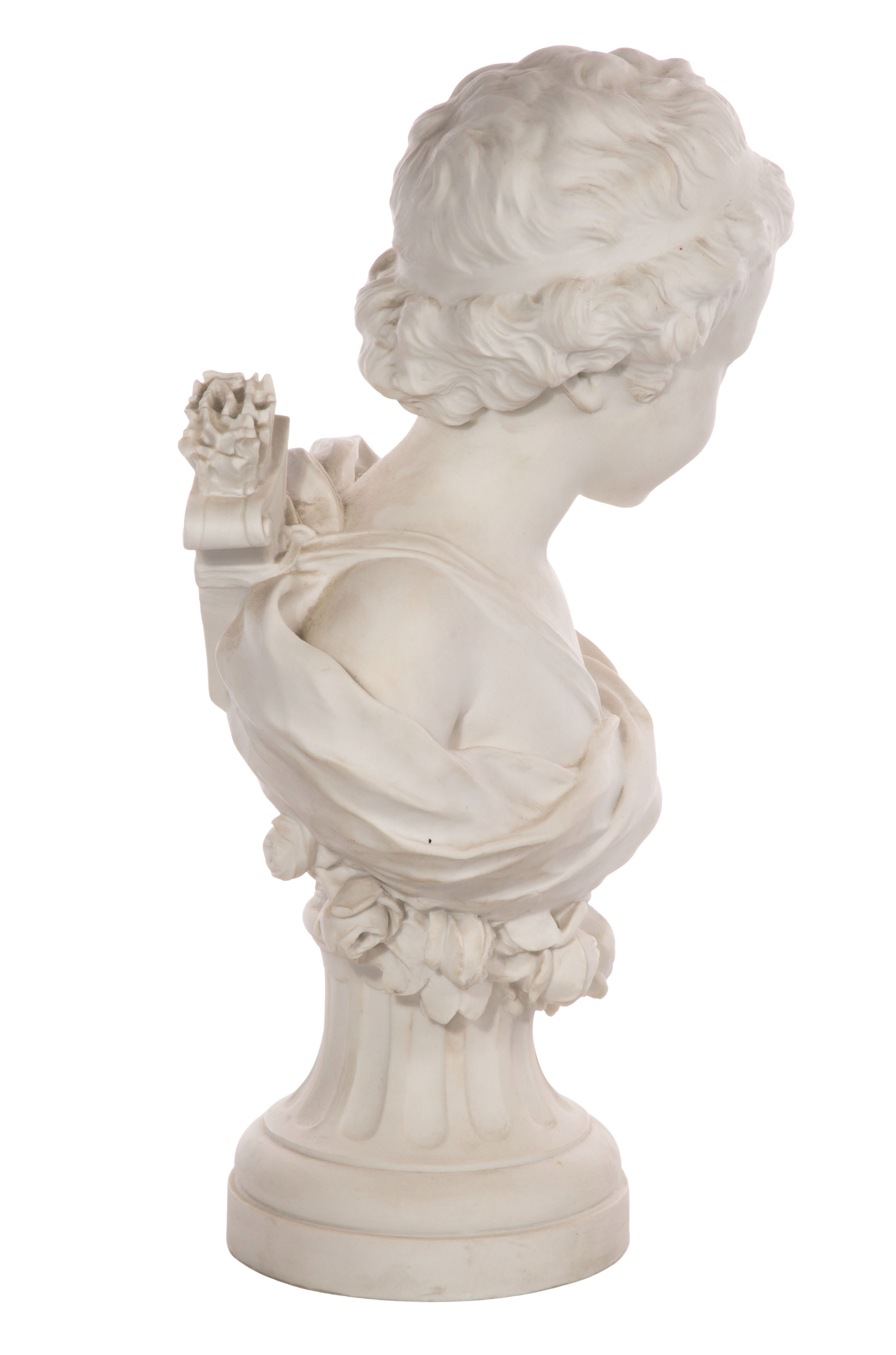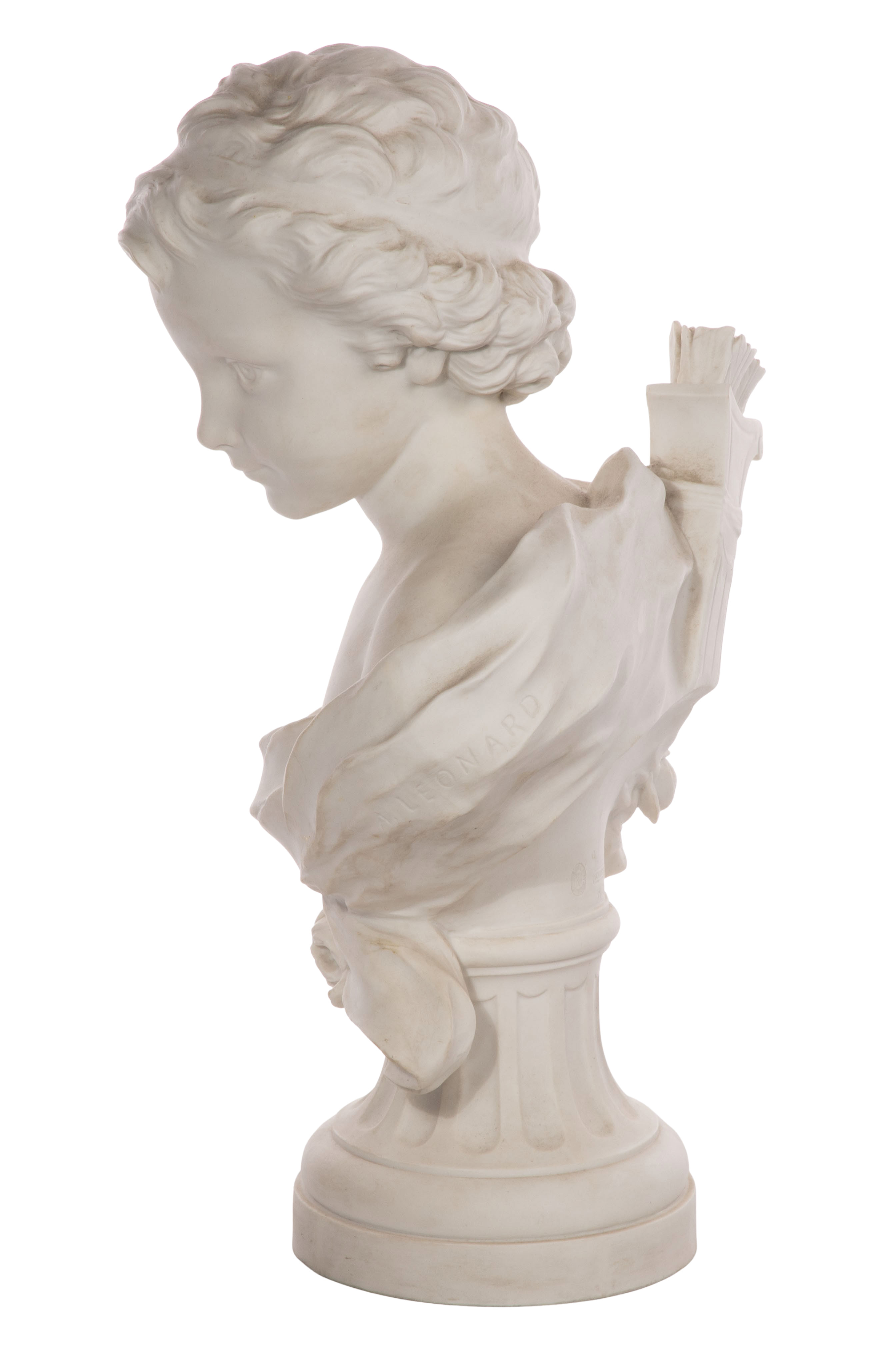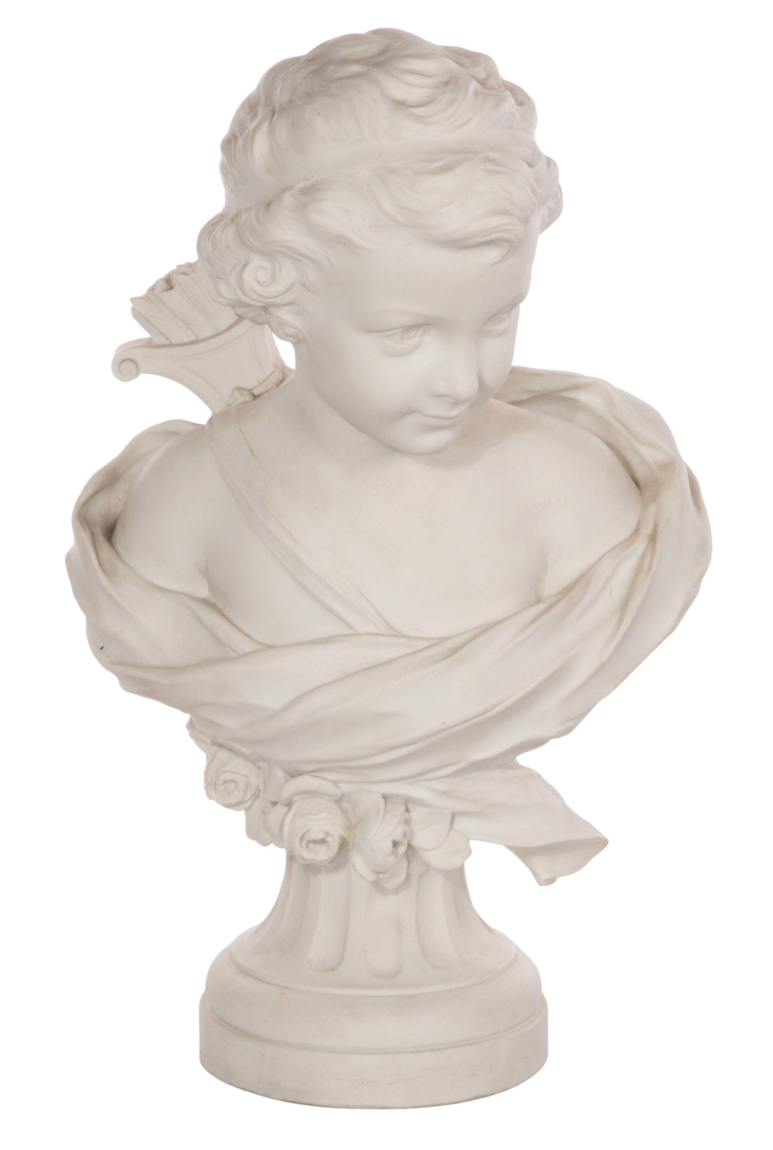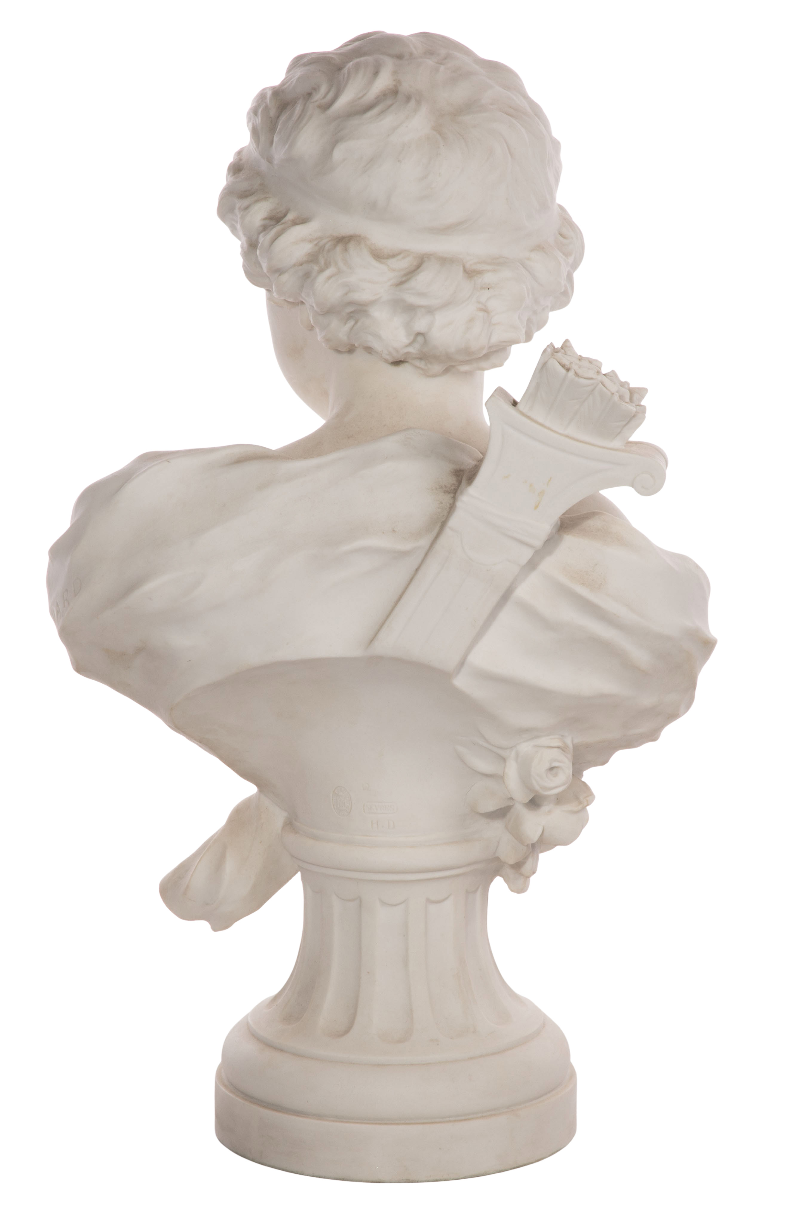 Undated bisque porcelain bust depicting Cupid having a quiver filled with arrows on his back, Sevres 1919 DN seal impressed on back side