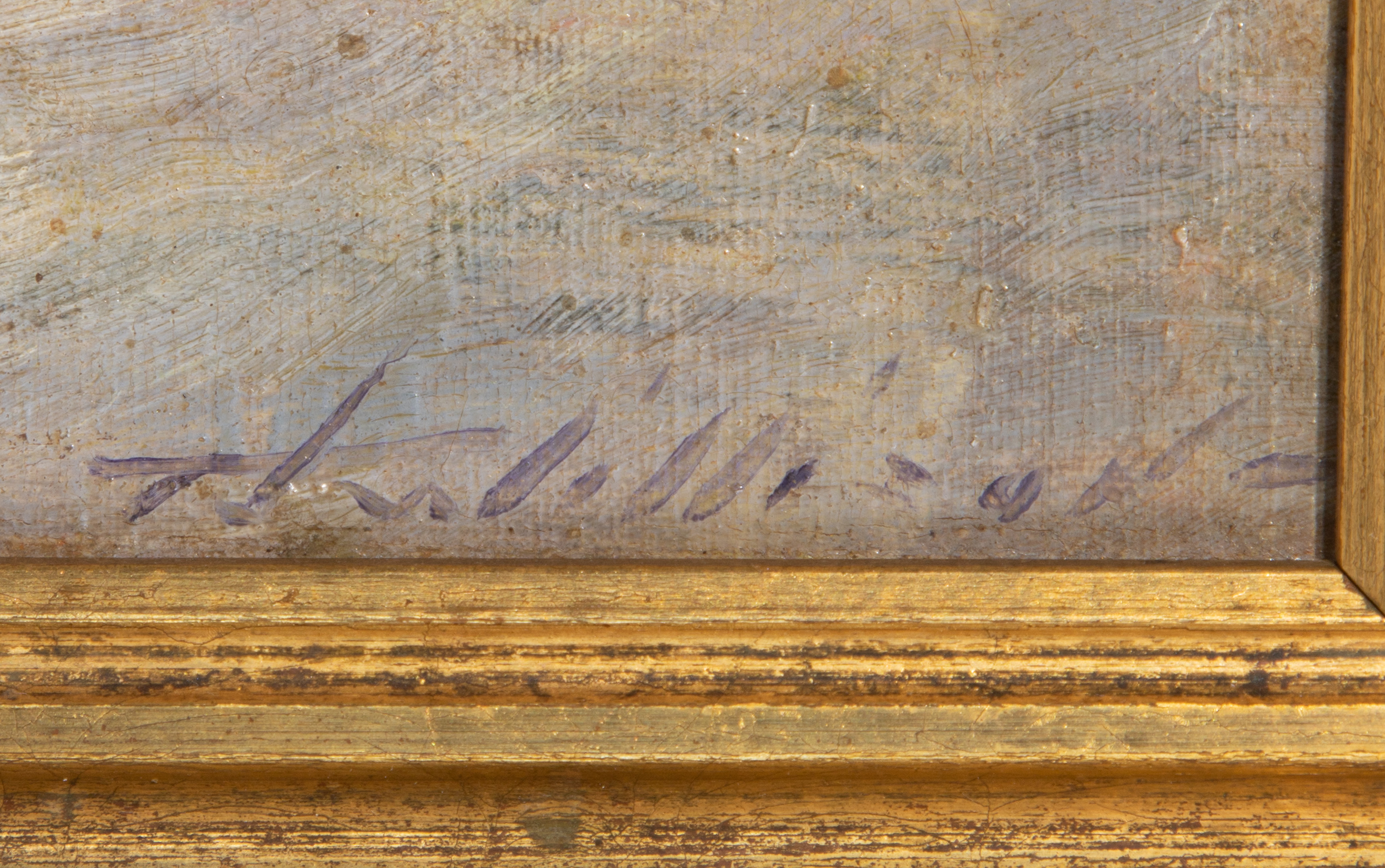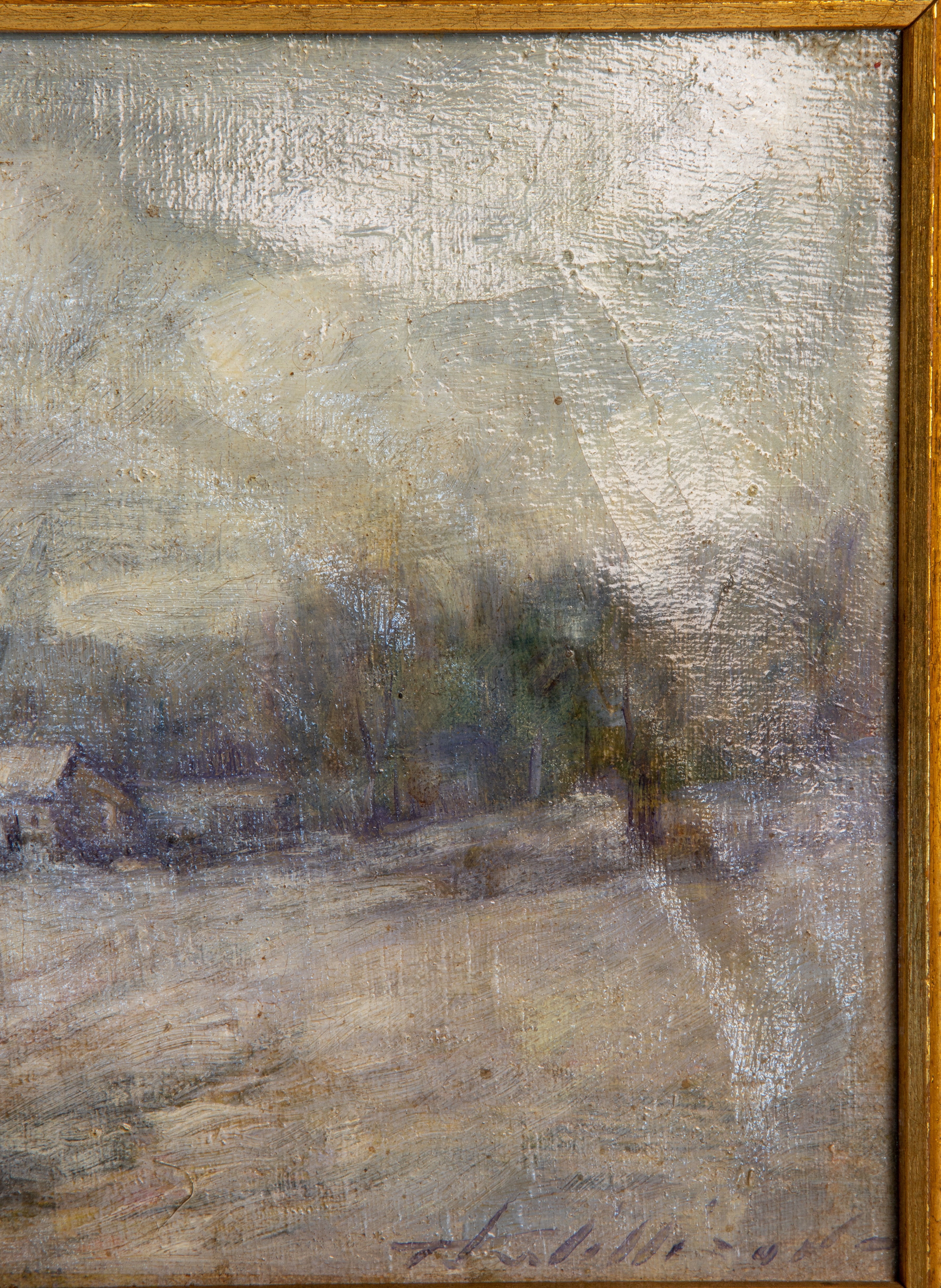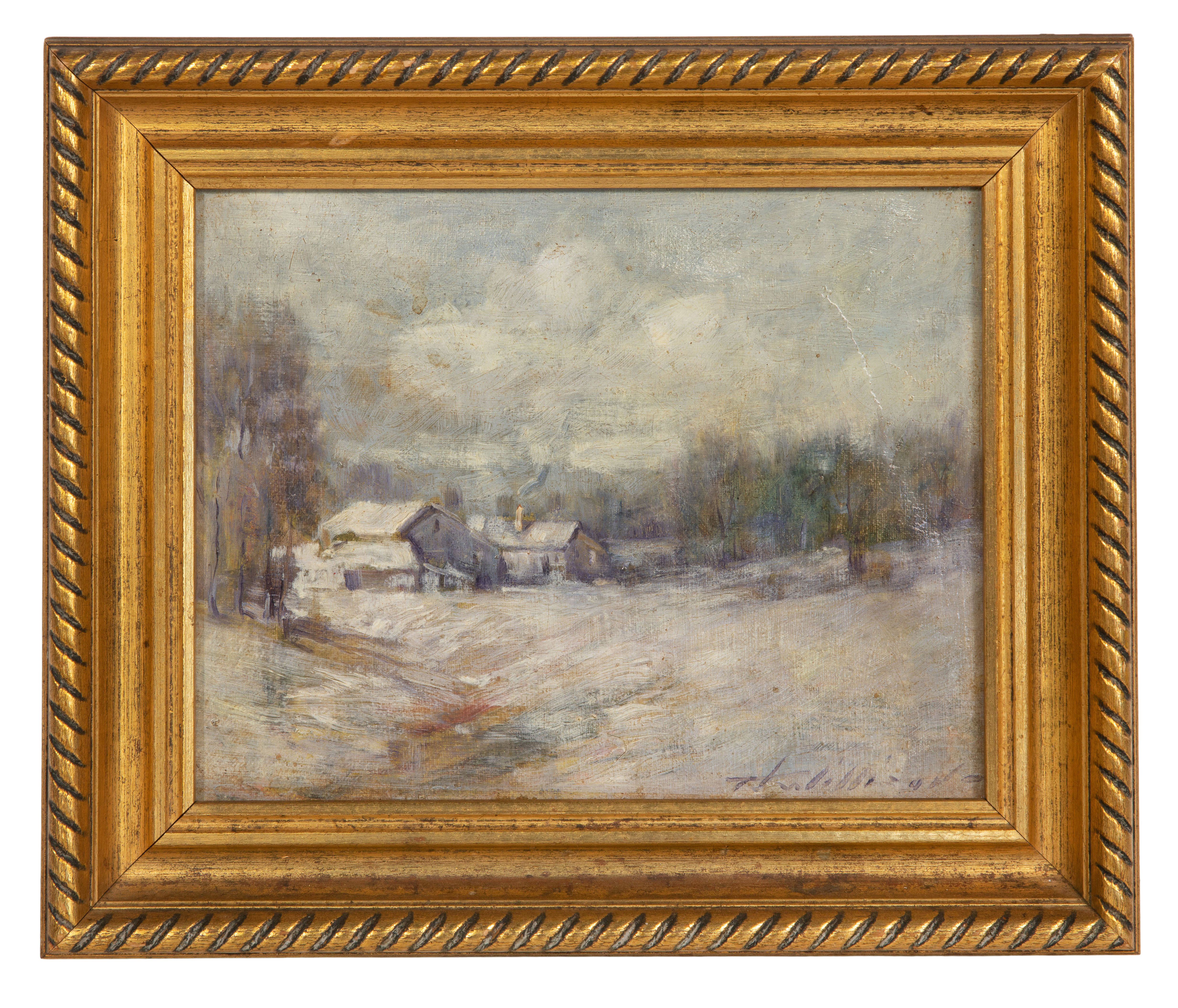 Undated, indistinctly signed lower right, depicting a farmstead in snow, in a gold-tone carved wood frame