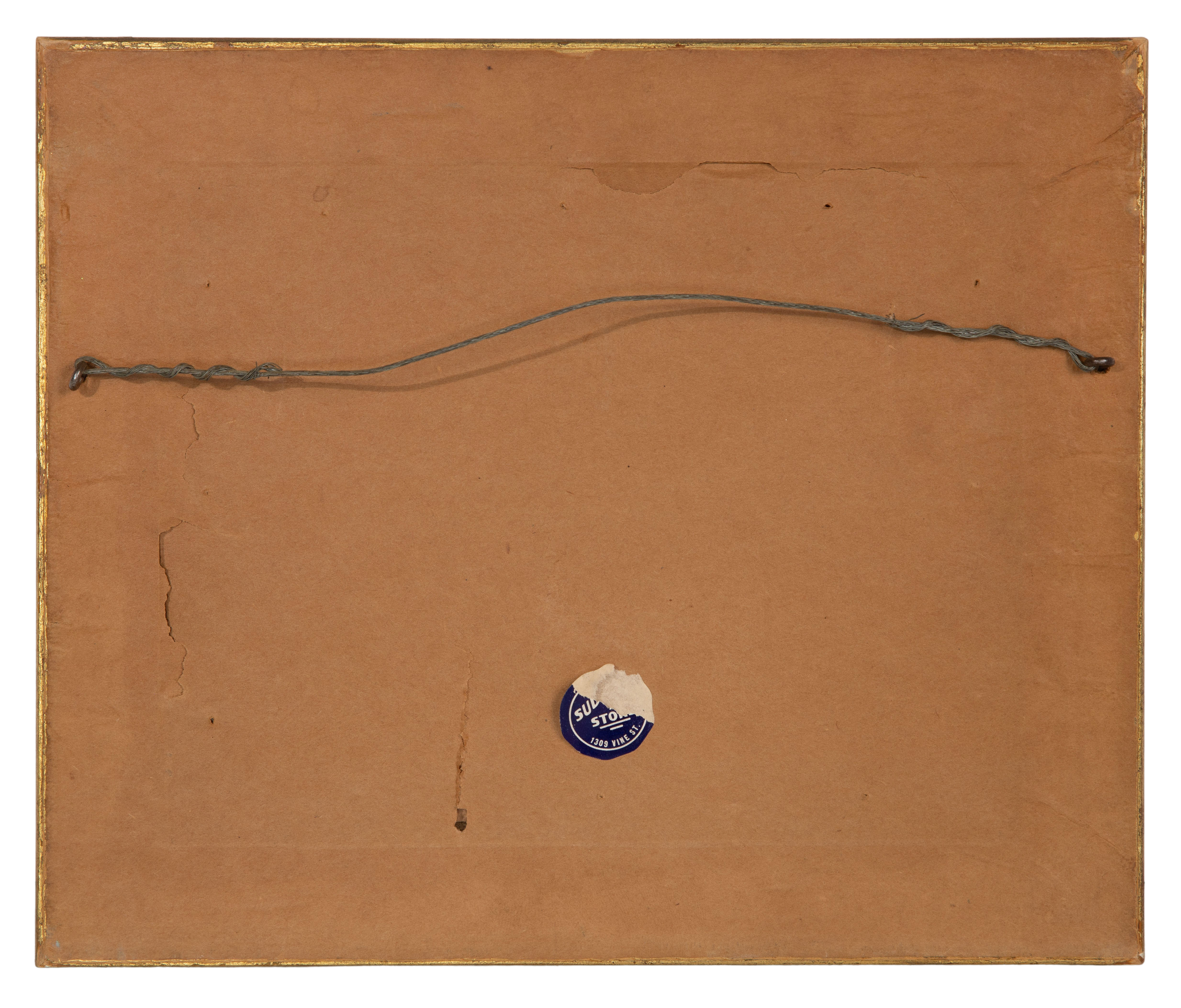 Condition: canvas warped and lifting from board at top and right, liquid spotting upper left quadrant, frame having light wear