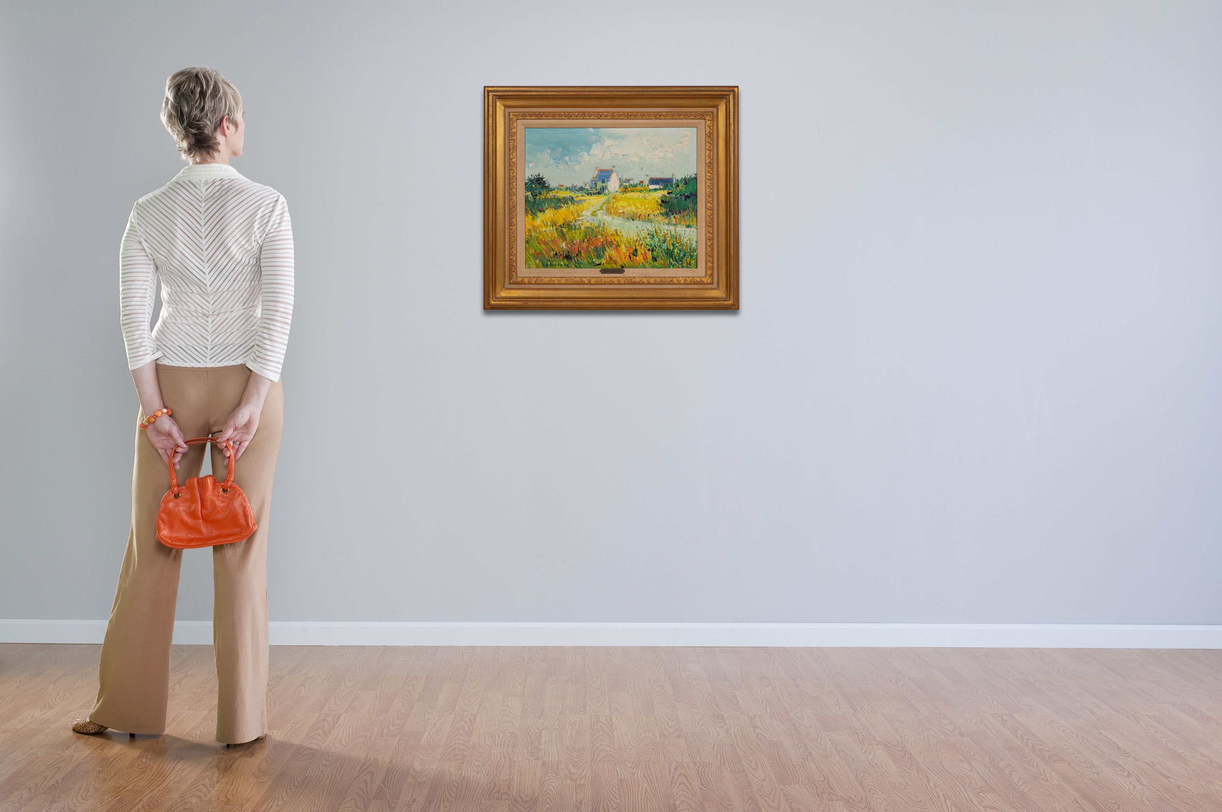 Undated, signed lower left, depicting a landscape of wheat fields and distant houses in impasto technique, in a gilt wood frame having a linen liner, documents from Wally Findlay Galleries and a bill of sale dated 1978