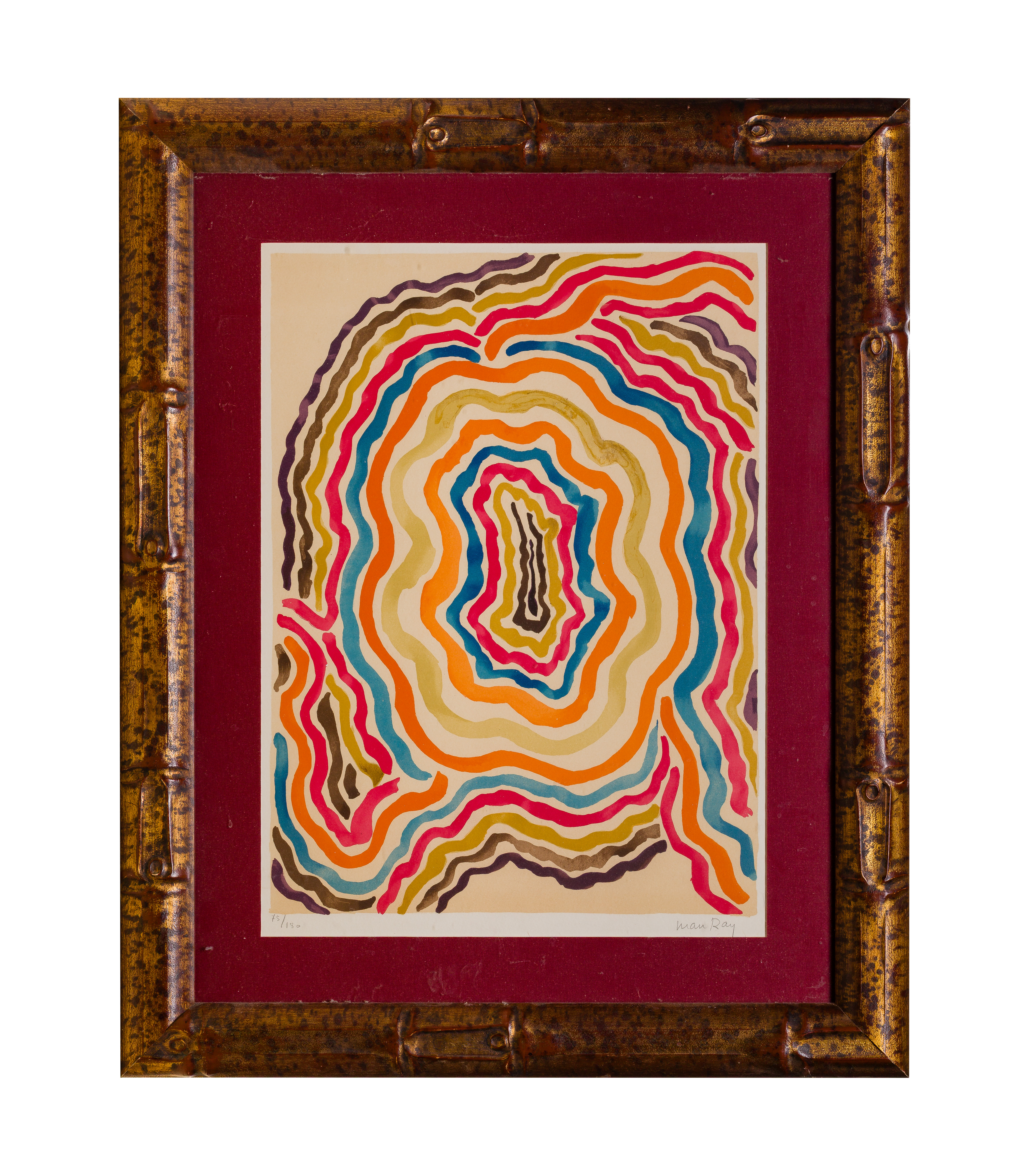 1971, pencil signed and #75/180 to the lower margin, depicting an abstract composition of irregular concentric rings in bright colors, pulled from the portfolio ‘De l’Origine des Especes par Voie de Selection Irrationelle’, published be Leon Amiel and Galleria Schwarz, New York and Milan, matted and framed under acrylic in a gold-toned wood frame