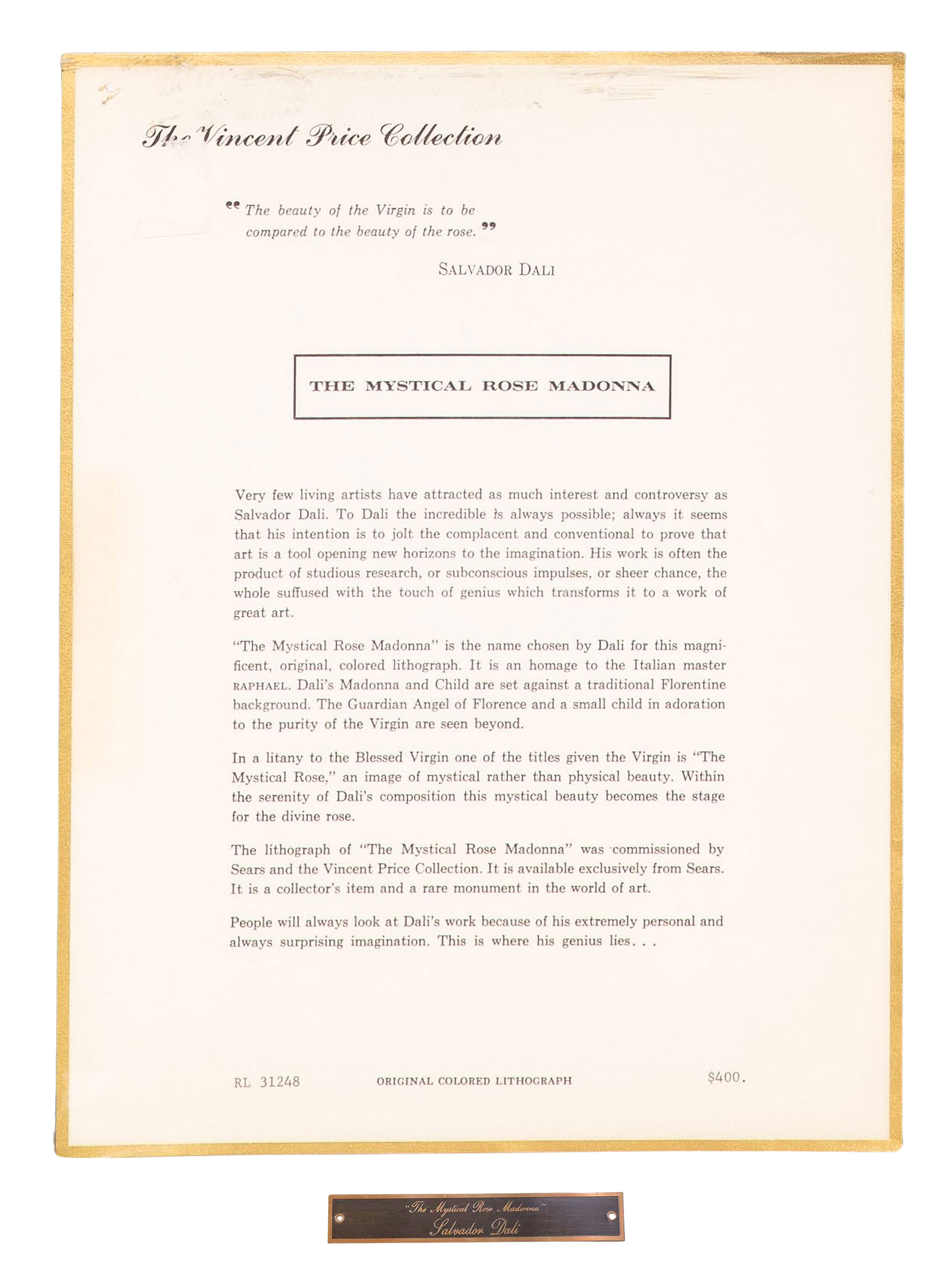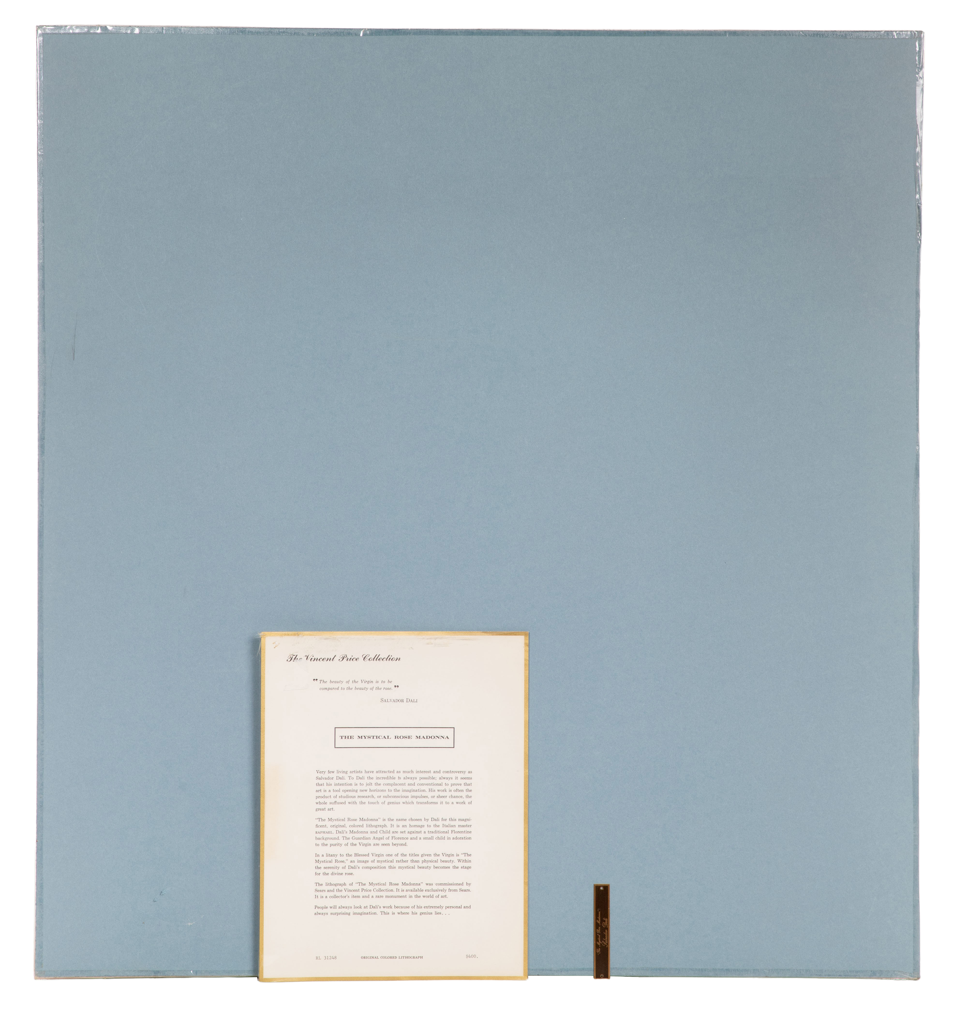 1969, pencil signed, #8/300, commissioned and published by Sears Roebuck & Co for the Vincent Price Collection, unframed, including original frame placard and papers