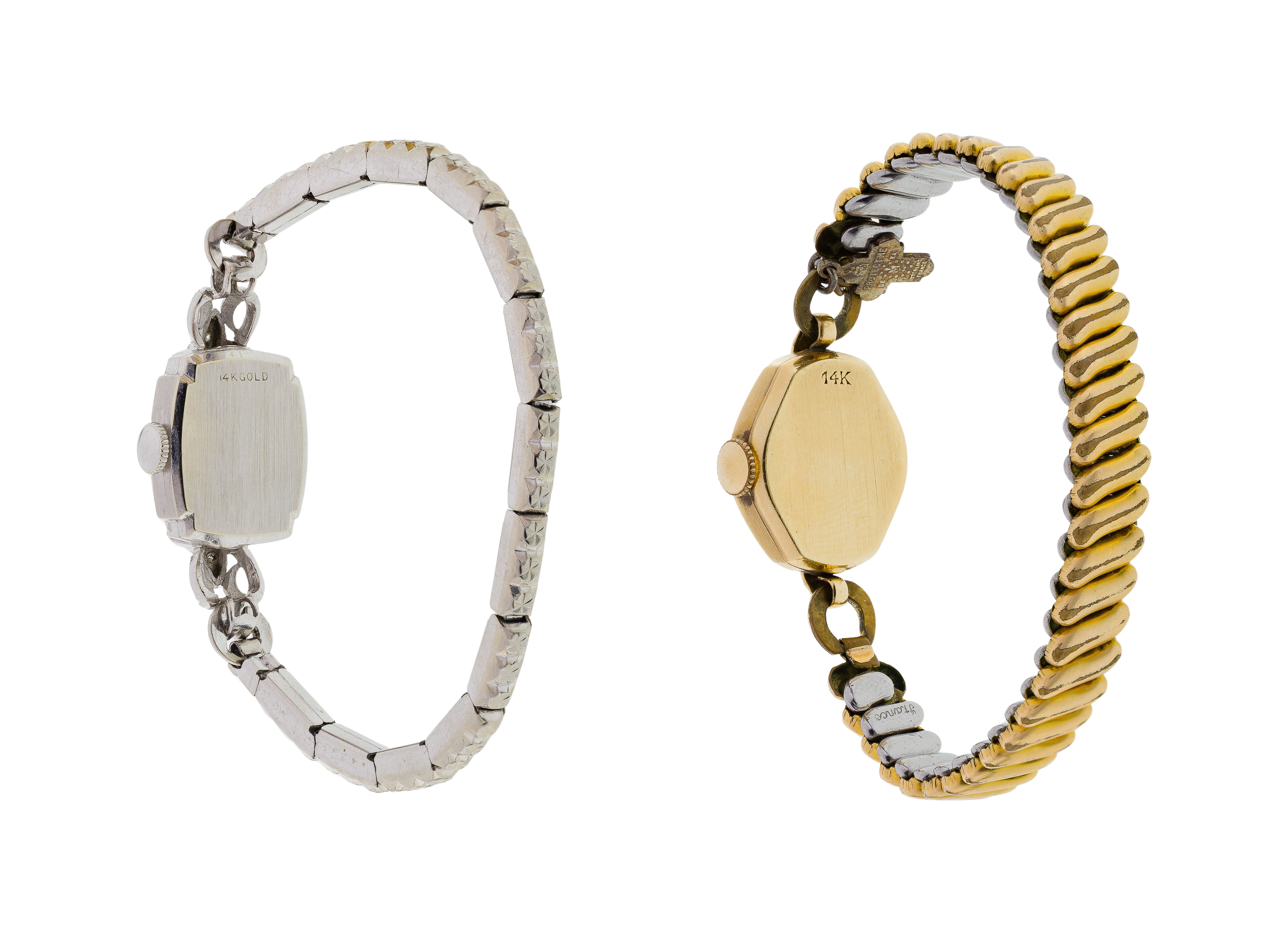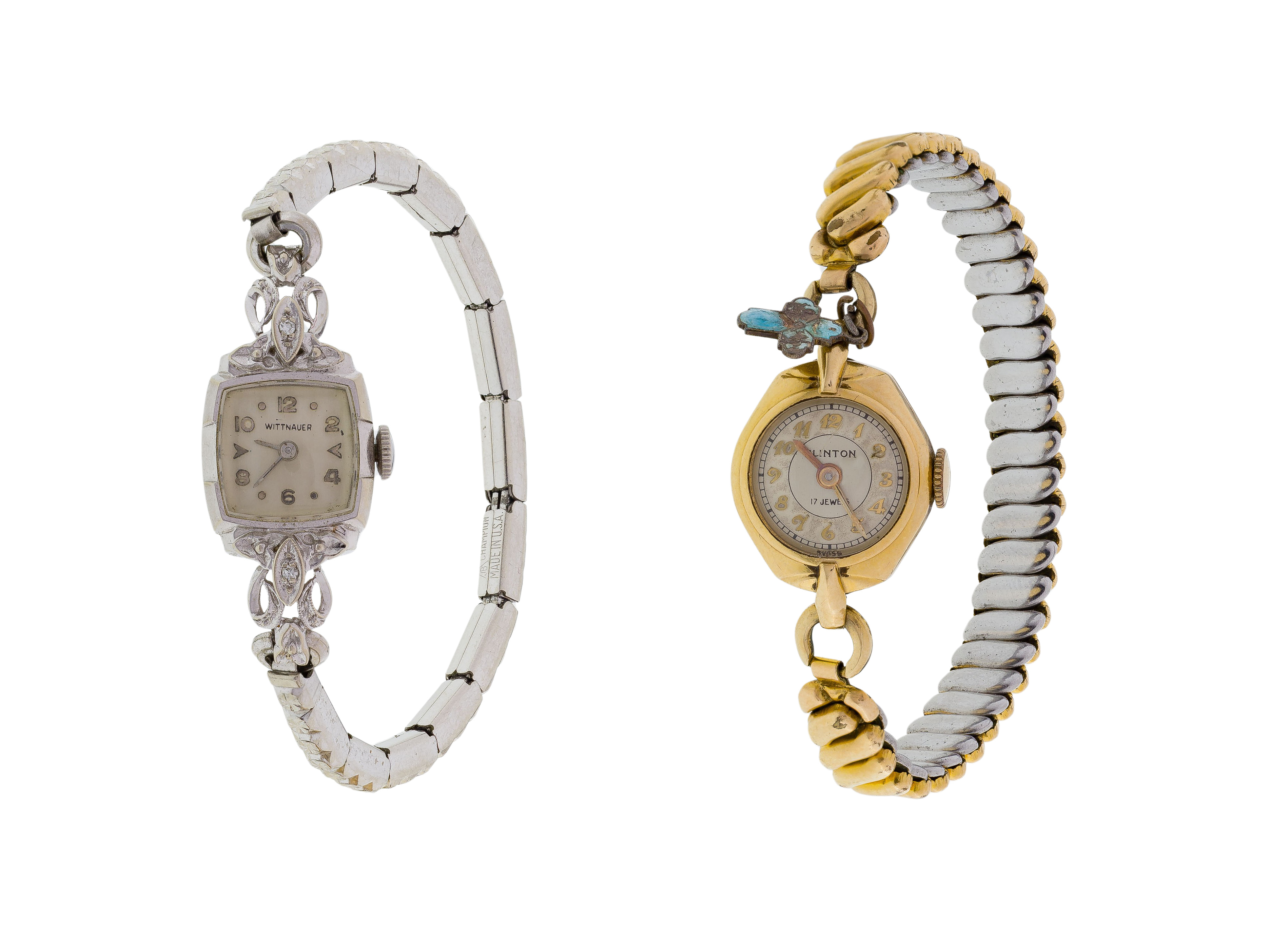 (2) items including a Clinton yellow gold case having a 17-jewel movement and a Wittnauer white gold case having two round cut diamonds, both on stretchable, non-gold bands (both marked ’14k’ on back of case)