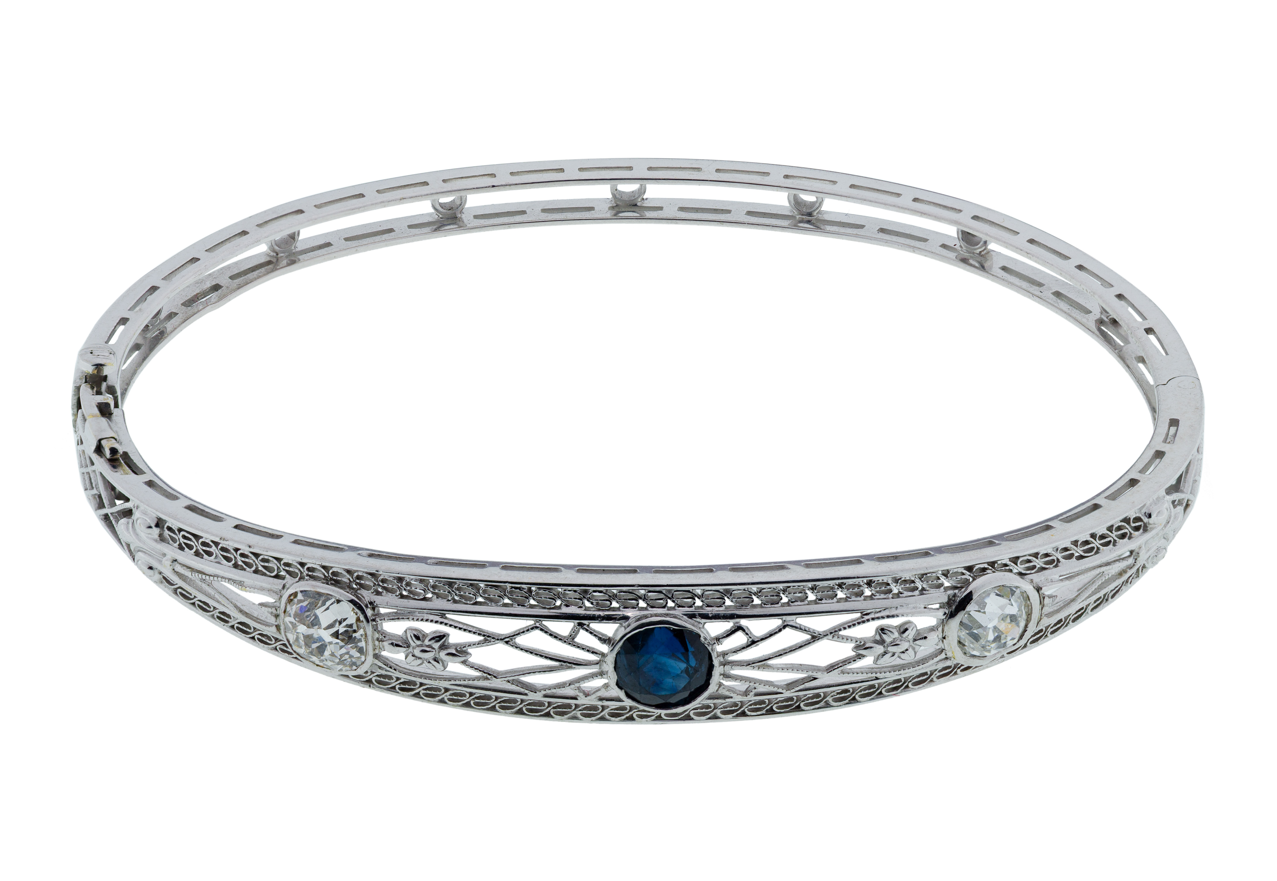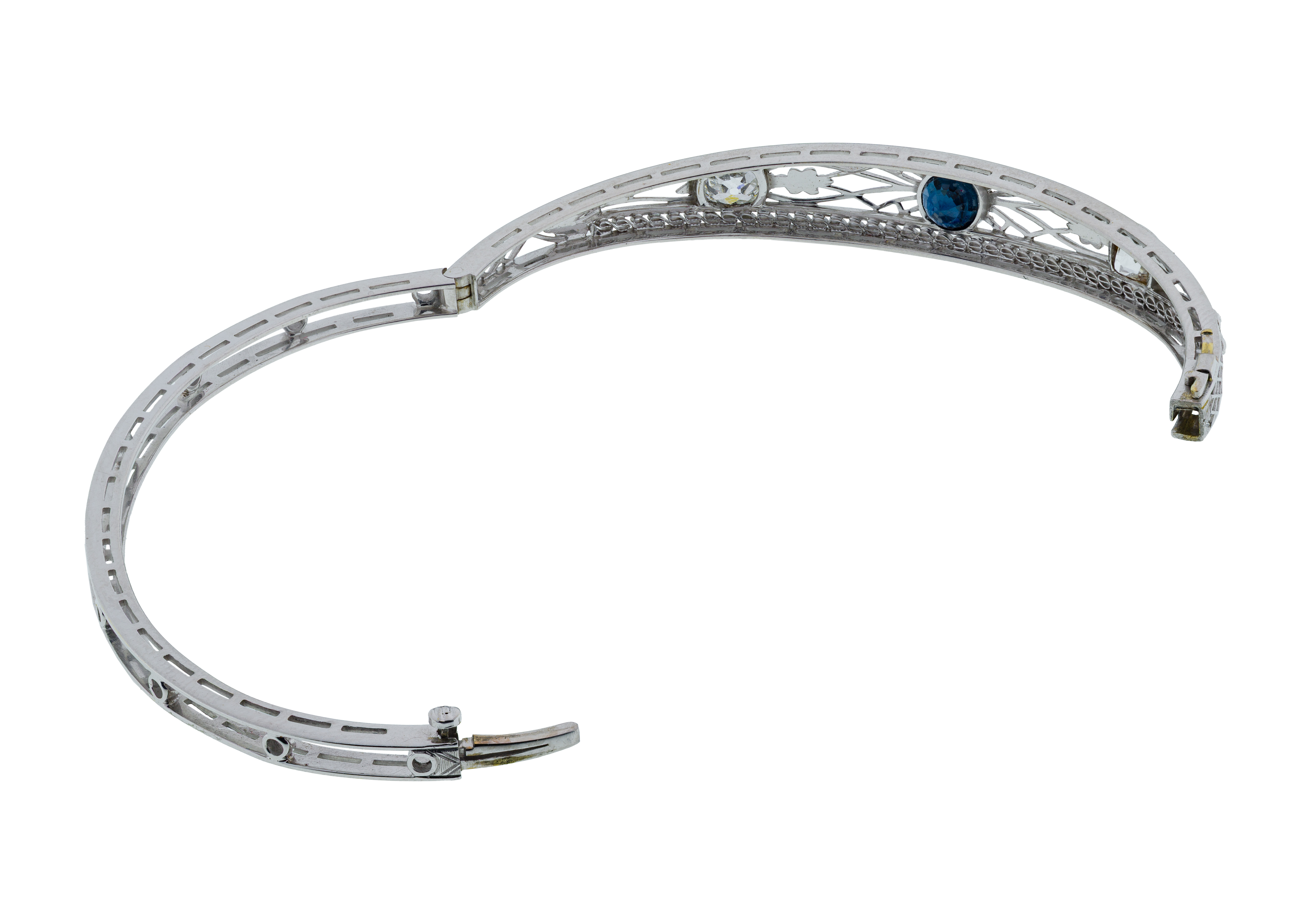 14k White Gold, Sapphire and Diamond Hinged Bangle Bracelet