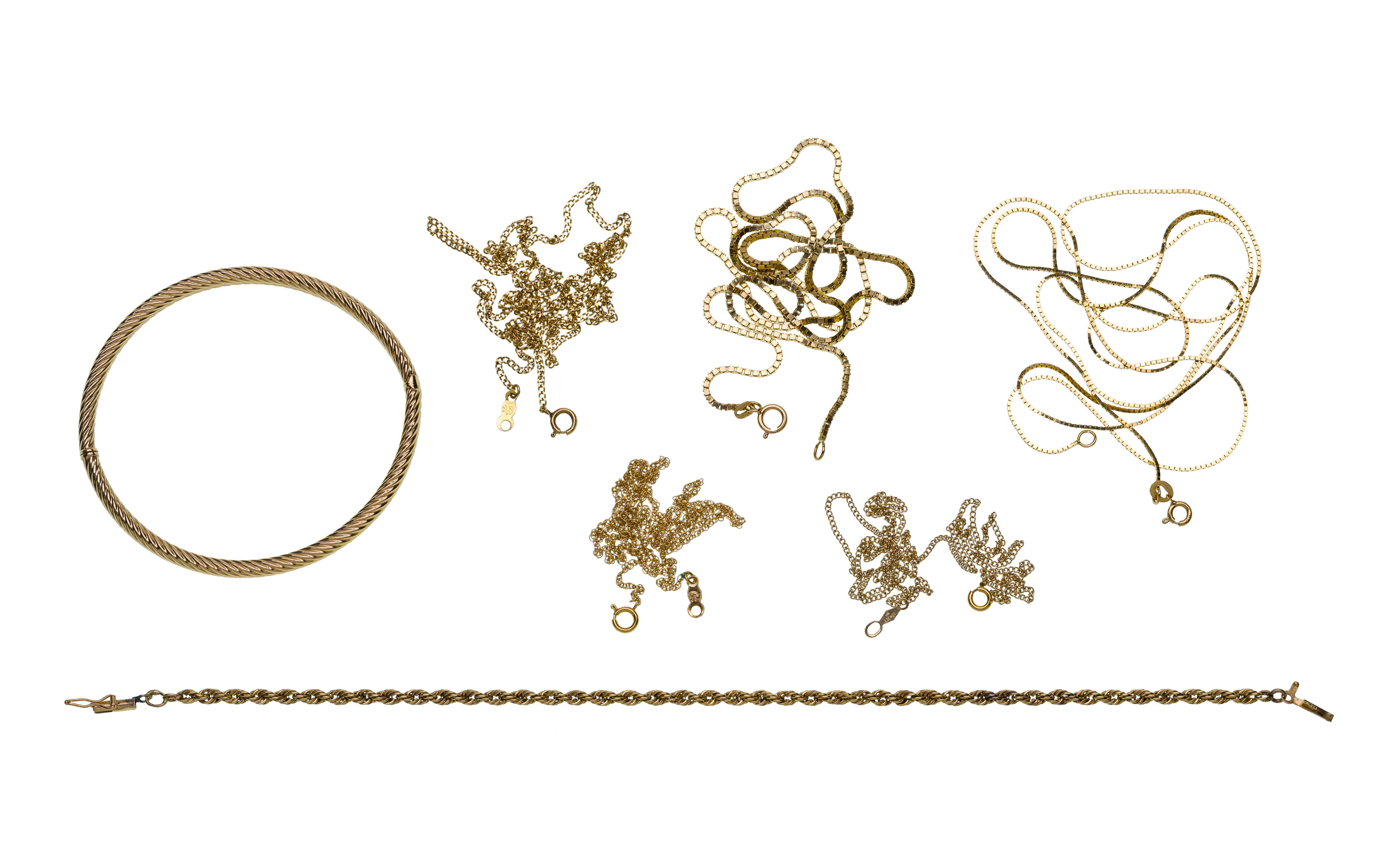 (7) items including (5) necklaces, a twisted rope bracelet and a hinged bangle bracelet (all marked ’14k’ / ‘585’)