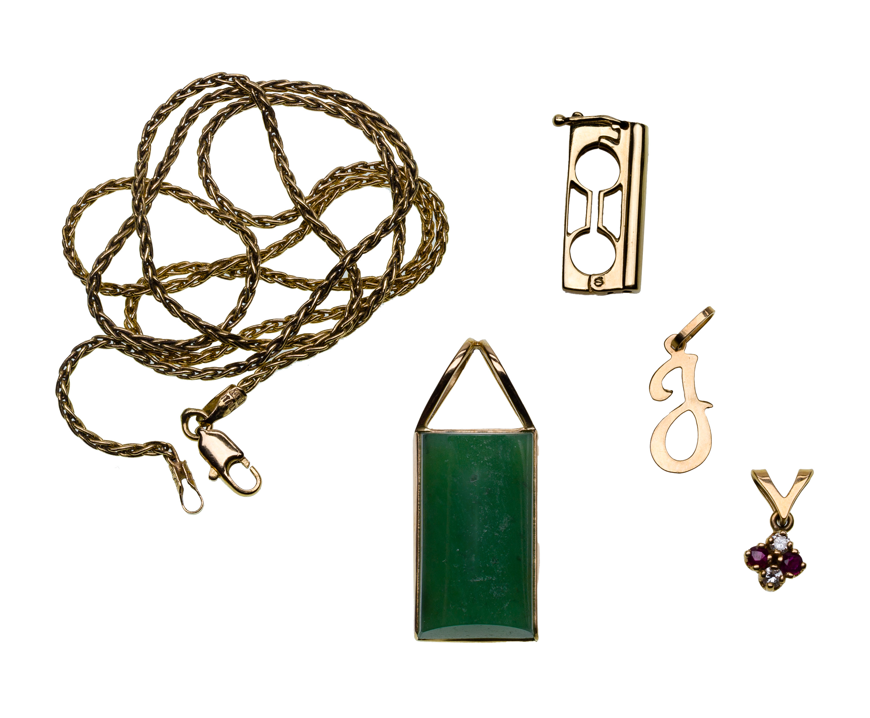 overall light wear consistent with normal use, jadeite jade pendant unmarked but XRF tested as 14k gold