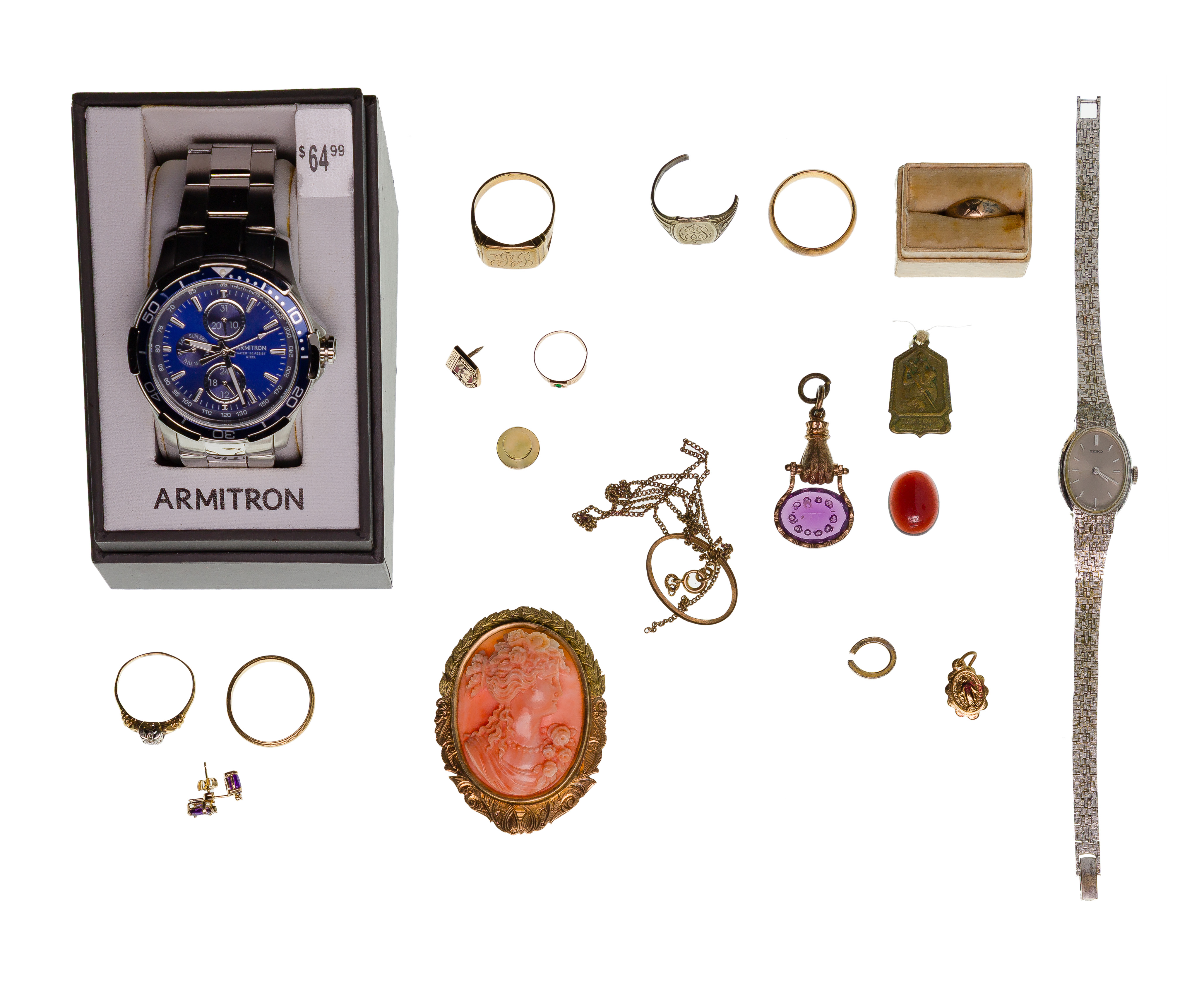 (19) items including a carved shell cameo, a band ring, a ring having a round cut diamond and a pair of pierced earrings having oval cut amethyst adorned with a diamond (all marked ’14k’), a signet ring, a baby ring and a lapel pin (marked ’10K’), a band ring and a signet ring (unmarked 10k) as well as an Armitron wristwatch in original box and costume jewelry including a wristwatch, a fob, charms and scrap