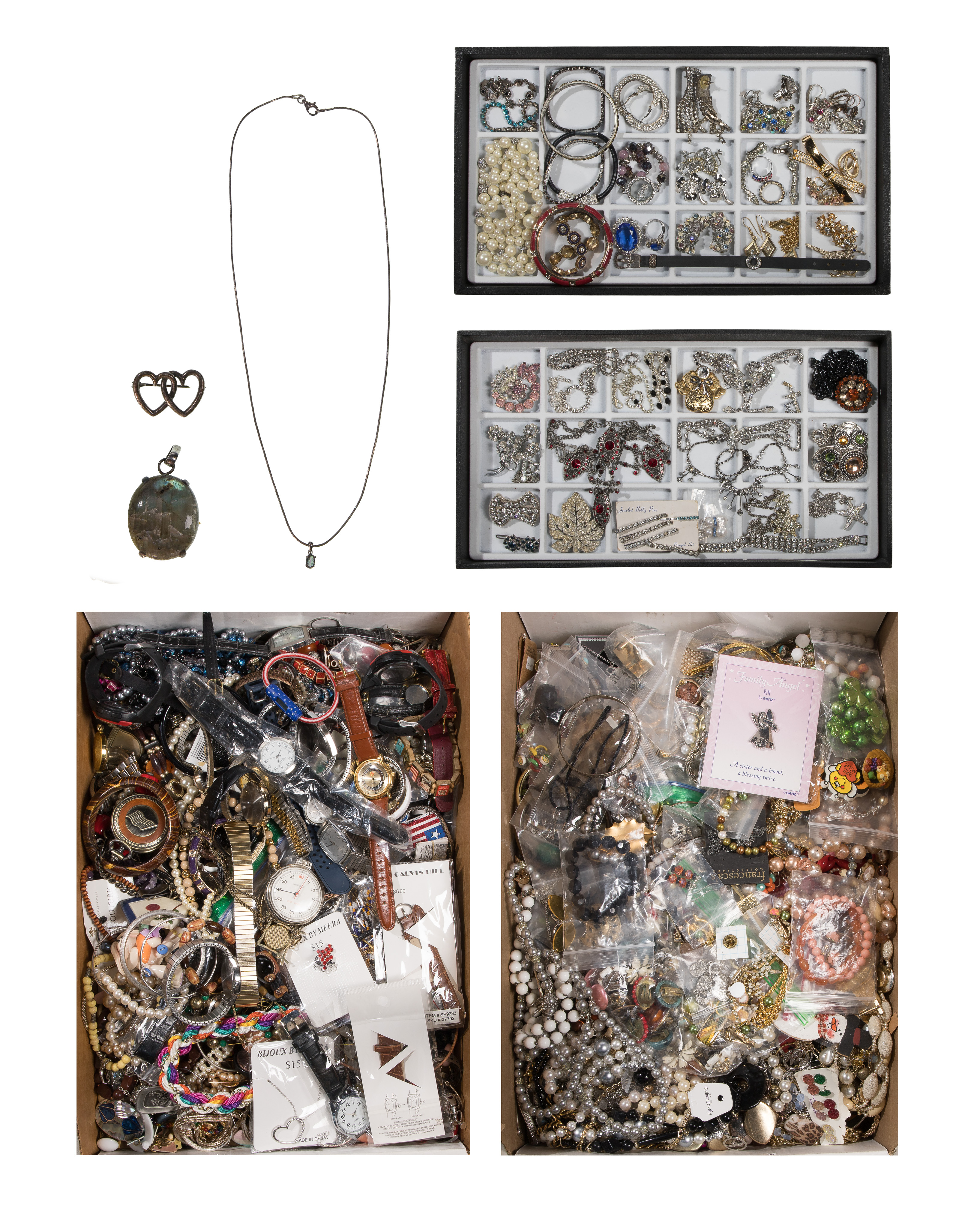Disclaimers: some items may be bent or broken, missing stones or missing their mates; display trays not included