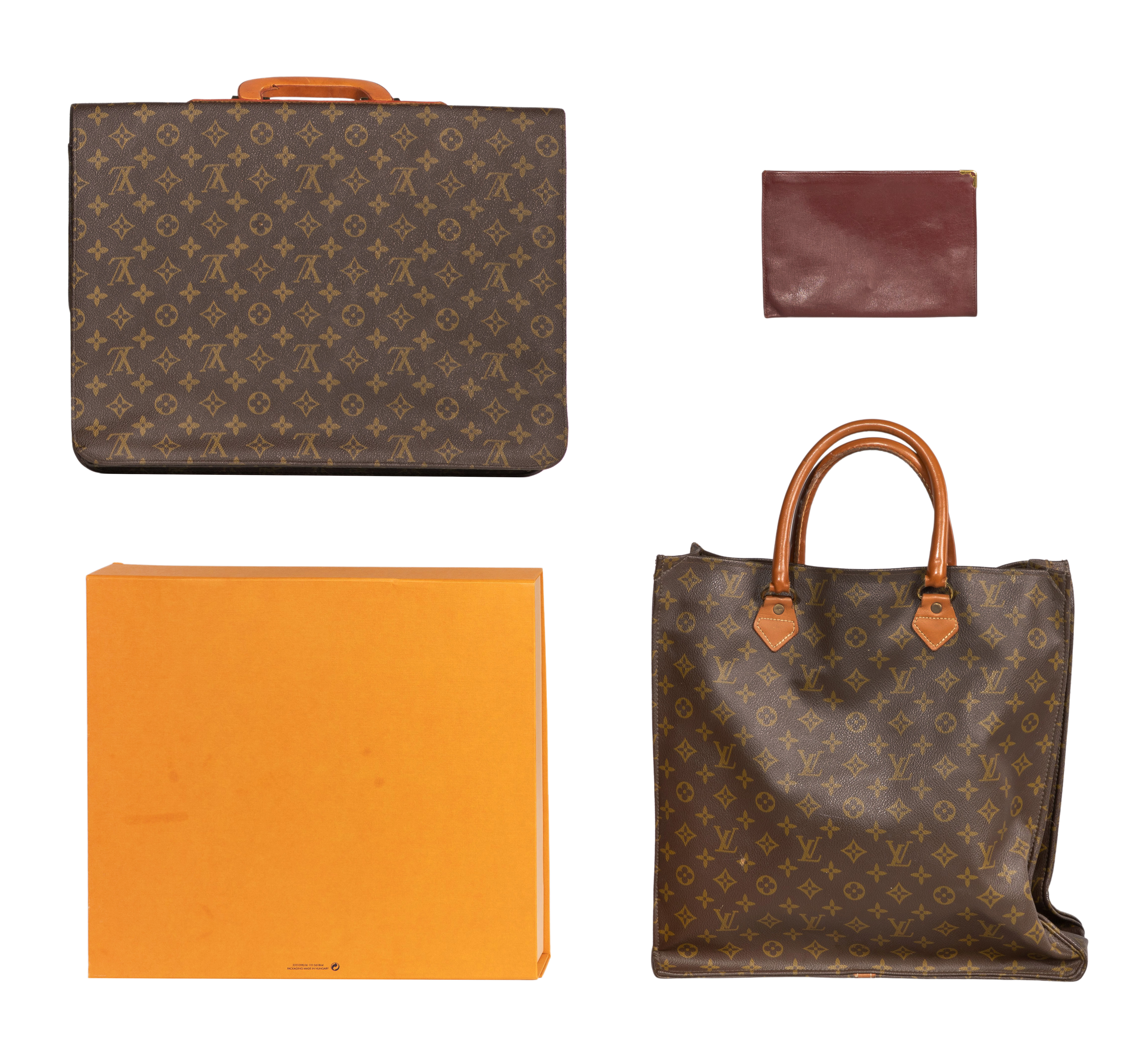 (3) items including a Laguito briefcase having monogrammed canvas, flat squared handle, front flap and three interior pockets, a Sac Plat tote having monogrammed canvas and leather handles as well as a Cartier monogrammed burgundy pouch and a Lois Vuitton box having dust bag inside