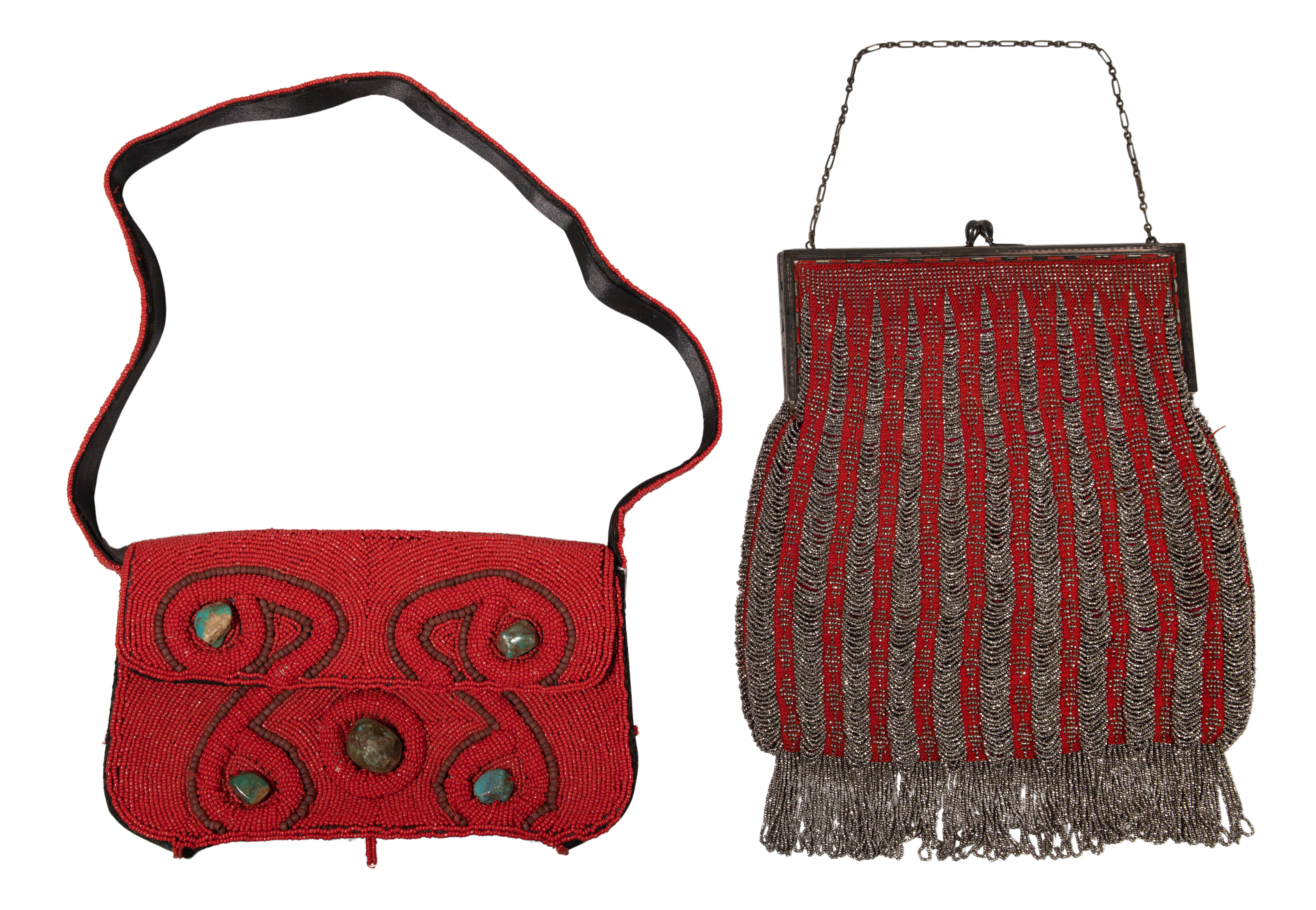 (2) items including a Barse bag having shoulder strap, coral color glass beadwork and applied turquoise stones, label to interior as well as an unmarked cut steel beaded flapper purse having a short chain attached to closure