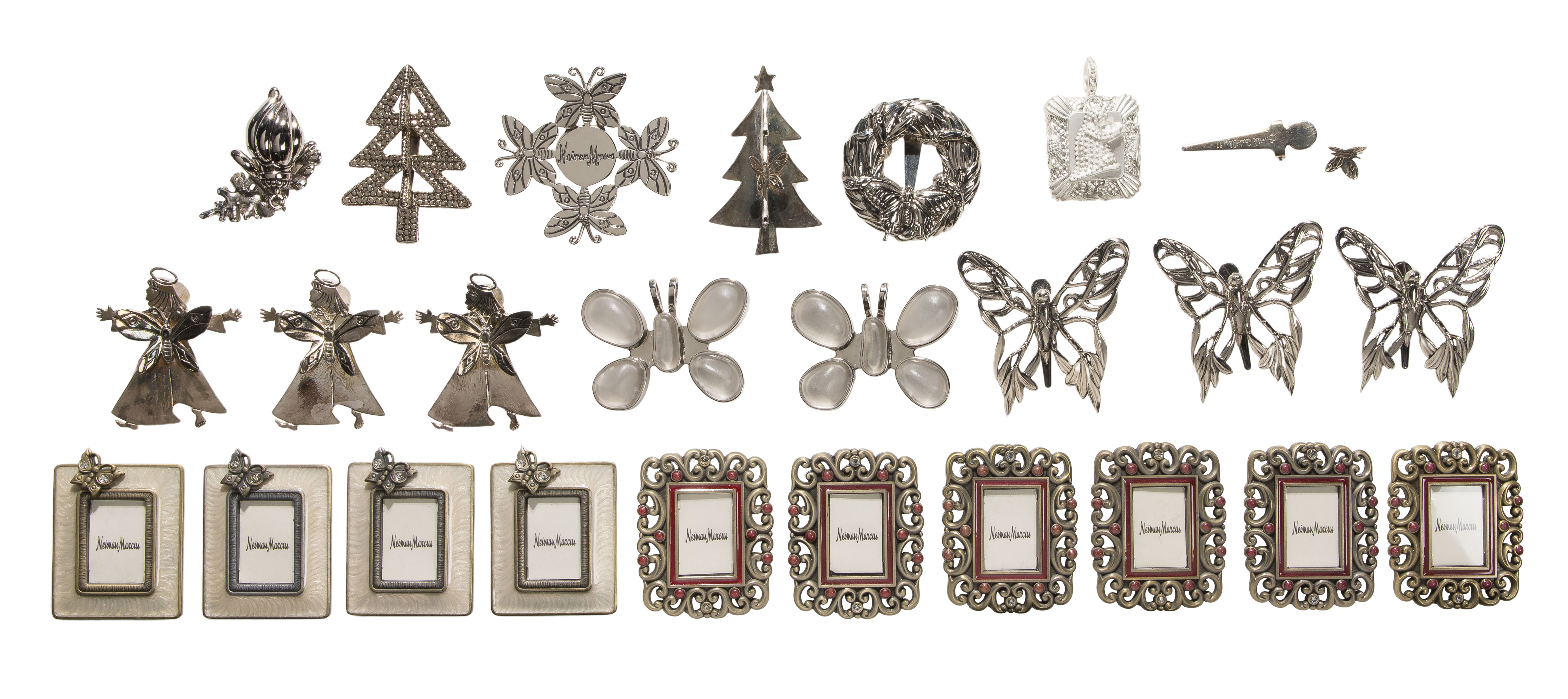 (24) items, mostly clips incorporating a butterfly motif, including (10) miniature picture frames retaining Neiman Marcus printed inserts, a Neiman Marcus butterfly clip, (3) butterfly clips, (2) butterfly pendants, (3) angels having butterfly wings, a wreath having butterfly and (2) Christmas trees (one having attached butterflies), as well as (2) pendants, some having crystals, all marked