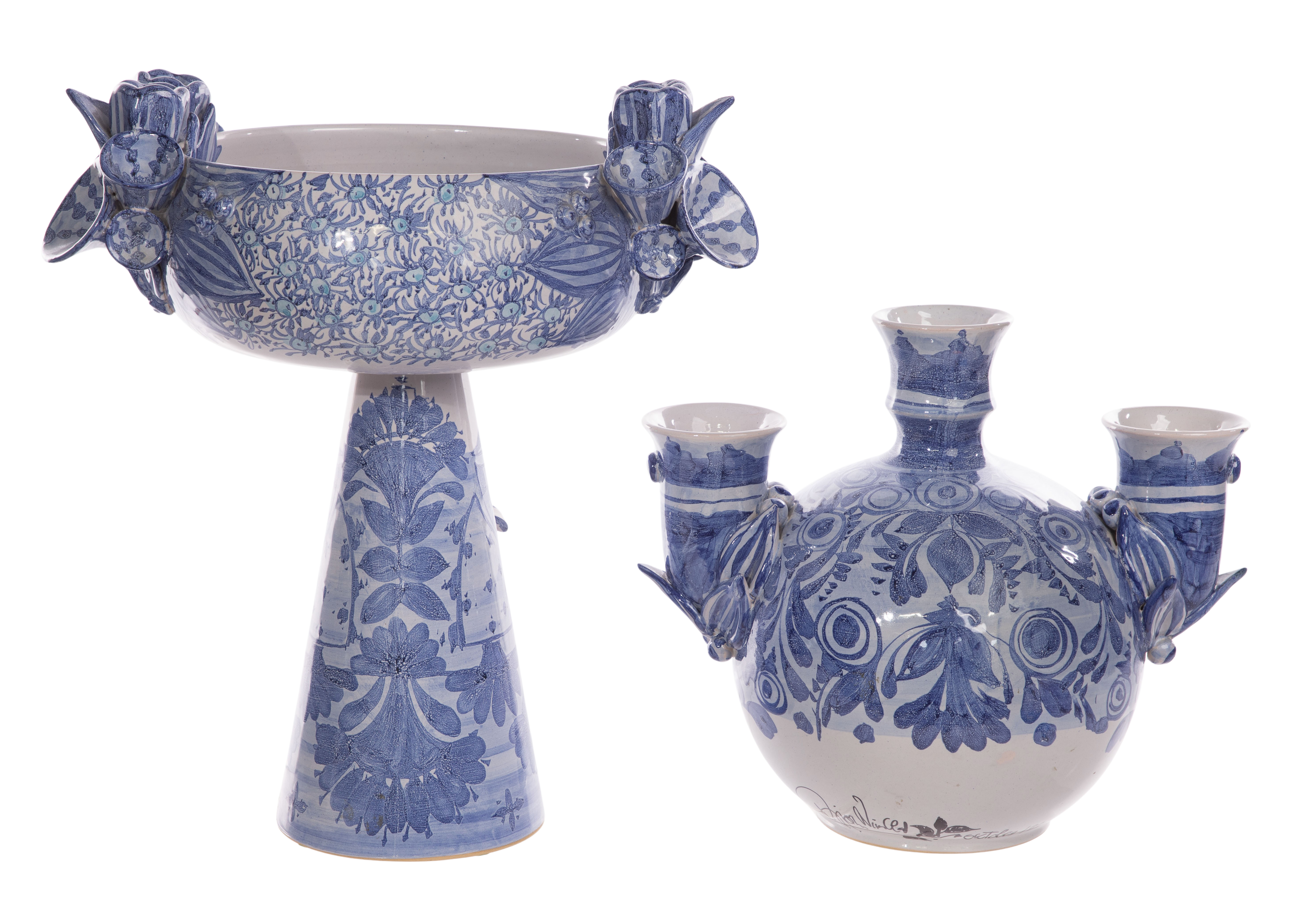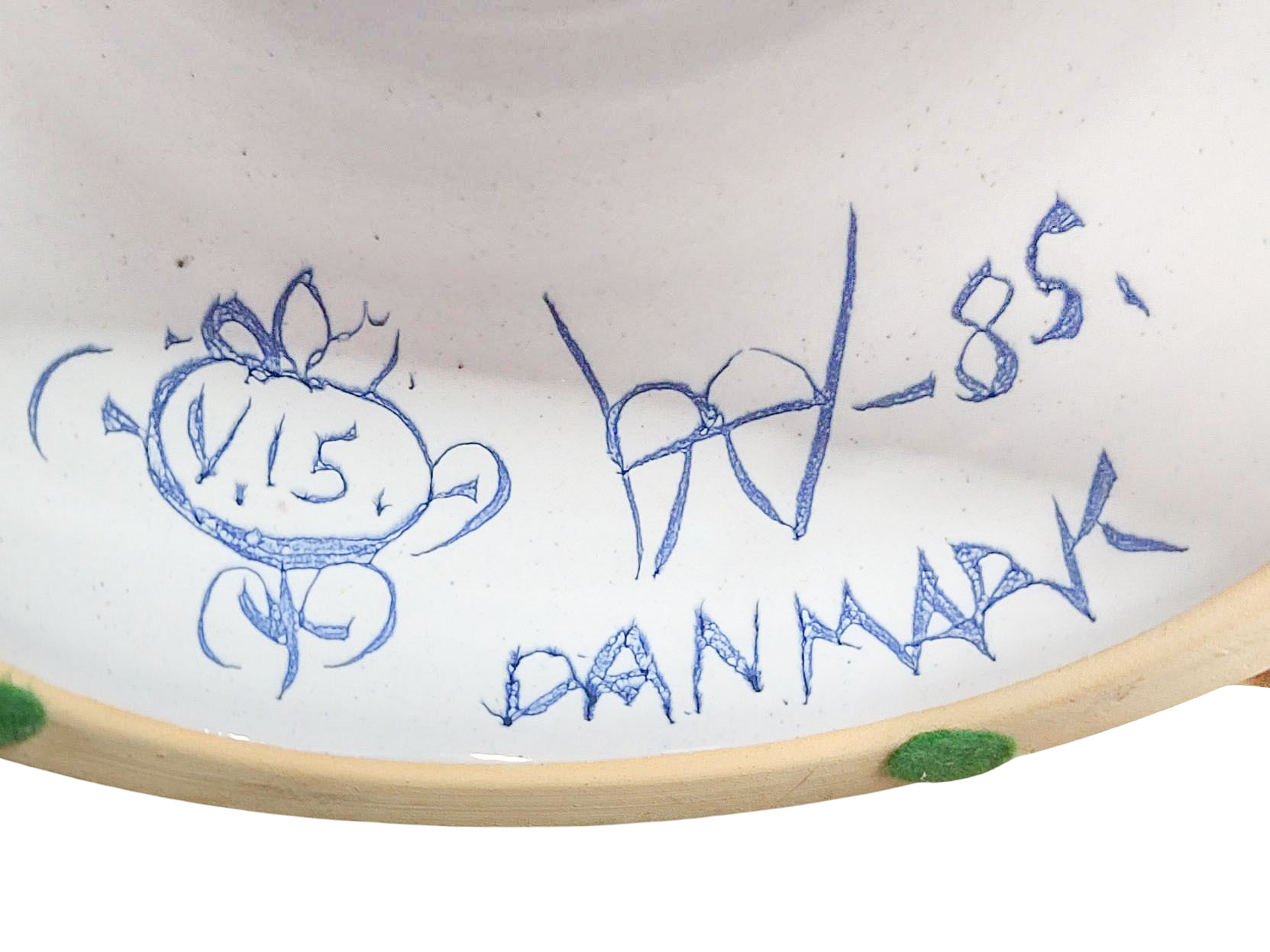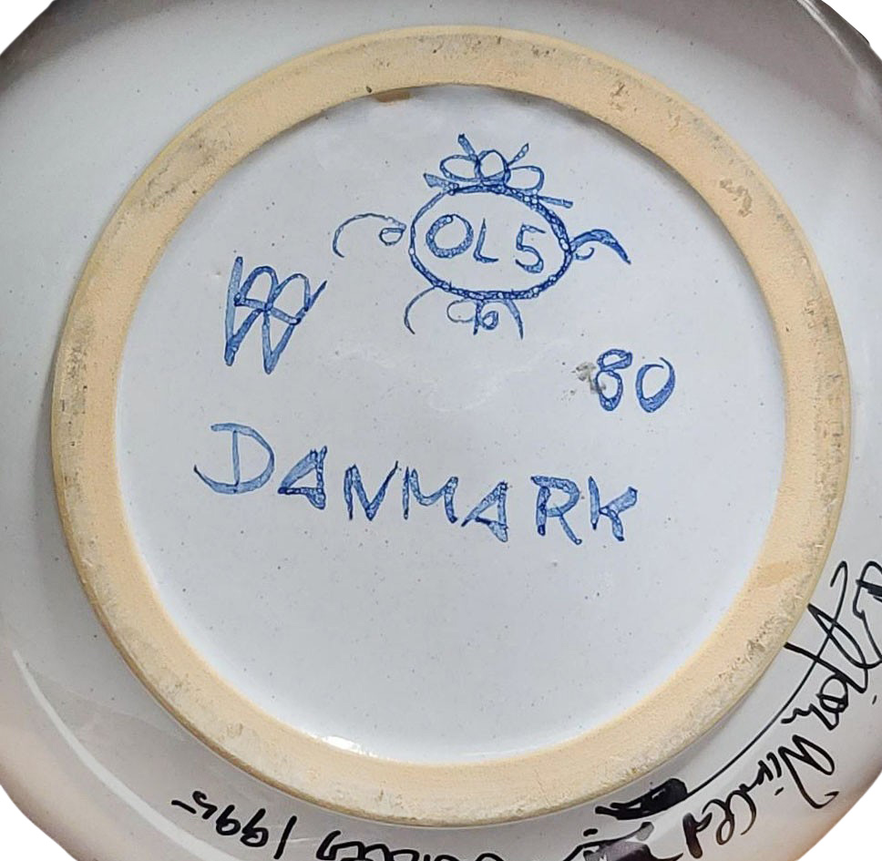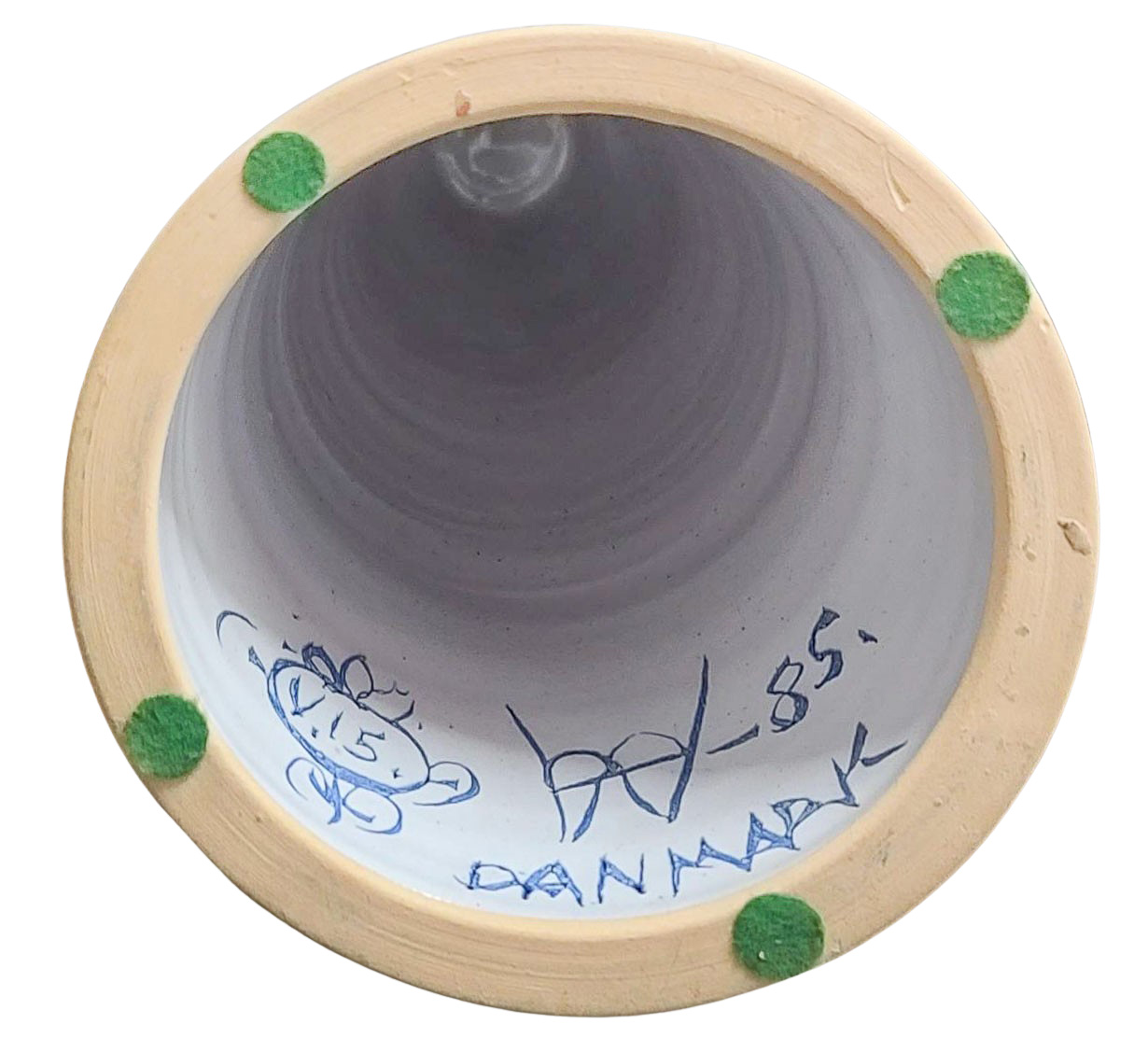 (2) items including a vase / candle holder having three openings and a centerpiece bowl, each hand painted and figural, signed and dated to undersides, stylized monogram ‘W DANMARK’, candle holder having artist signature verso