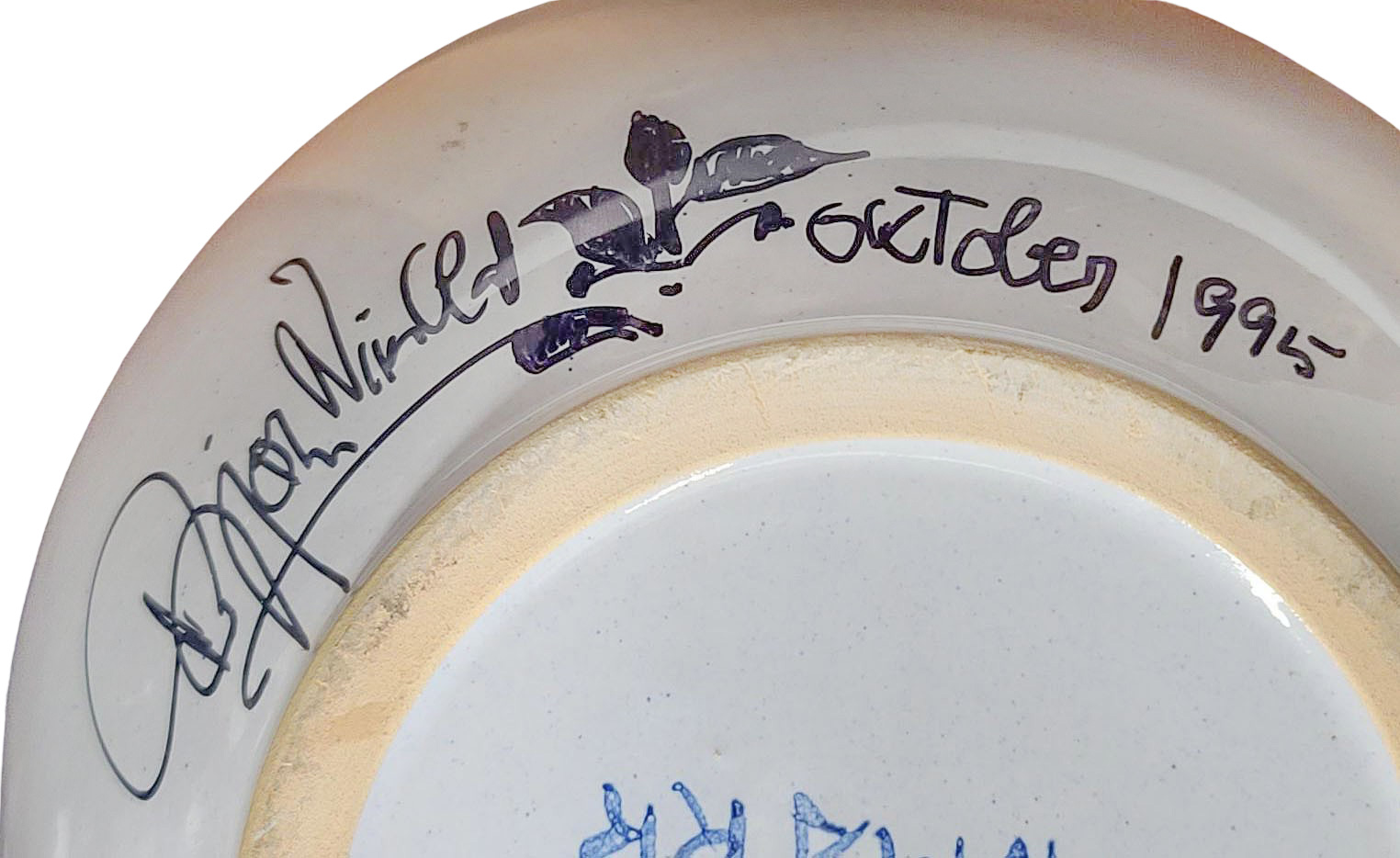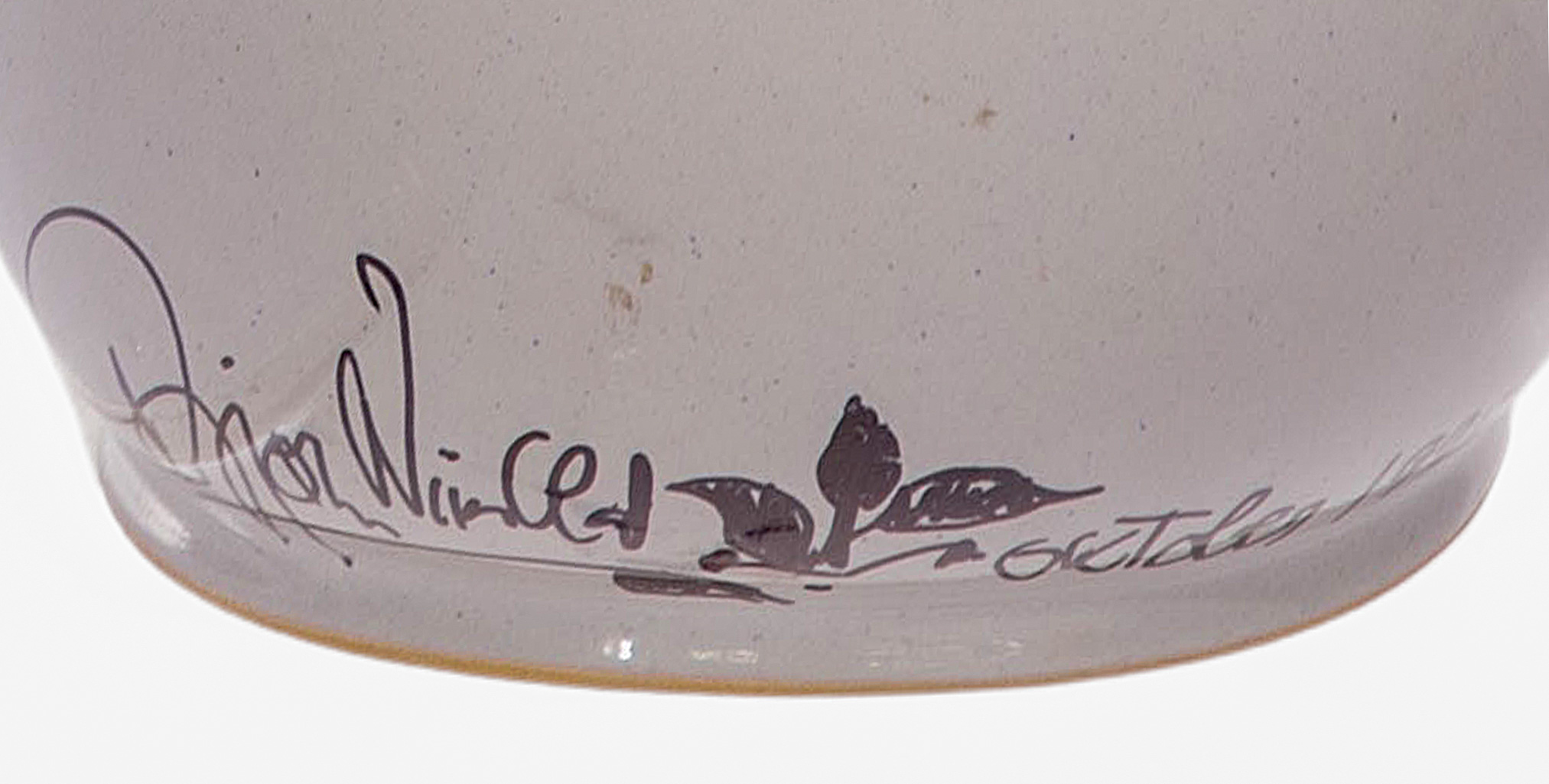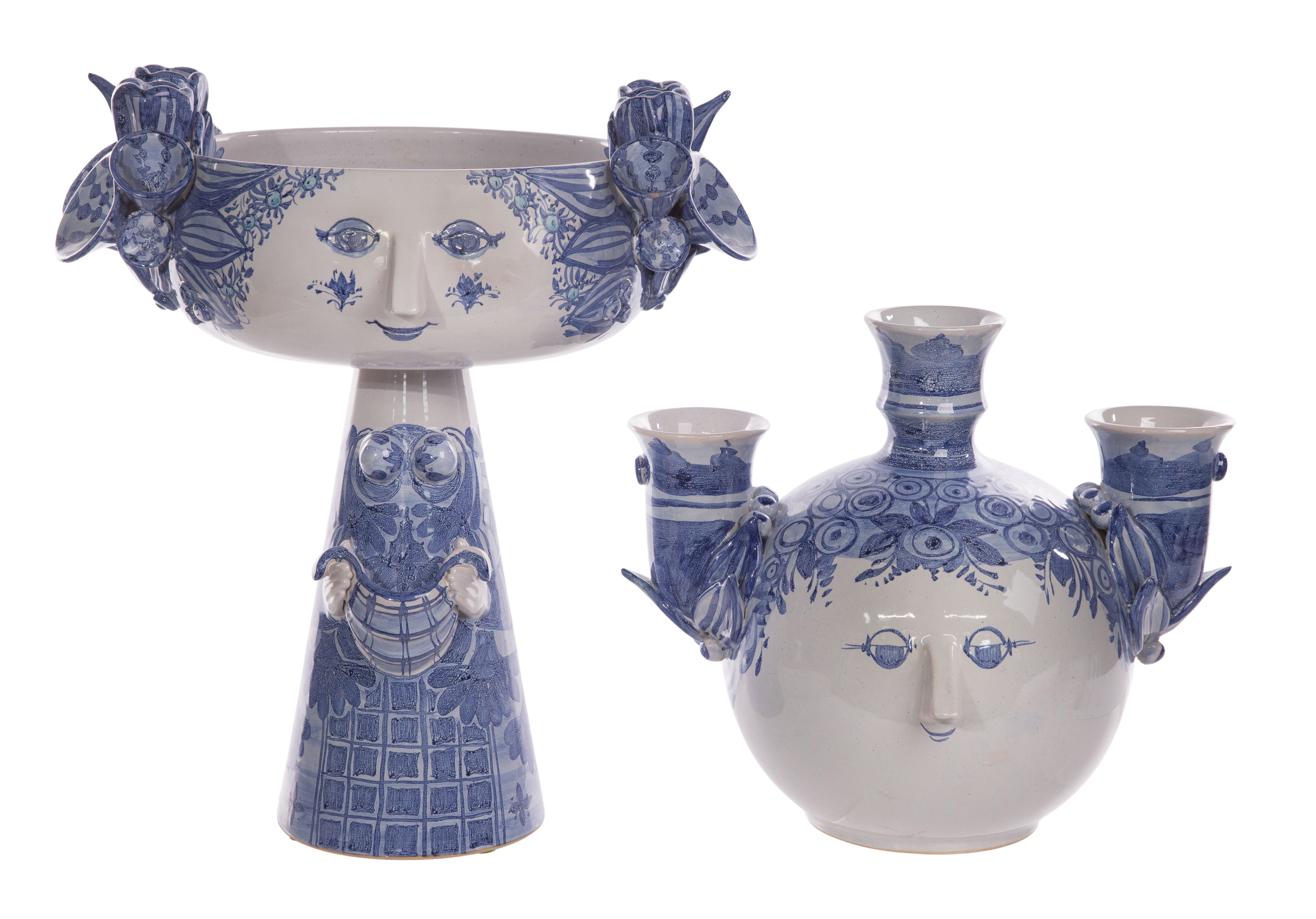 (2) items including a vase / candle holder having three openings and a centerpiece bowl, each hand painted and figural, signed and dated to undersides, stylized monogram ‘W DANMARK’, candle holder having artist signature verso