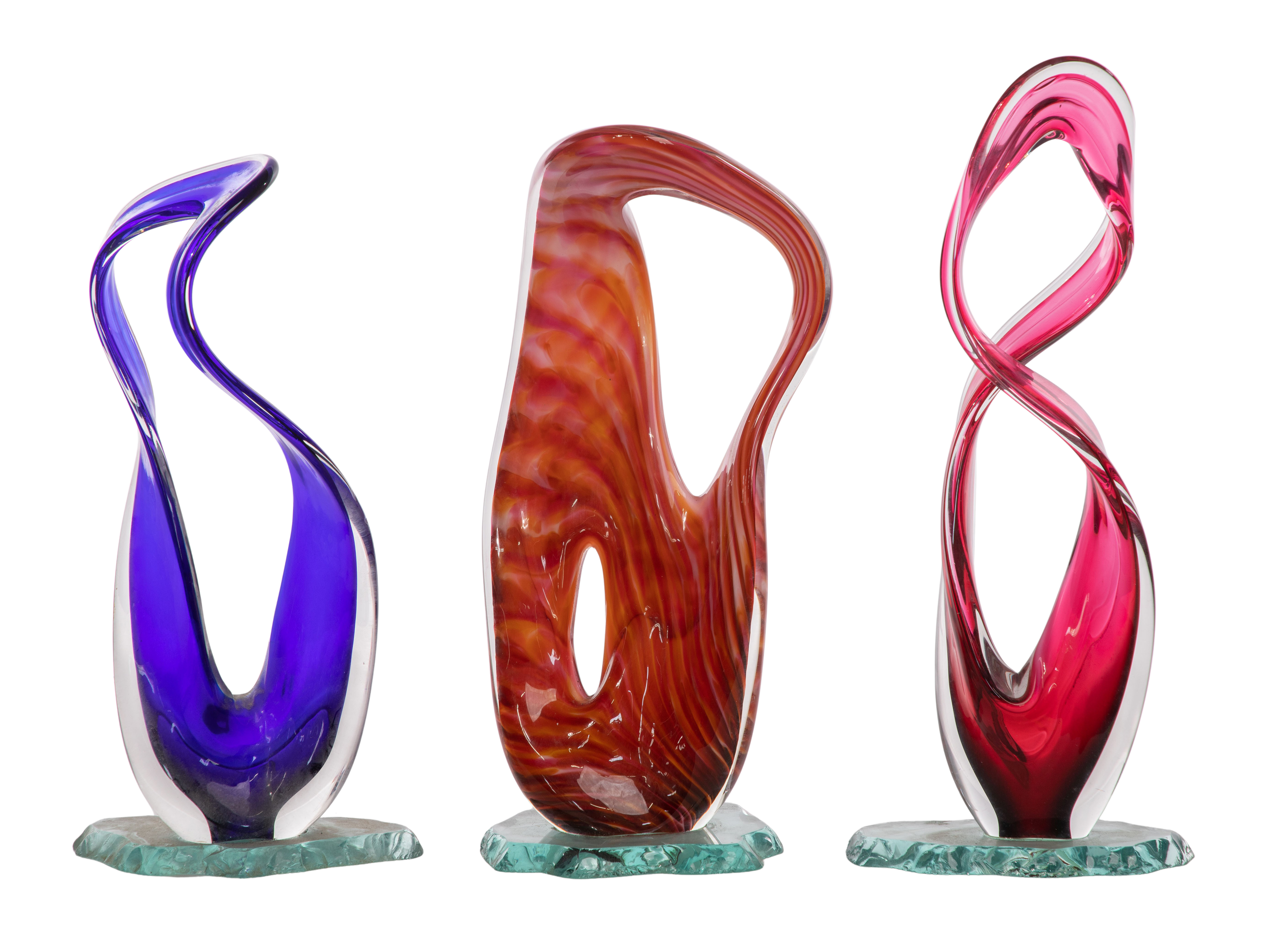 (3) items, each having a twisting design and color ribbons through centers, on a cracked edge clear base