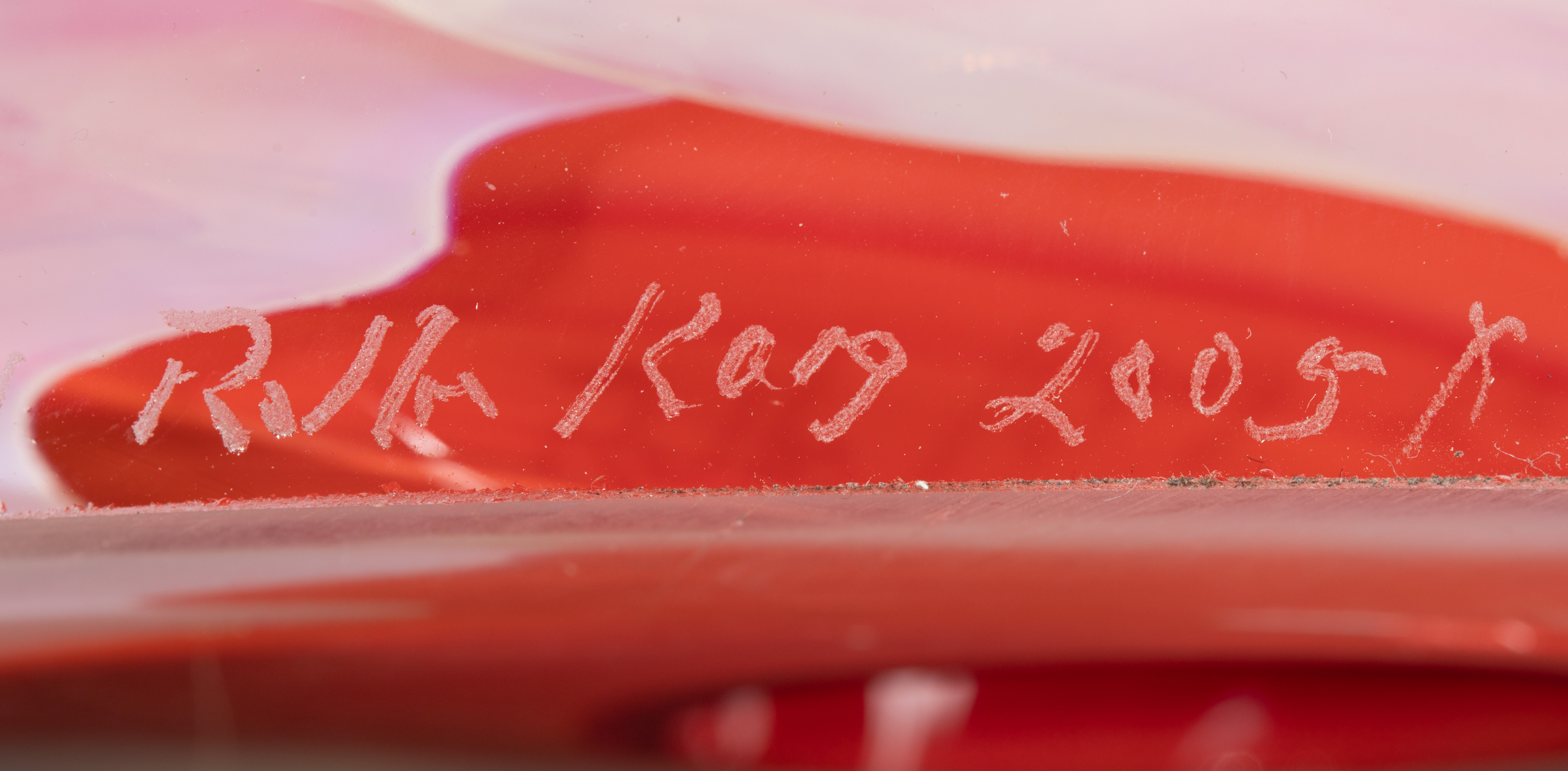 2005, etched signature, elongated tripart form having red and dichroic elements encased within clear glass