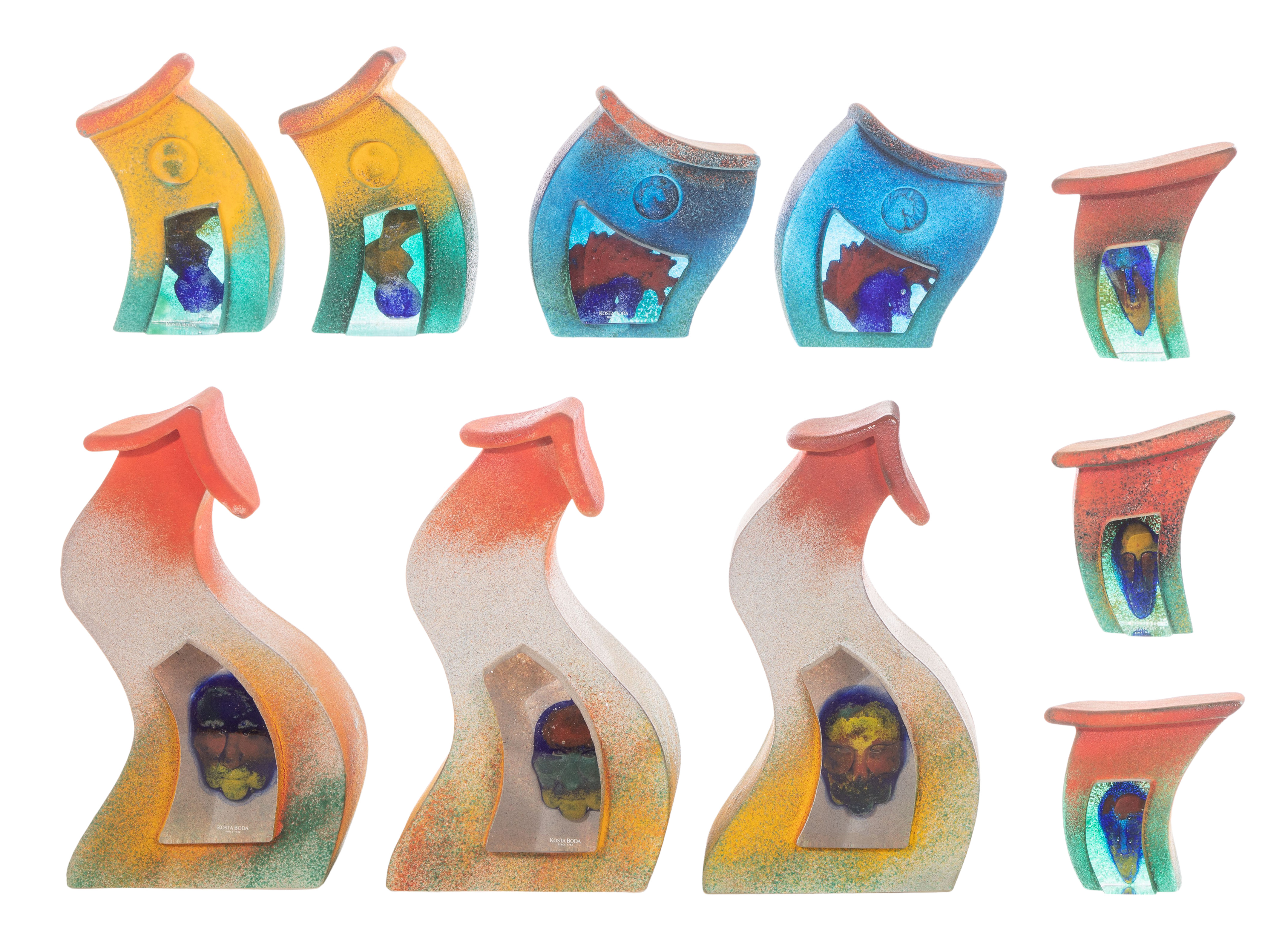 (10) items, all of matte, sand textured glass having transitioning hues, distorted building form having widows within which can be seen abstract faces and forms, engraved marks underside, many retaining Kosta Boda labels
